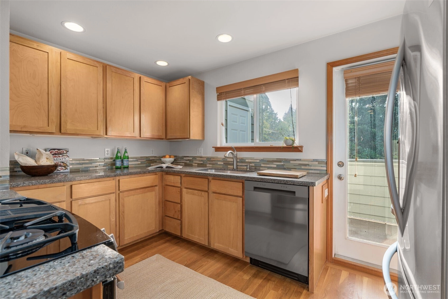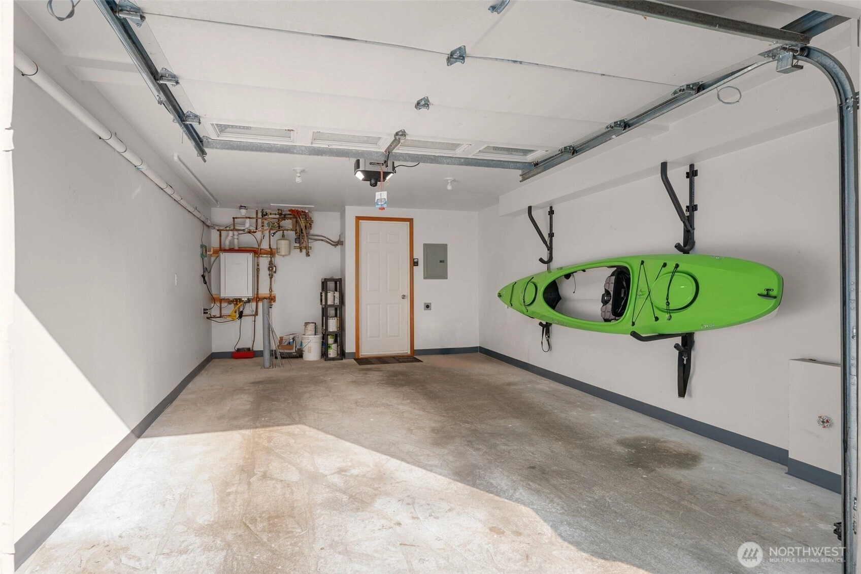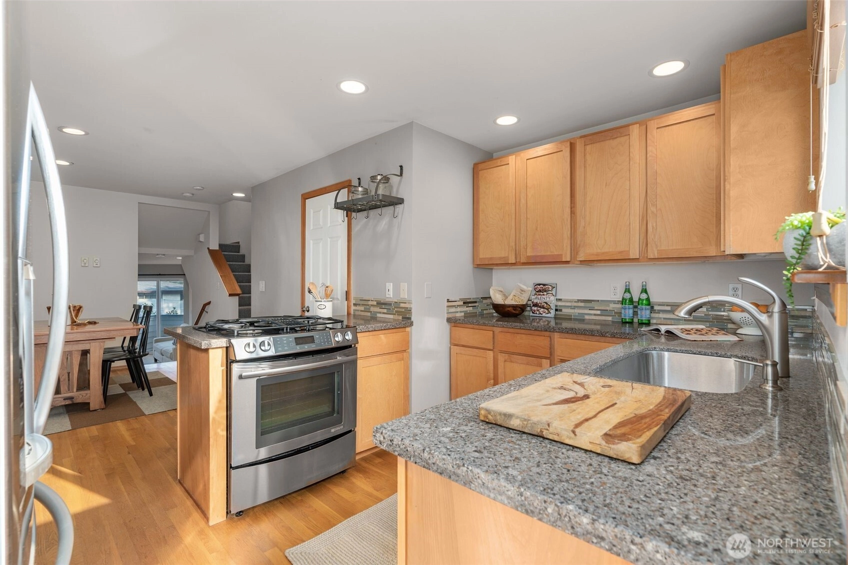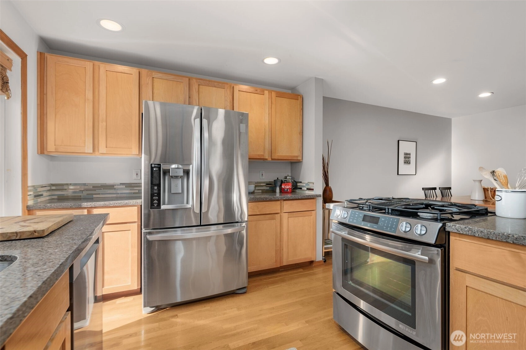 Built in the golden age when they used real wood flooring & trim and designed enormous, flexible floorplans. View of Bitter Lake, just a few blocks away (kayaking!). Slab counters & gas cooking in the kitchen (w/grilling deck). Dining area holds a huge table. Generous living room w/gas fireplace & view balcony. Top flr primary suite w/5-piece bthrm. Second bdrm has lake view. Ground-level bdrm has bthrm & exterior access (for guests/roommates). Tons of storage. A bathroom on each level. New exterior paint, tankless h/w, flooring, fencing and EV charging port. Fenced garden/yard. One-car garage. Hop the bus to light rail (Pinehurst station coming 2026!). Mins to Trader Joe's, Town & Country, bike paths, trails, pickleball & more. No HOA/dues