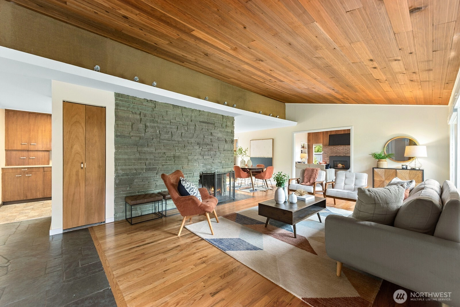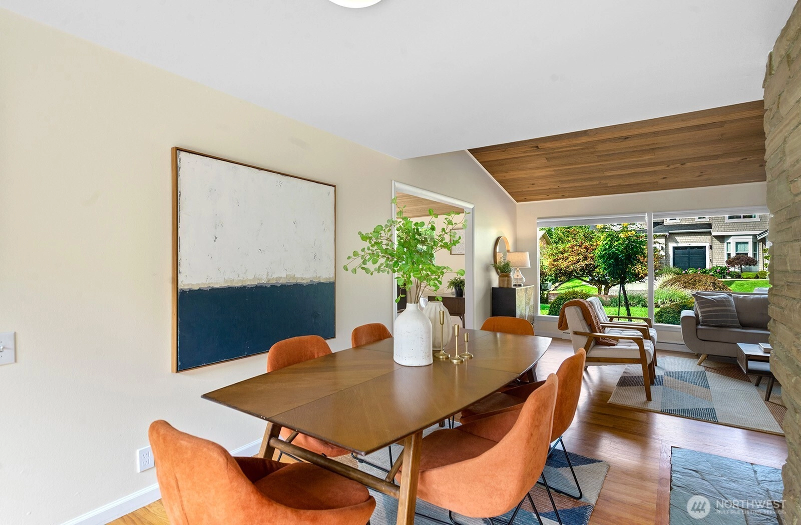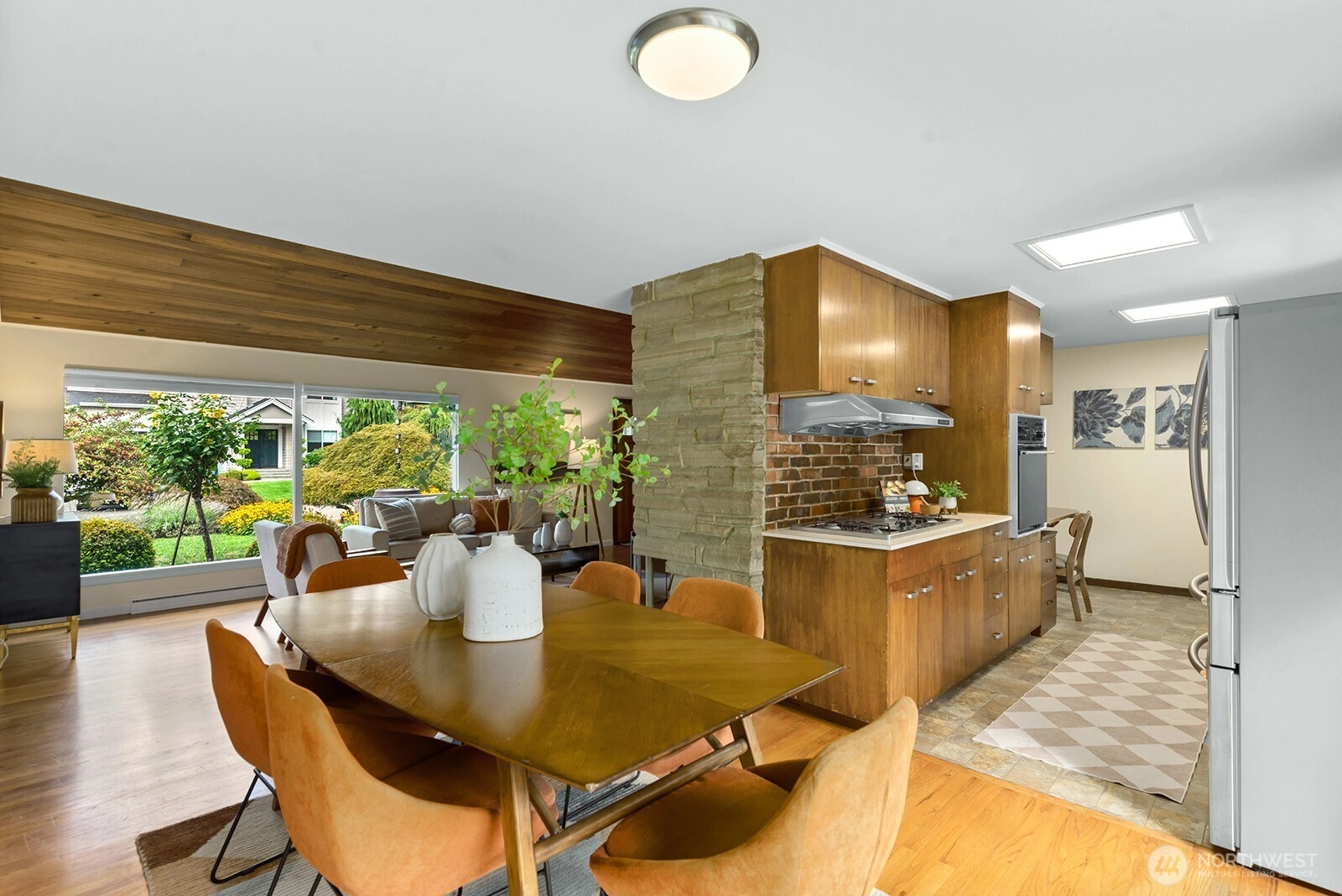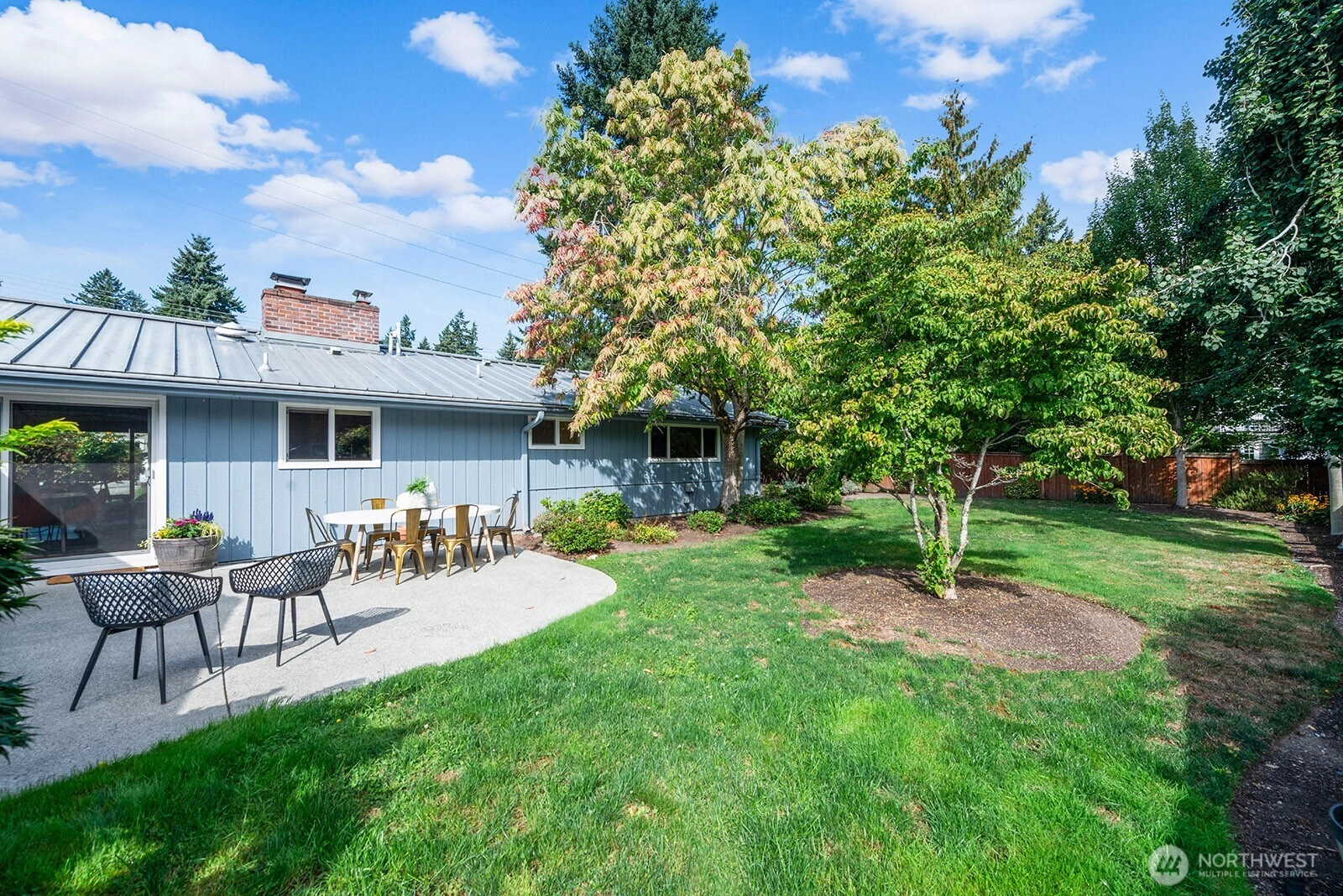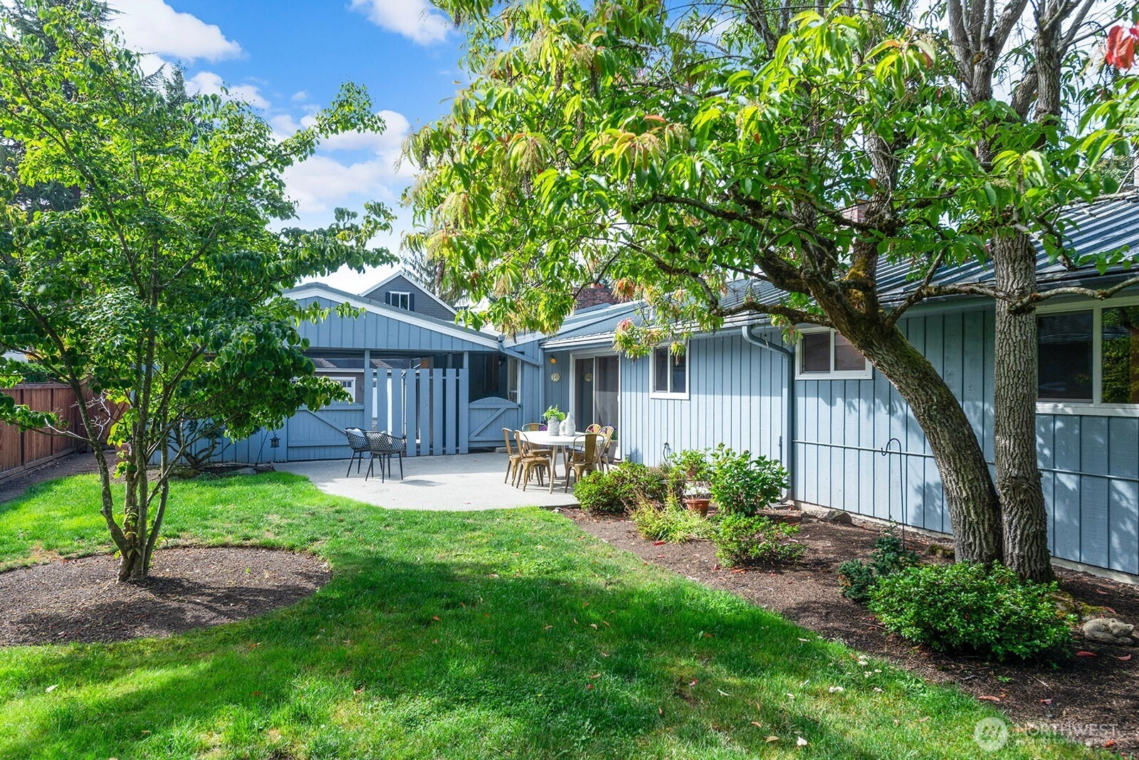 Stunning mid-century home situated on a level, private lot on desirable street in Enatai. The open floor plan features a spacious bonus room seamlessly connected to the main living areas. The exquisite primary bath remodel boasts a luxurious steam shower, heated floors, and dual vanities. A powder room conveniently serves the entertaining spaces. Enjoy the ease of single-level living, complete with central air conditioning, a durable metal roof, walk-in pantry, and gleaming hardwood floors. Two private patios extend the living space outdoors. An attached workshop and storage area, not included in the square footage, add versatility. A short walk to the beach, coveted Enatai Elementary school and several neighborhood parks.