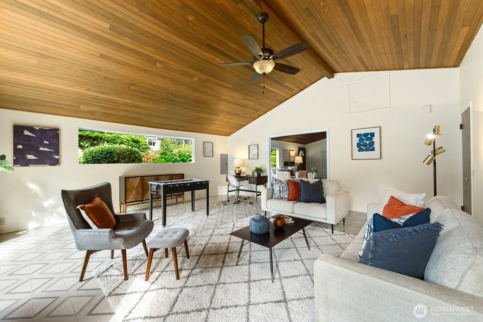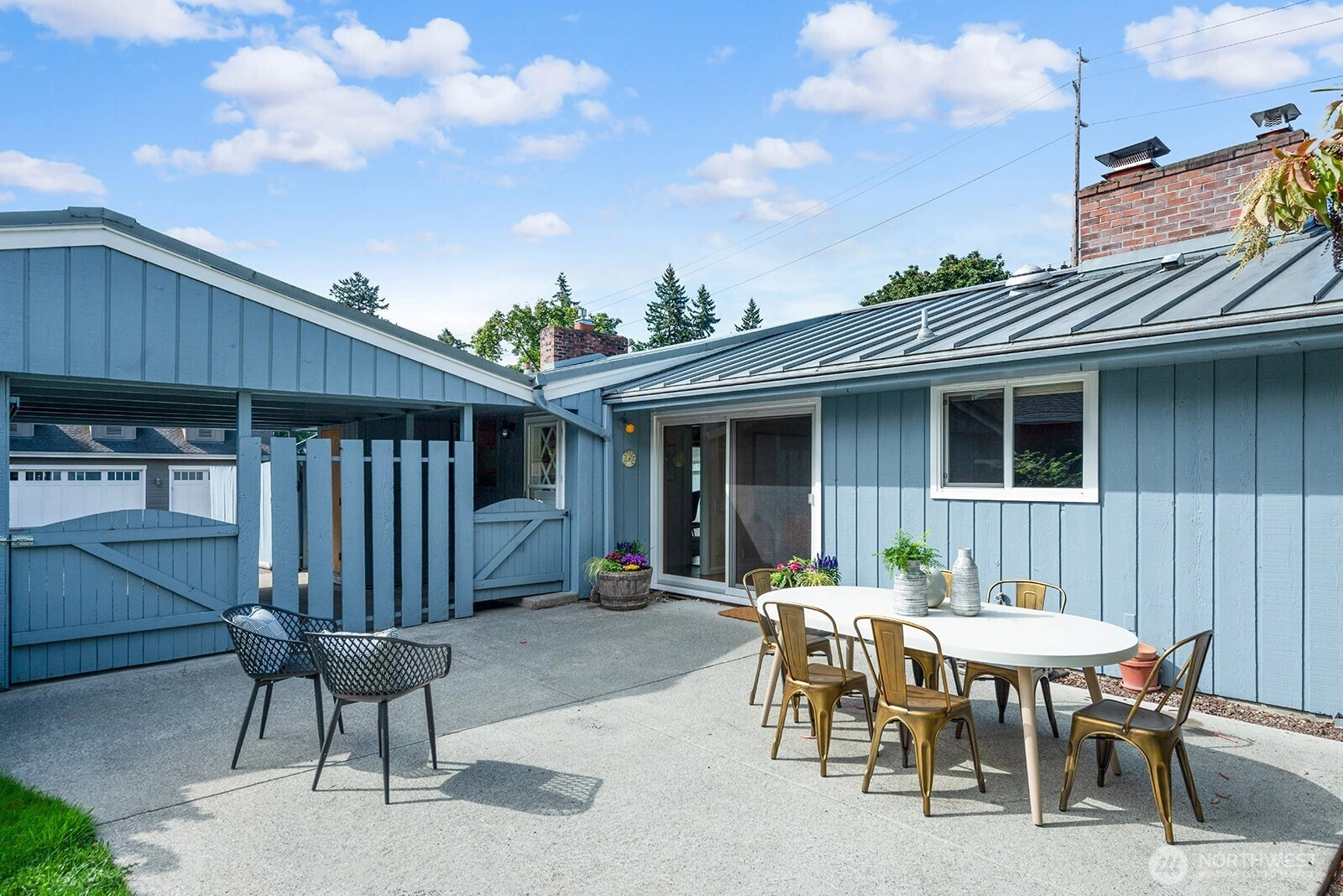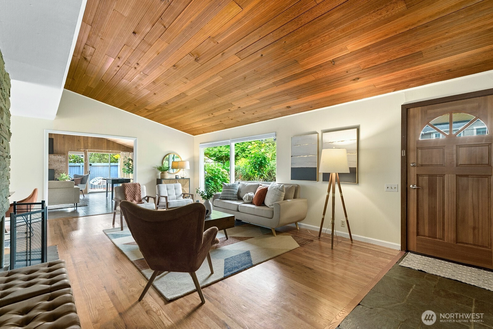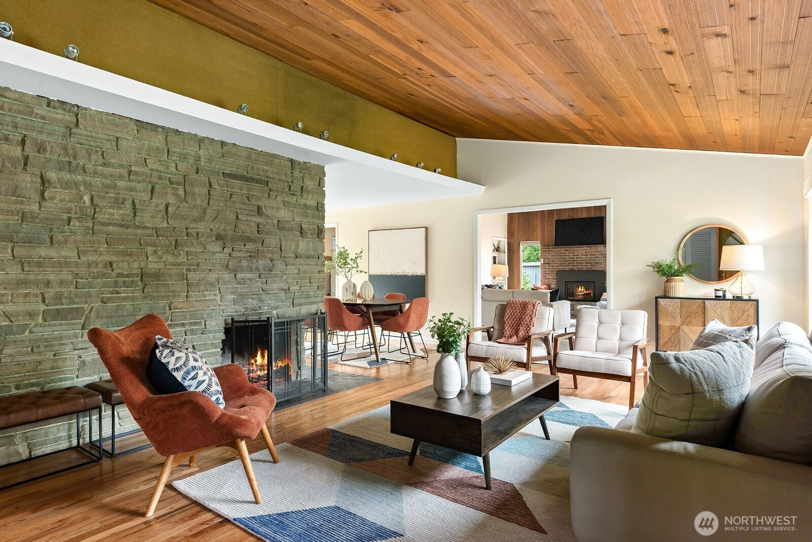 Stunning mid-century home situated on a level, private lot on desirable street in Enatai. The open floor plan features a spacious bonus room seamlessly connected to the main living areas. The exquisite primary bath remodel boasts a luxurious steam shower, heated floors, and dual vanities. A powder room conveniently serves the entertaining spaces. Enjoy the ease of single-level living, complete with central air conditioning, a durable metal roof, walk-in pantry, and gleaming hardwood floors. Two private patios extend the living space outdoors. An attached workshop and storage area, not included in the square footage, add versatility. A short walk to the beach, coveted Enatai Elementary school and several neighborhood parks.
