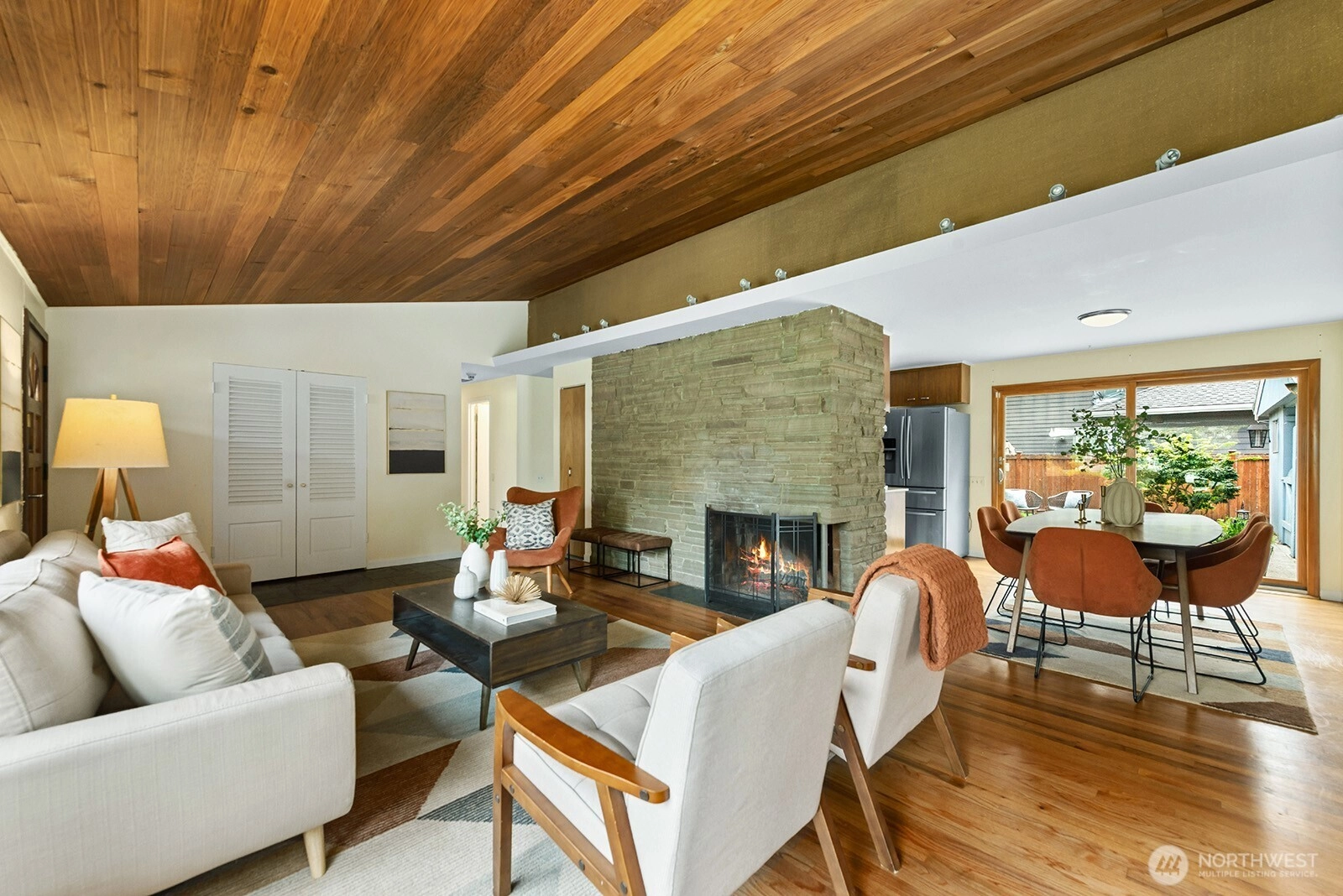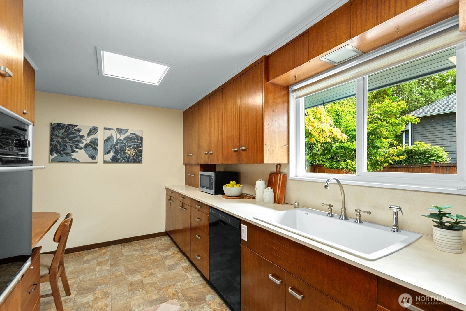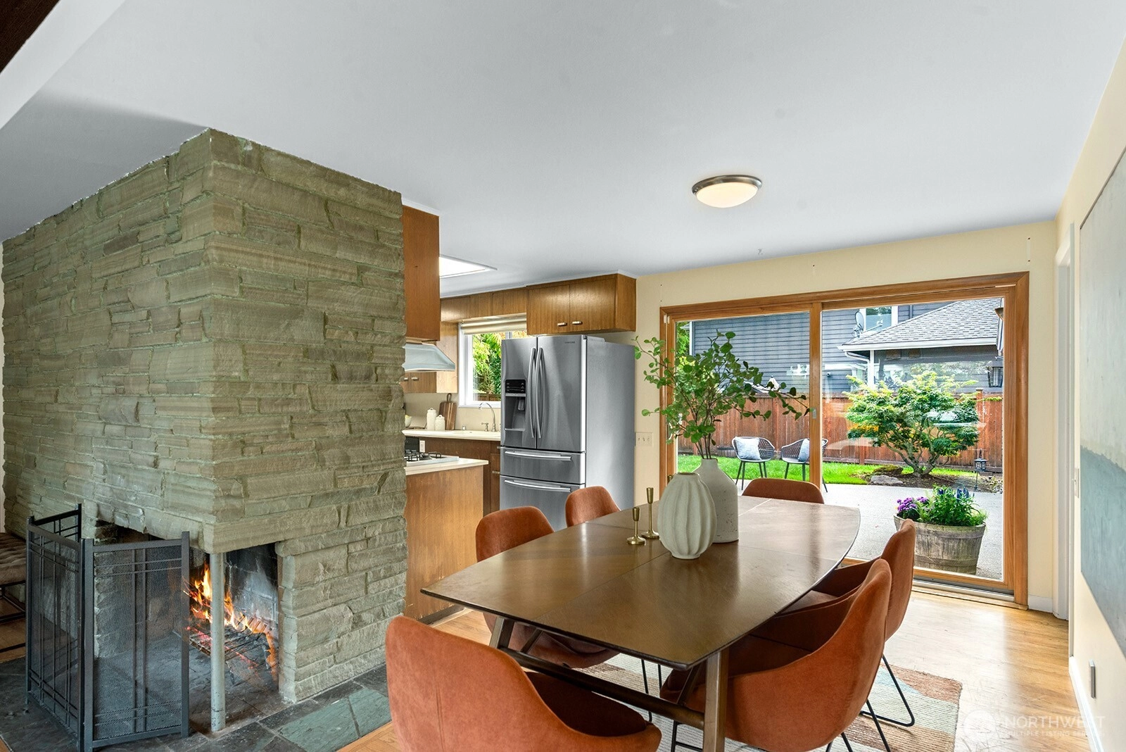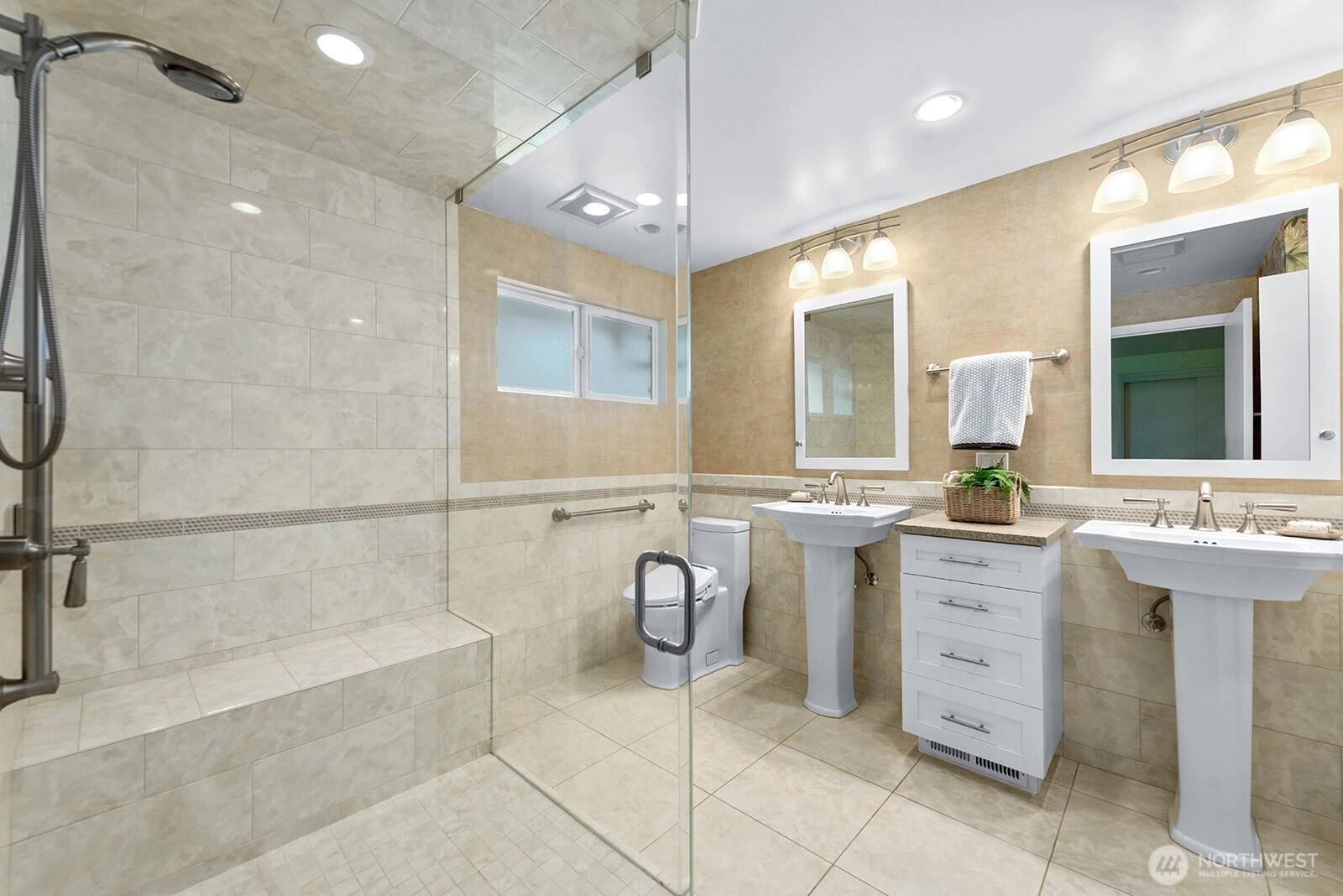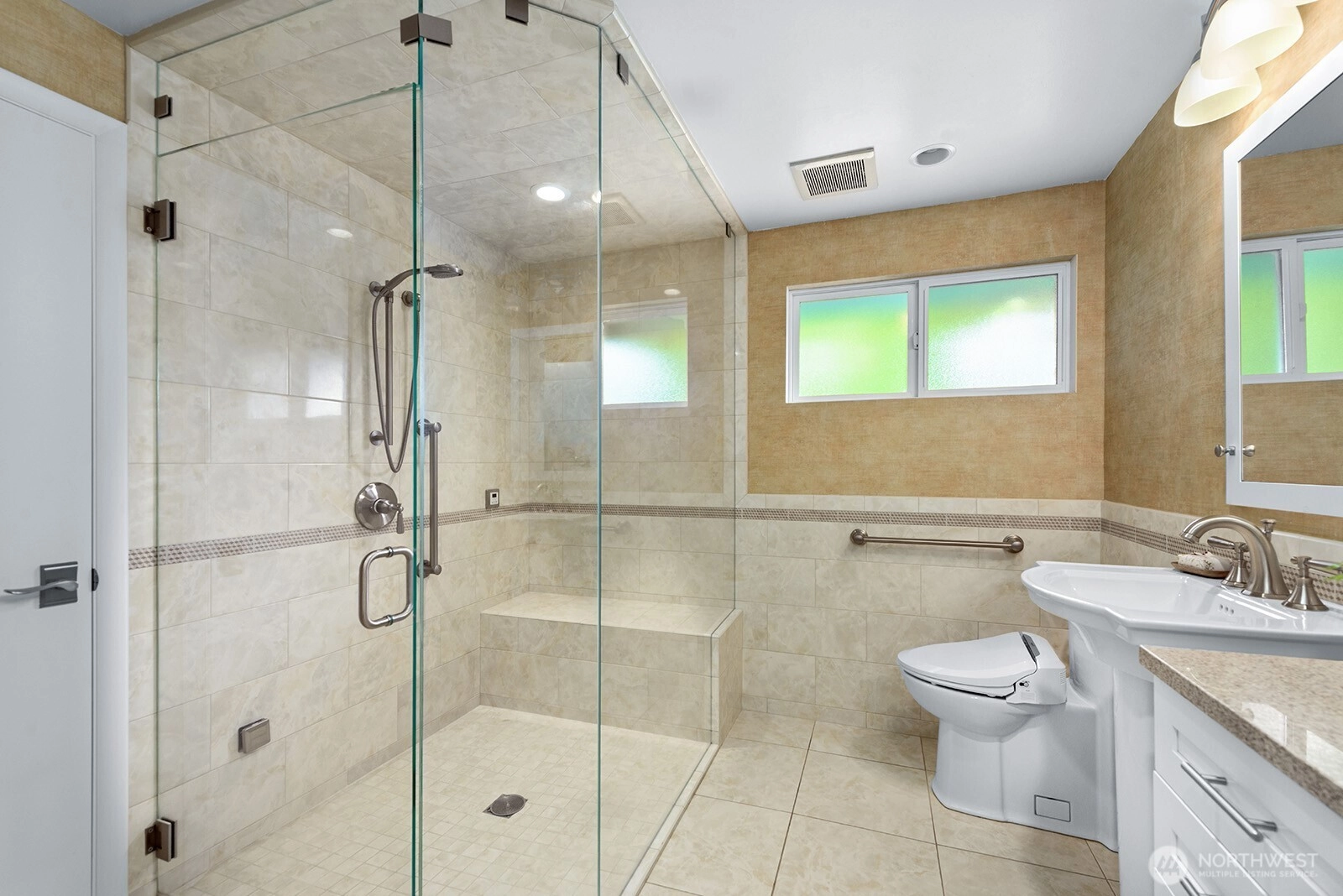 Stunning mid-century home situated on a level, private lot on desirable street in Enatai. The open floor plan features a spacious bonus room seamlessly connected to the main living areas. The exquisite primary bath remodel boasts a luxurious steam shower, heated floors, and dual vanities. A powder room conveniently serves the entertaining spaces. Enjoy the ease of single-level living, complete with central air conditioning, a durable metal roof, walk-in pantry, and gleaming hardwood floors. Two private patios extend the living space outdoors. An attached workshop and storage area, not included in the square footage, add versatility. A short walk to the beach, coveted Enatai Elementary school and several neighborhood parks.