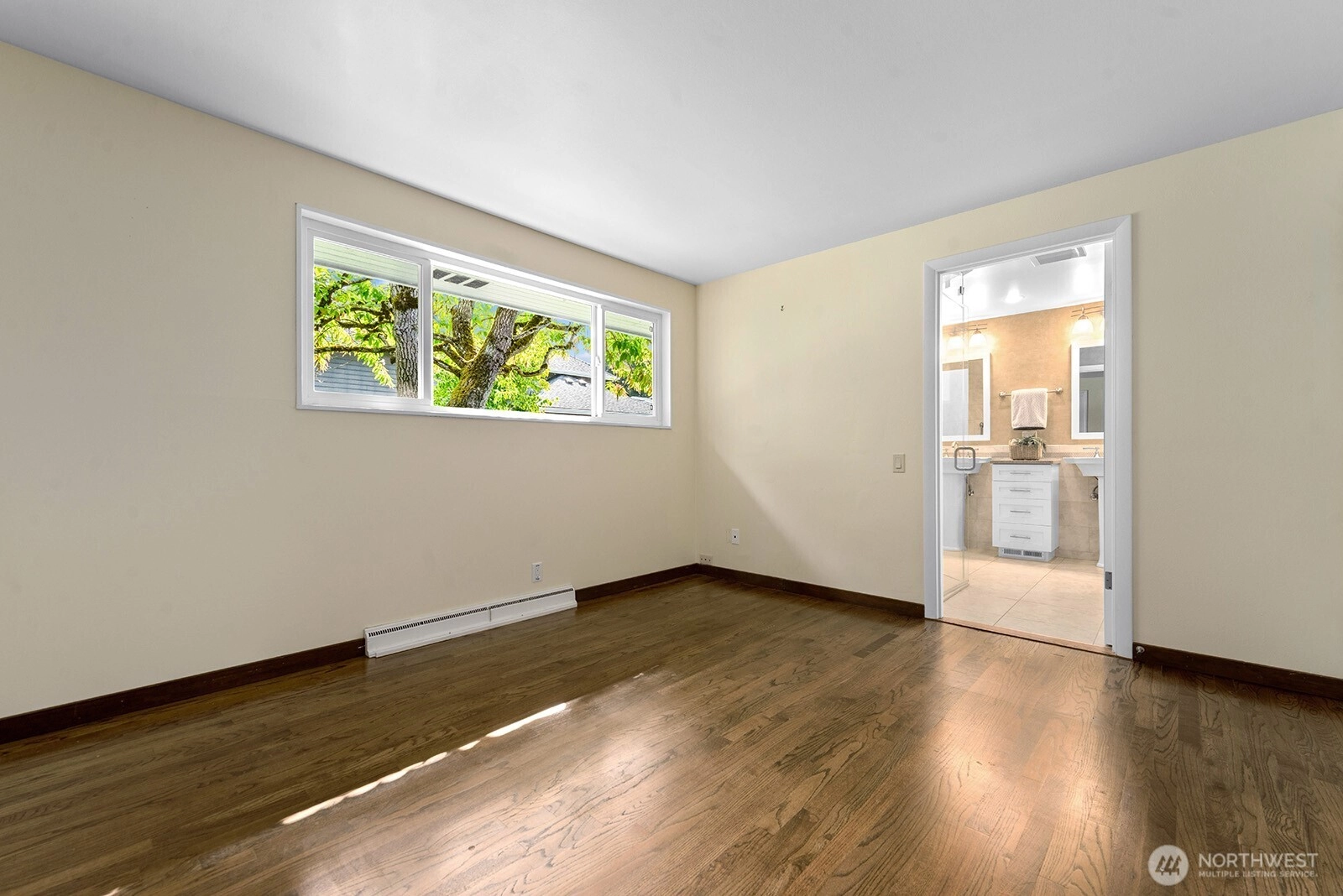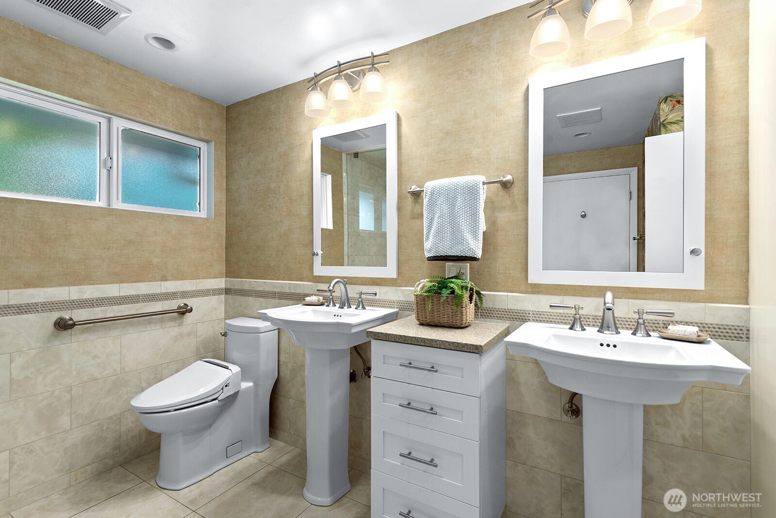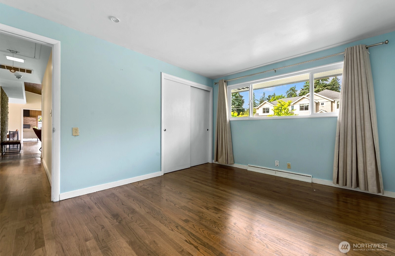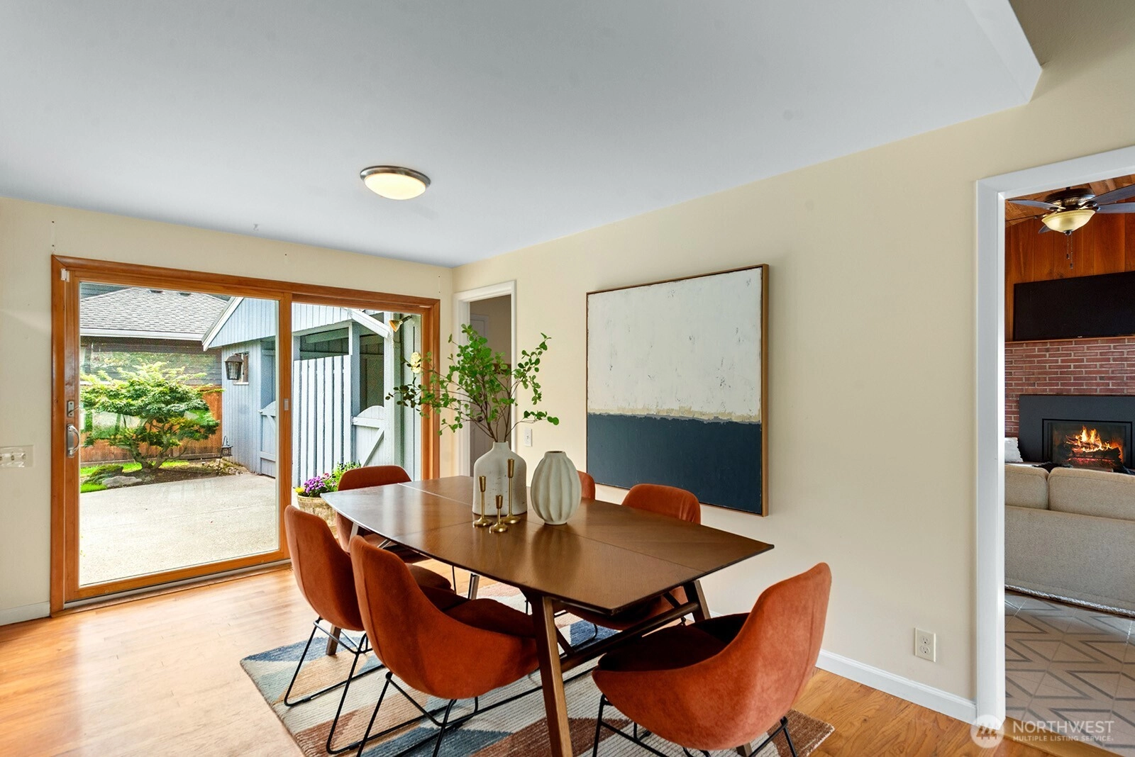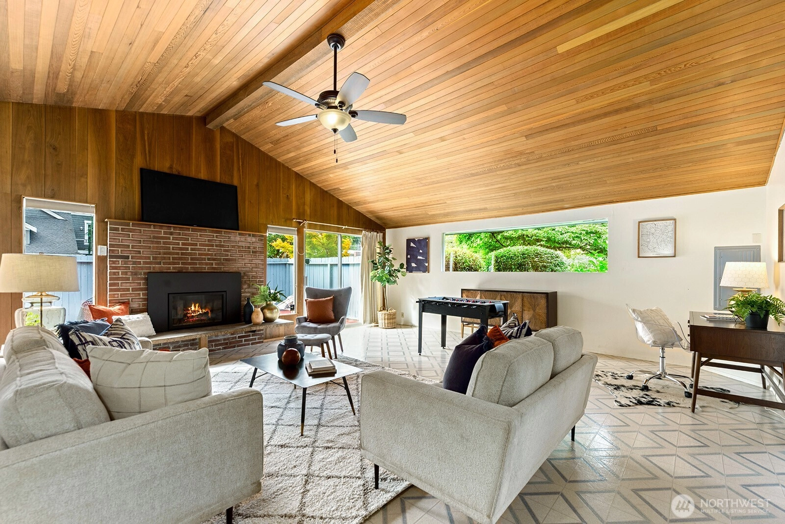 Stunning mid-century home situated on a level, private lot on desirable street in Enatai. The open floor plan features a spacious bonus room seamlessly connected to the main living areas. The exquisite primary bath remodel boasts a luxurious steam shower, heated floors, and dual vanities. A powder room conveniently serves the entertaining spaces. Enjoy the ease of single-level living, complete with central air conditioning, a durable metal roof, walk-in pantry, and gleaming hardwood floors. Two private patios extend the living space outdoors. An attached workshop and storage area, not included in the square footage, add versatility. A short walk to the beach, coveted Enatai Elementary school and several neighborhood parks.