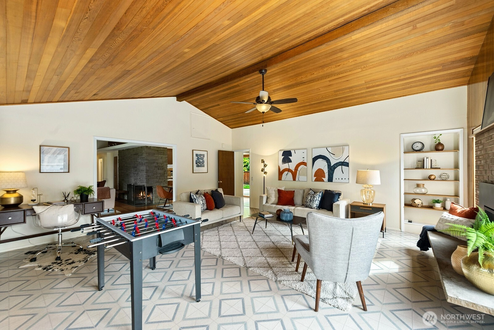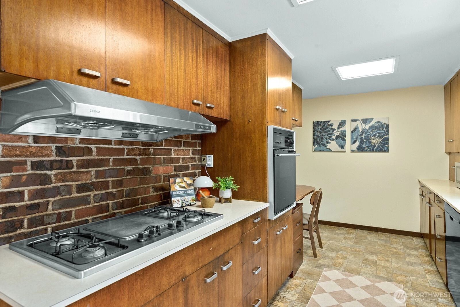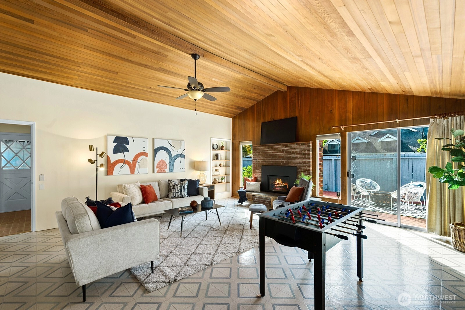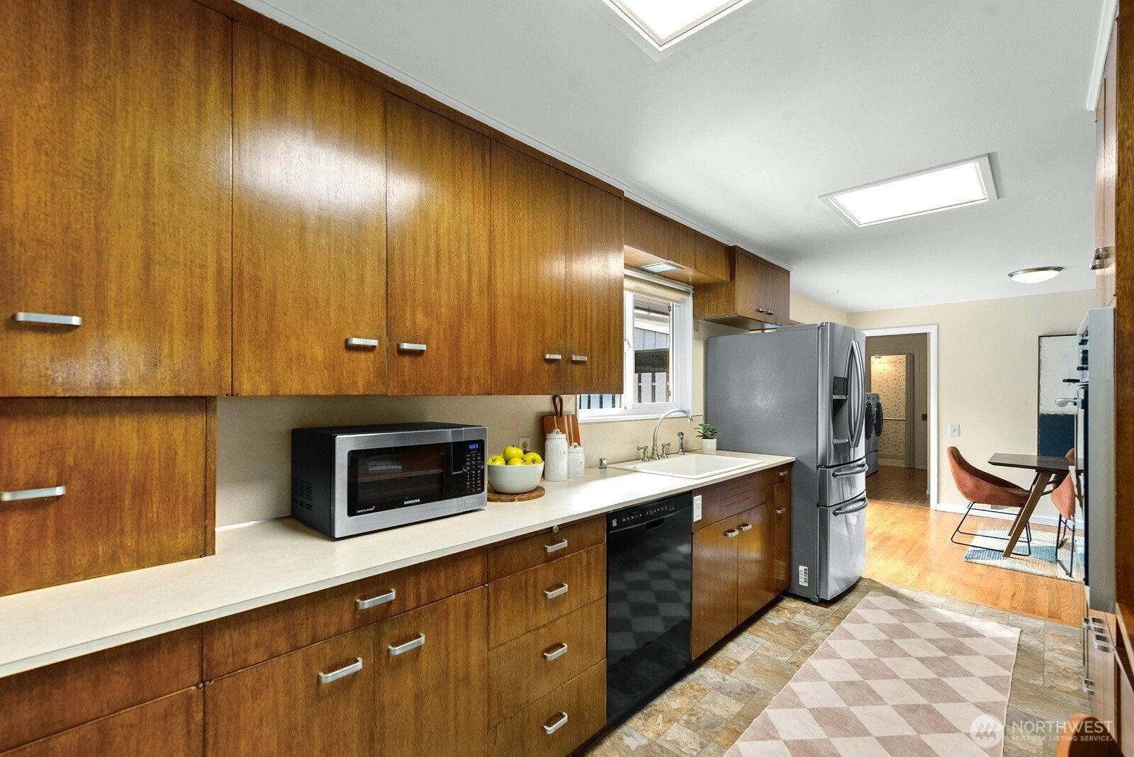 Stunning mid-century home situated on a level, private lot on desirable street in Enatai. The open floor plan features a spacious bonus room seamlessly connected to the main living areas. The exquisite primary bath remodel boasts a luxurious steam shower, heated floors, and dual vanities. A powder room conveniently serves the entertaining spaces. Enjoy the ease of single-level living, complete with central air conditioning, a durable metal roof, walk-in pantry, and gleaming hardwood floors. Two private patios extend the living space outdoors. An attached workshop and storage area, not included in the square footage, add versatility. A short walk to the beach, coveted Enatai Elementary school and several neighborhood parks.