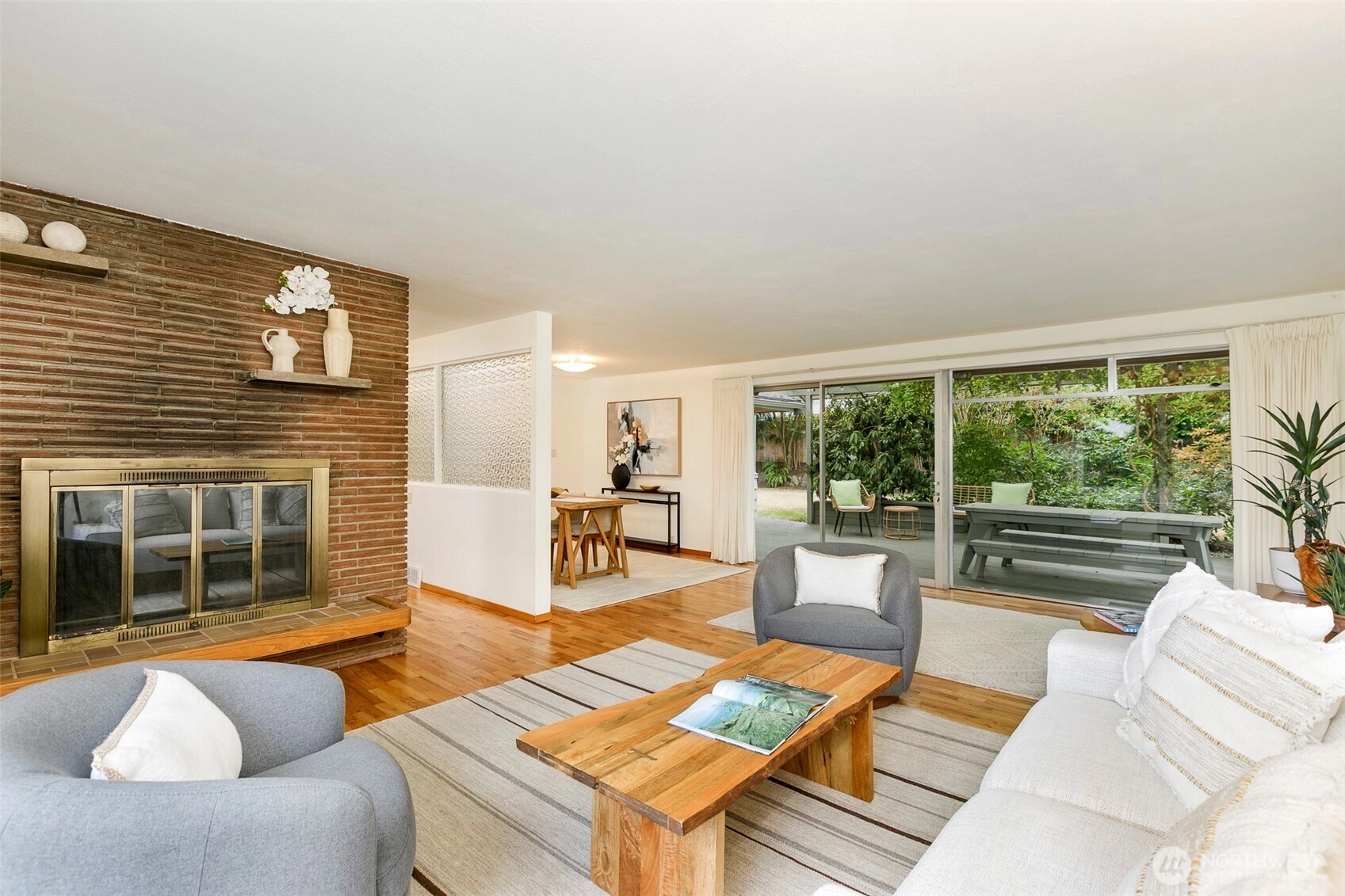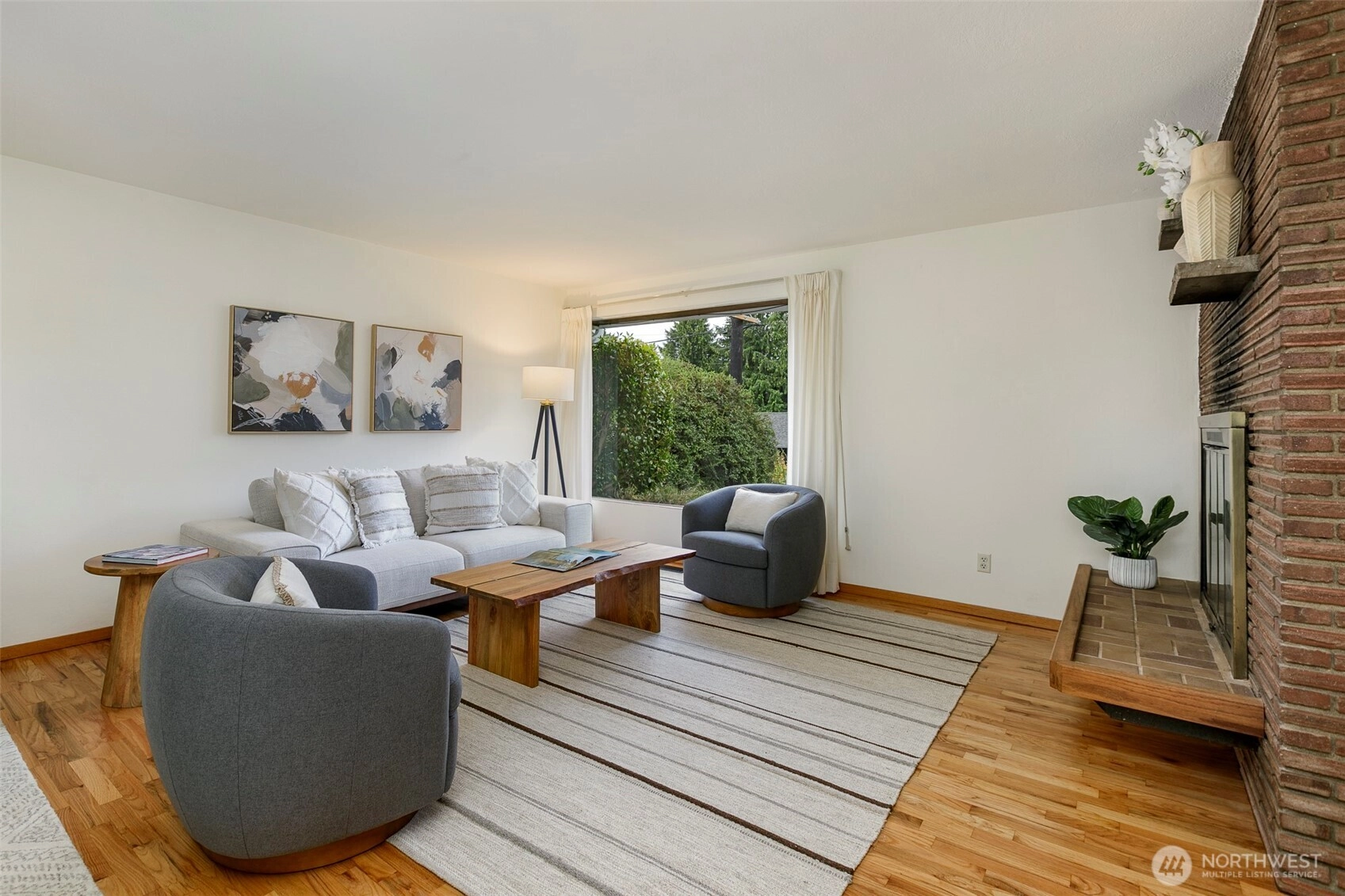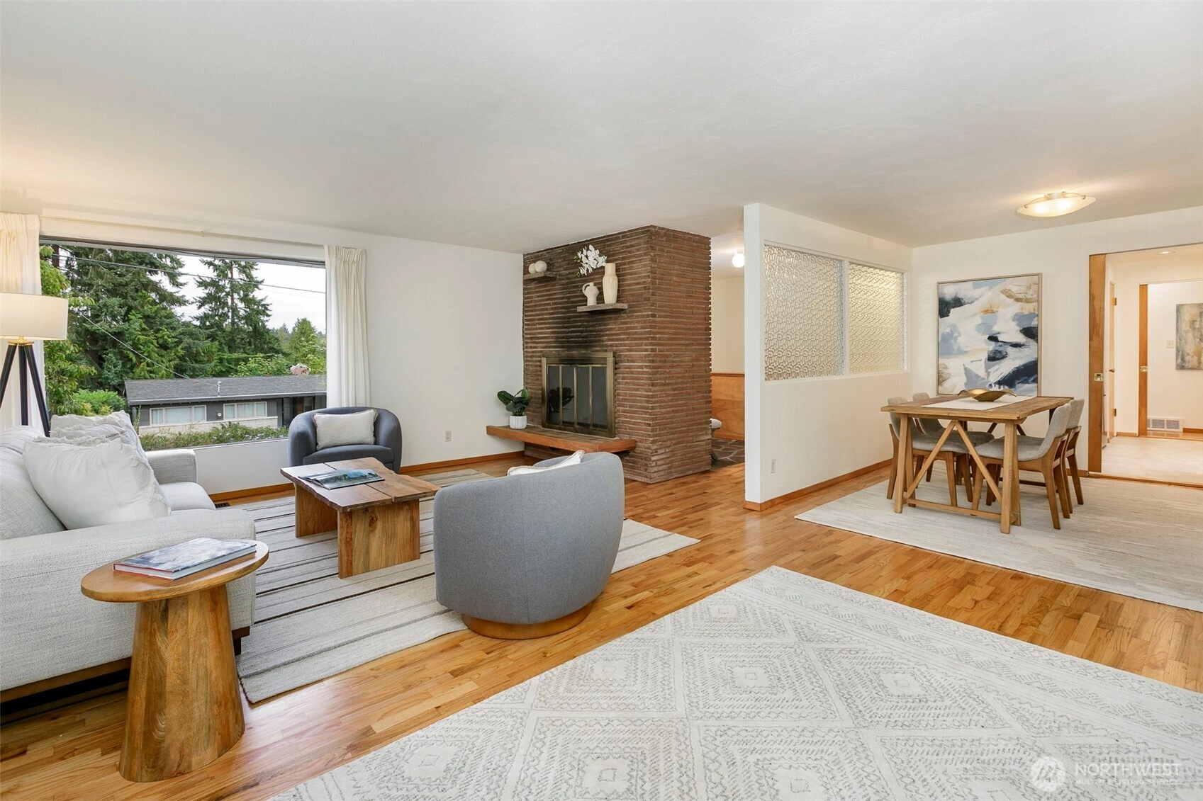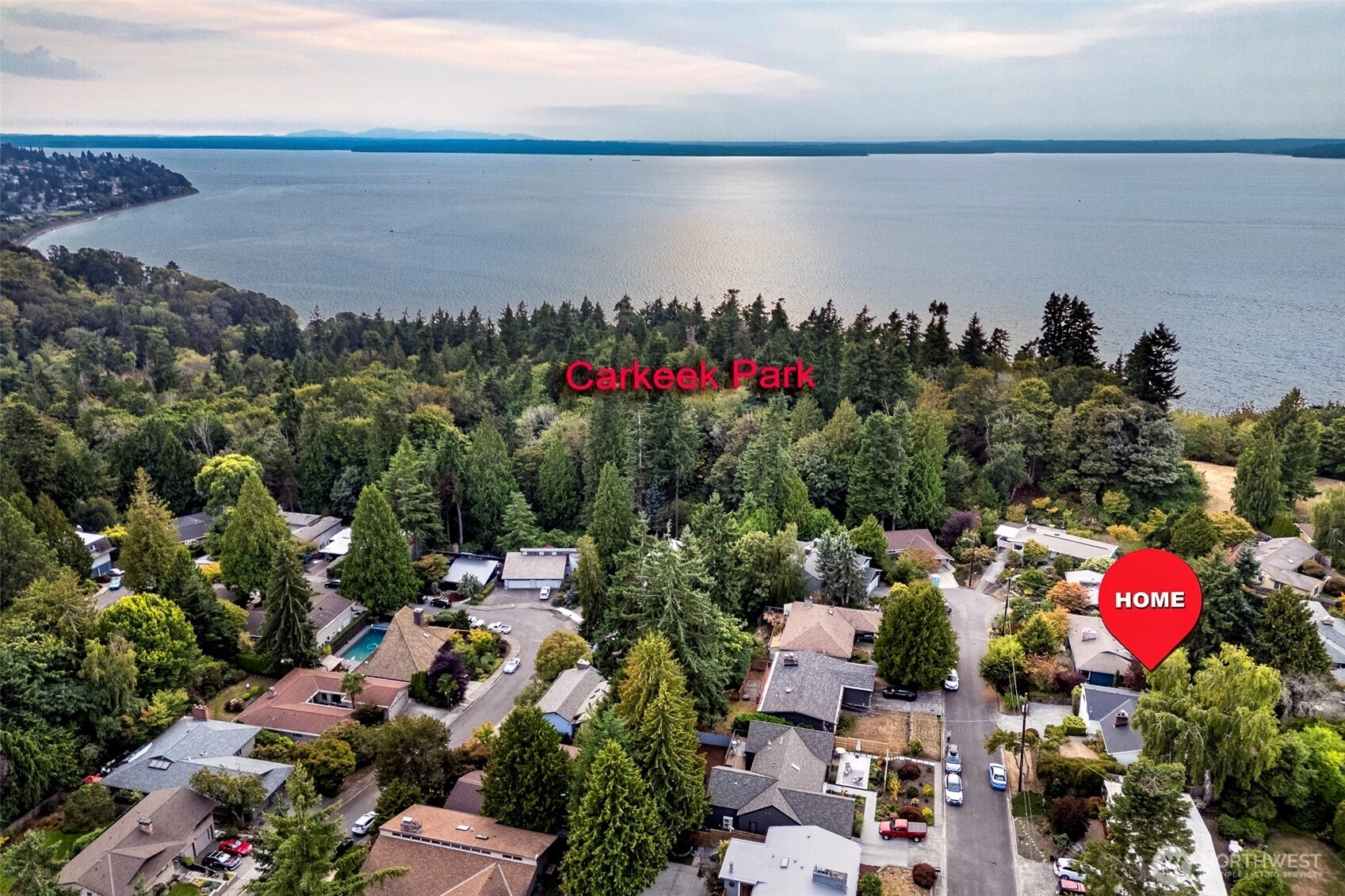 Desirable south-facing home just steps from Carkeek Park. Sun-filled living room with wood-burning fireplace, refinished hardwoods, and territorial views. Dining room opens to expansive covered deck for year-round entertaining. Bright kitchen with breakfast nook overlooks fenced backyard. Main level features a primary suite with three-quarter bath, two additional bedrooms, full bath, and plenty of storage. The light-filled lower level includes a large family room with fireplace, flex space, guest room/office, three-quarter bath, and laundry. The two-car garage features extra storage and work bench. Lush landscaping, with mature trees and garden shed. Minutes to parks, trails, beach, shopping, and major commuter routes. Pre-inspected!