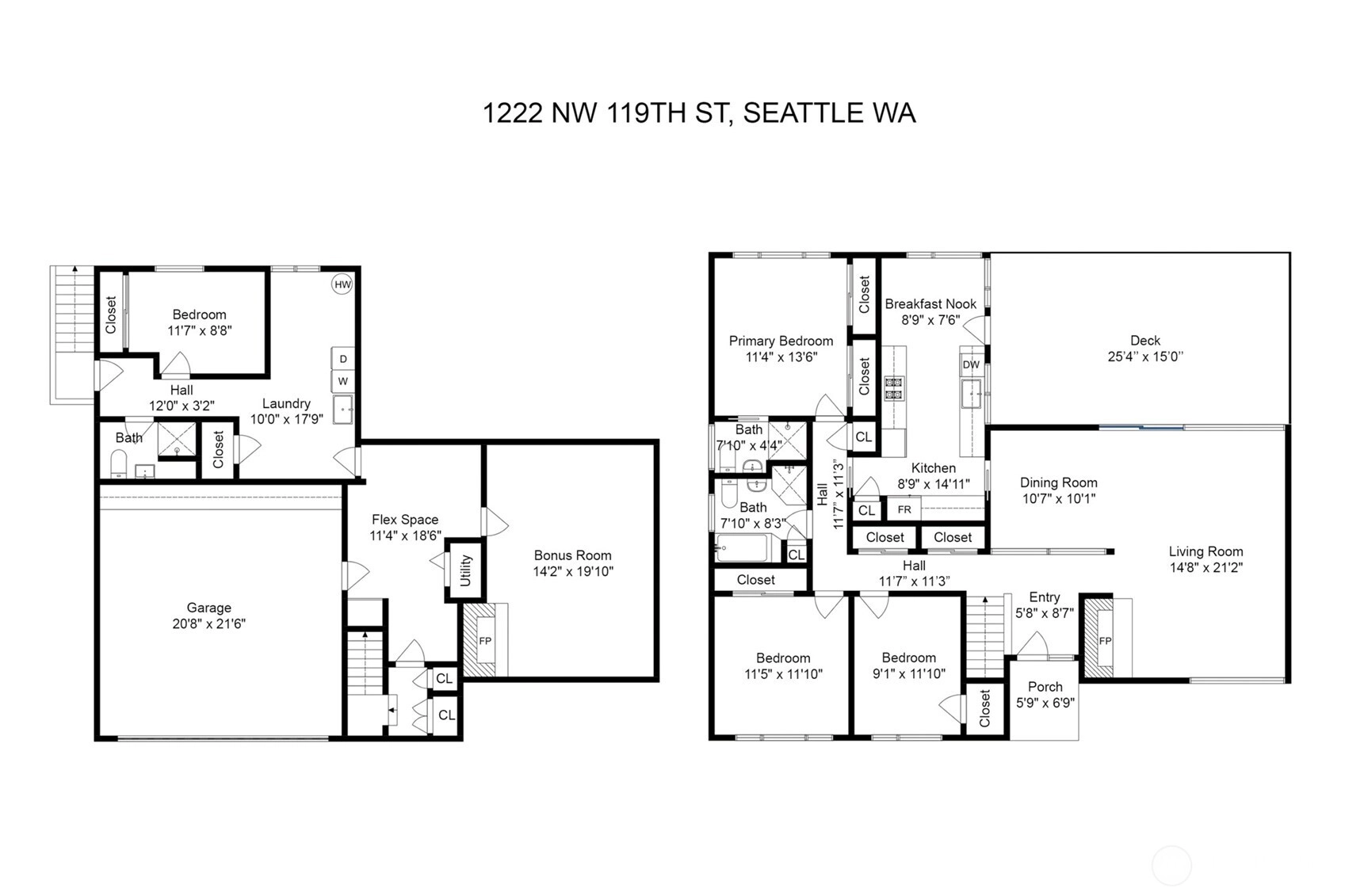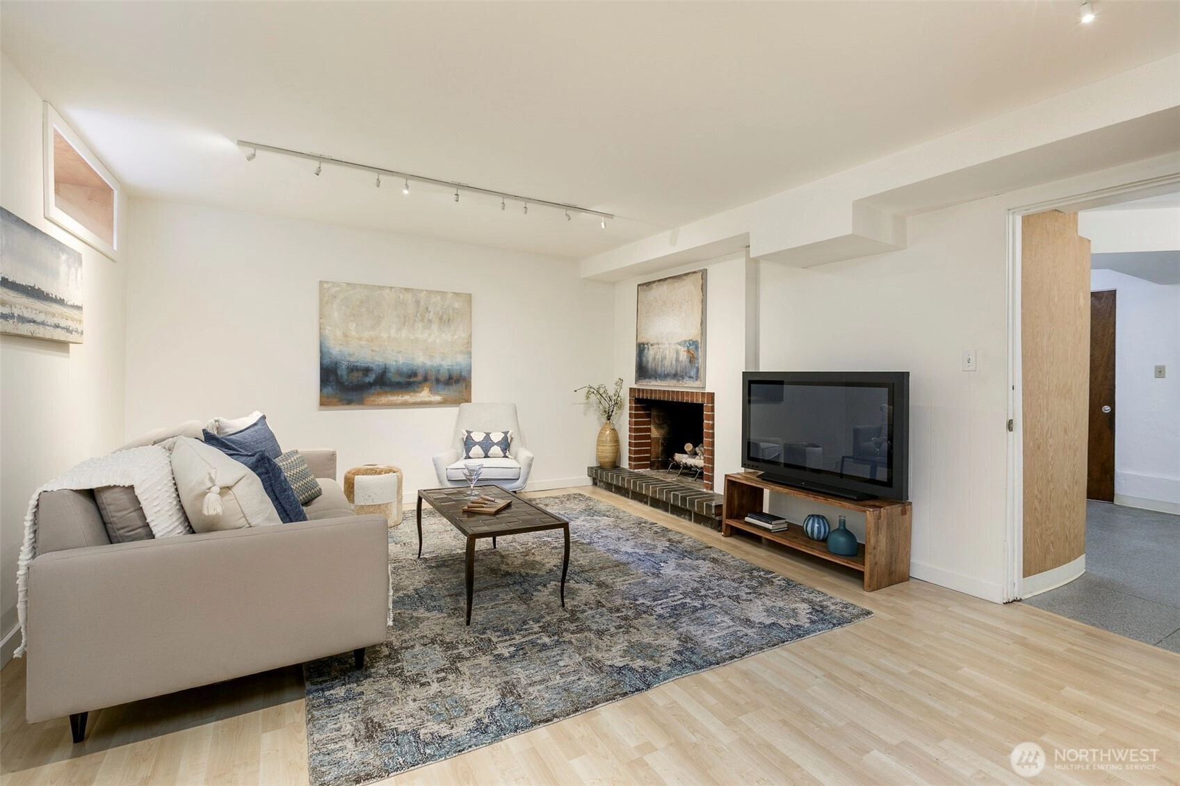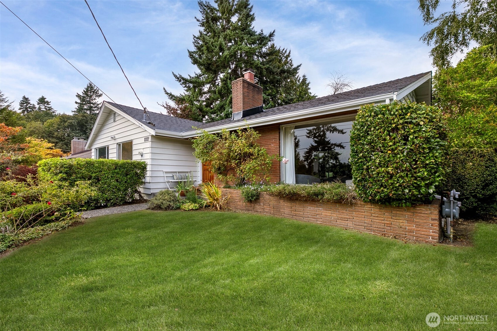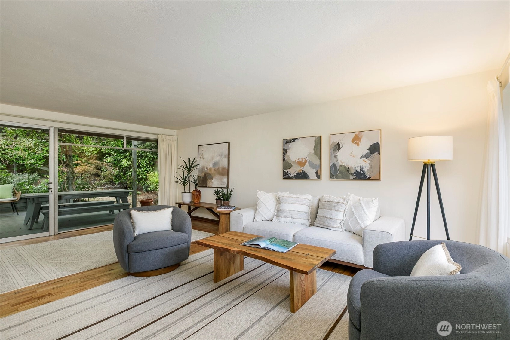 Desirable south-facing home just steps from Carkeek Park. Sun-filled living room with wood-burning fireplace, refinished hardwoods, and territorial views. Dining room opens to expansive covered deck for year-round entertaining. Bright kitchen with breakfast nook overlooks fenced backyard. Main level features a primary suite with three-quarter bath, two additional bedrooms, full bath, and plenty of storage. The light-filled lower level includes a large family room with fireplace, flex space, guest room/office, three-quarter bath, and laundry. The two-car garage features extra storage and work bench. Lush landscaping, with mature trees and garden shed. Minutes to parks, trails, beach, shopping, and major commuter routes. Pre-inspected!