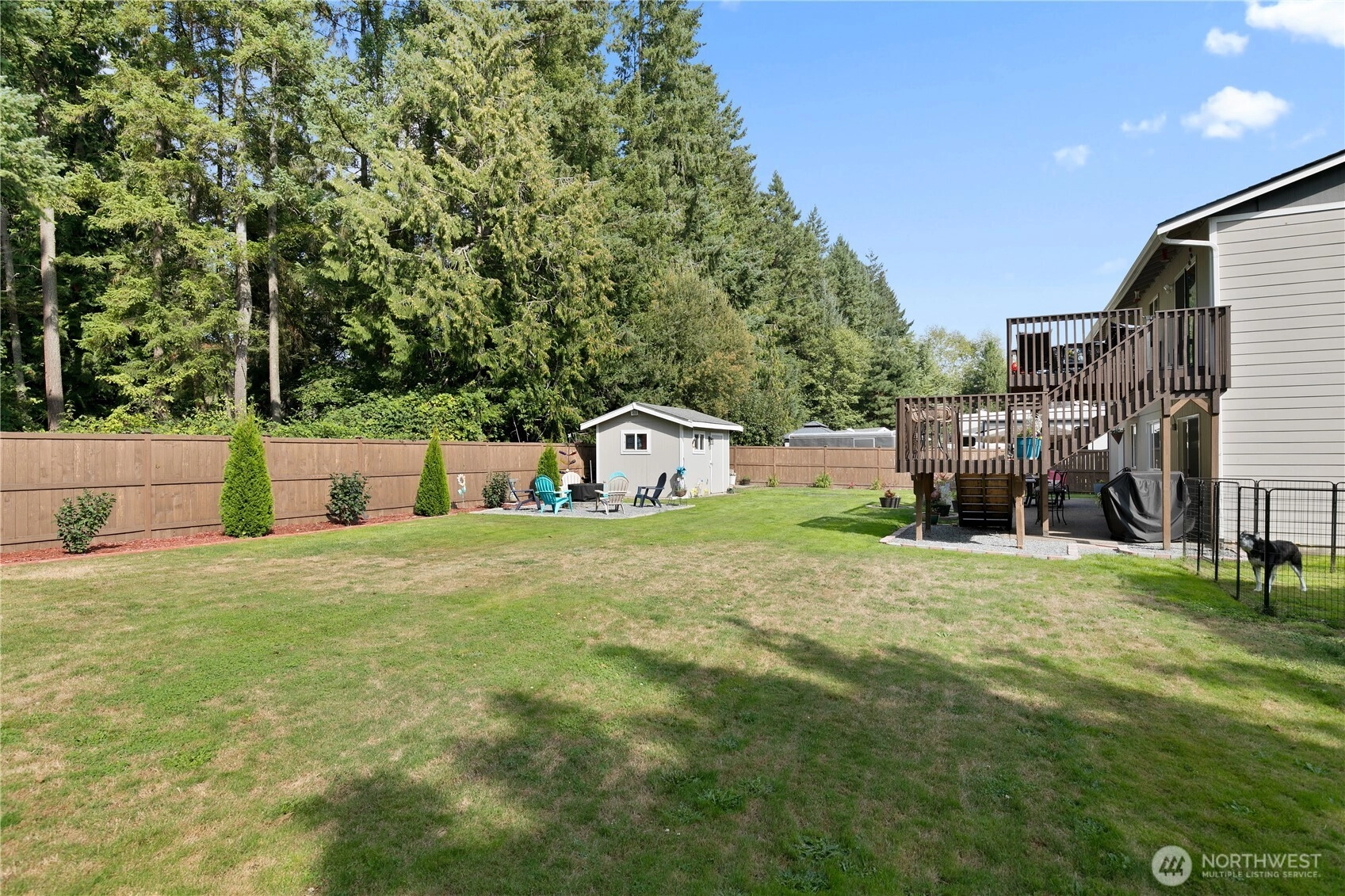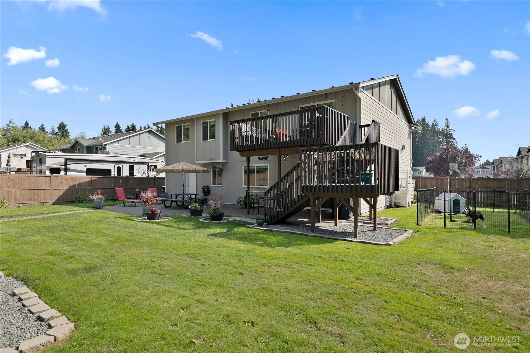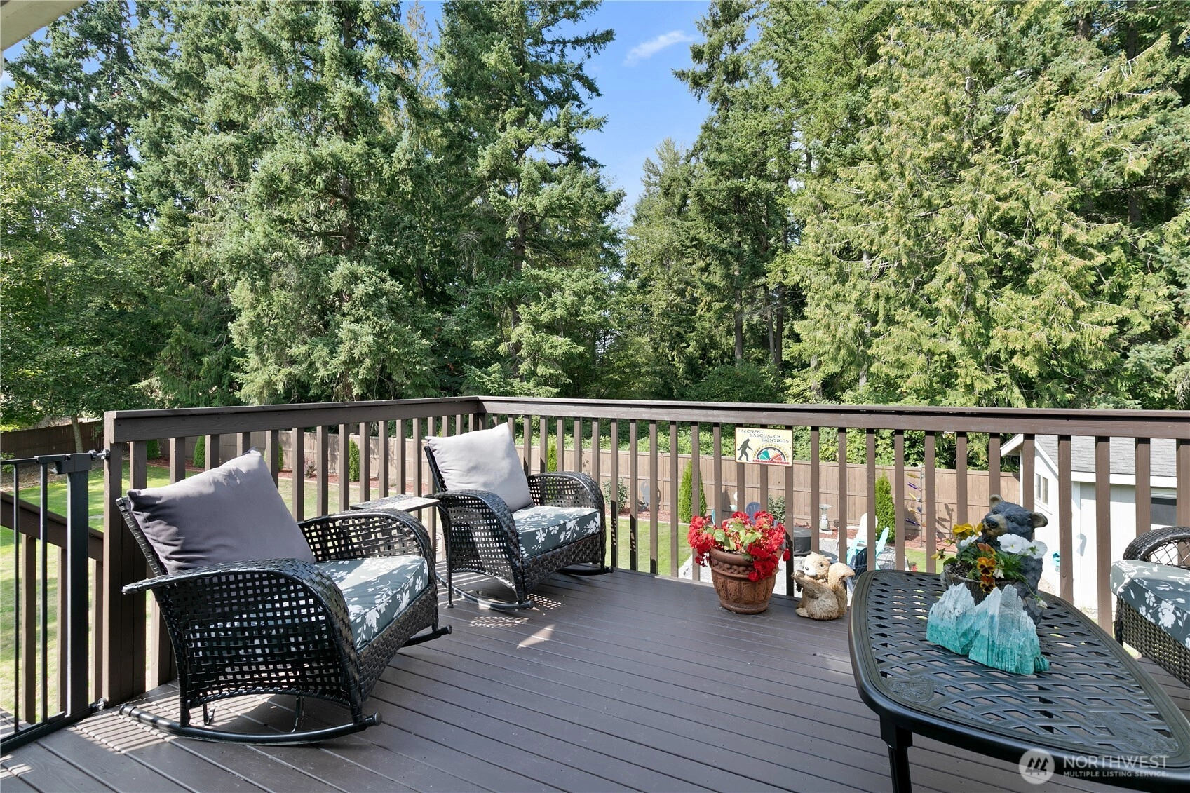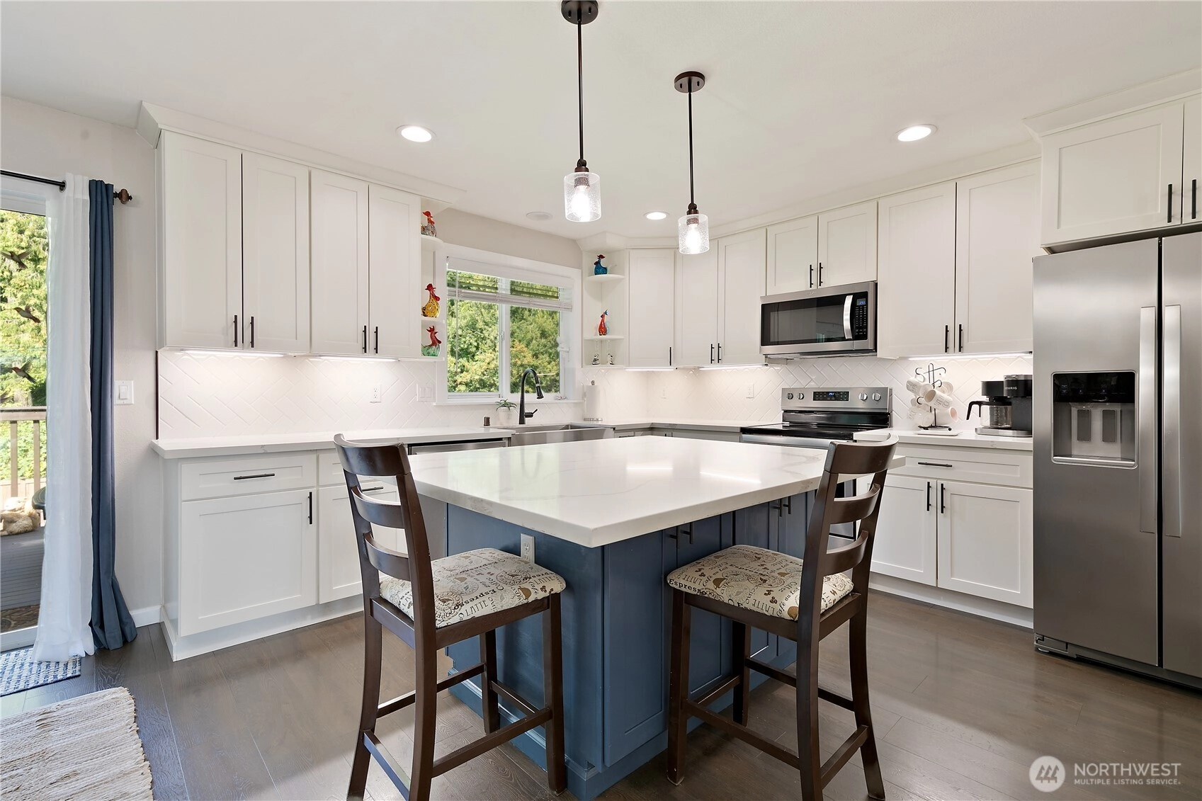 Beautifully updated home with major upgrades inside and out! Enjoy peace of mind with a new roof, water heater, carpet, interior paint, cabinets, quartz countertops, custom island, and updated fixtures throughout. Bathrooms feature modern vanities and fixtures, while laminate hardwood floors (2023) add style and durability. Stay comfortable year-round with a newer A/C and furnace (2020). The open floor plan is filled with natural light, complemented by a cozy fireplace and stainless steel appliances. Step outside to a stunning deck overlooking a huge fully fenced yard, backing to a tranquil greenbelt. Sitting on 1/2 acre, with newer exterior paint and can lighting, this home is move-in ready and truly shines!