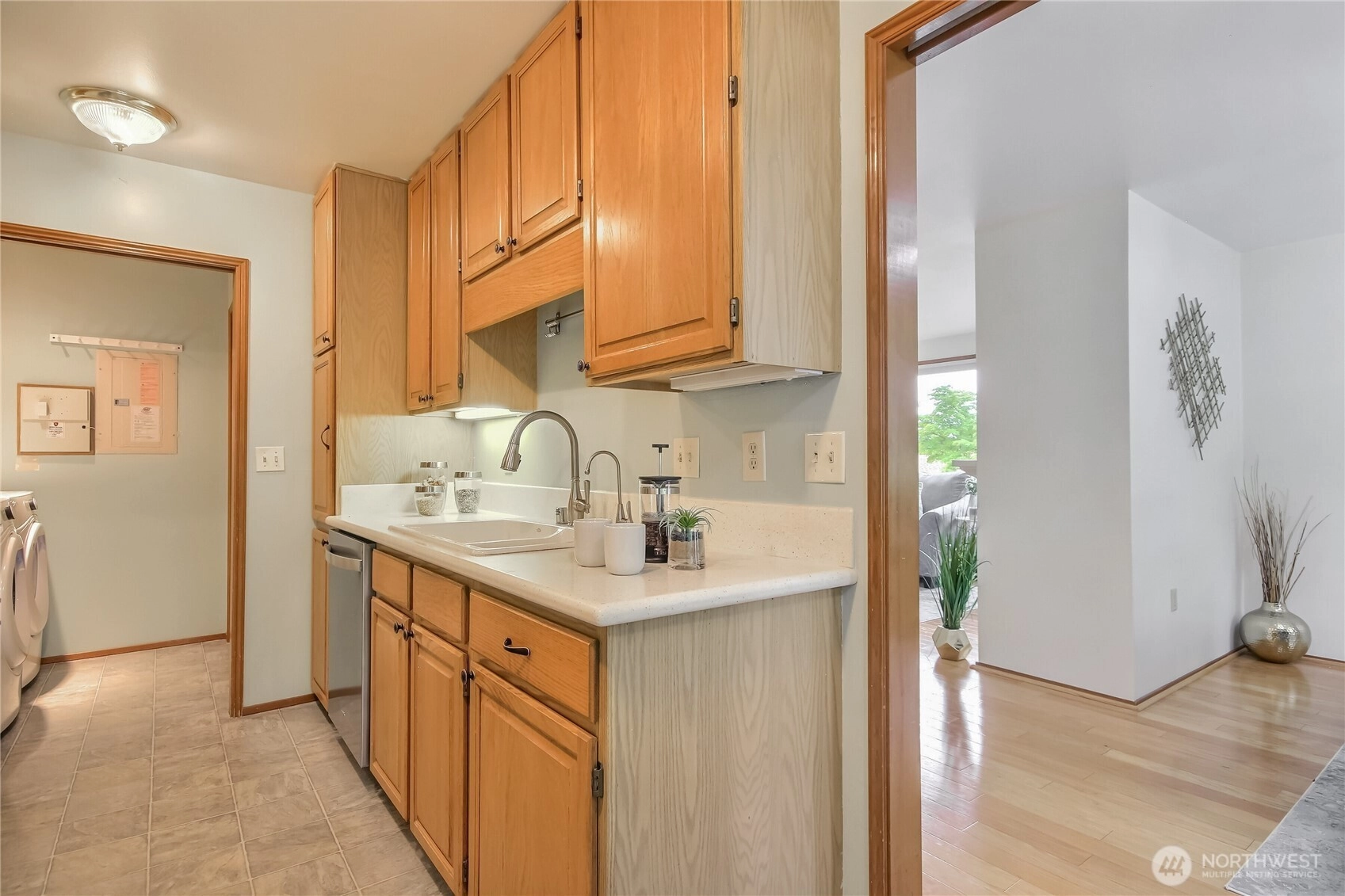 Beautiful 1 level 2 bed/2 ba ground floor, corner unit with territorial views. Private outdoor patio with privacy fencing with convenient access to garage & condo. Updated kitchen with ShelfGenie pull-outs in kitchen buffet & pantry. Kohler sink w/reverse osmosis water filter under sink. Additional pantry in hall closet with shelves. Hardwood floors in all main living areas. Newer Milgard Windows. Heat Pump. Air cleaner connected to furnace. Water Tank installed 2017. Hot water circulating pump. Side-by-side washer/dryer conveys. 1 car garage and approx 8'x10' storage unit. Non Smoking Bldg. 55+ Active Community in Providence Point.