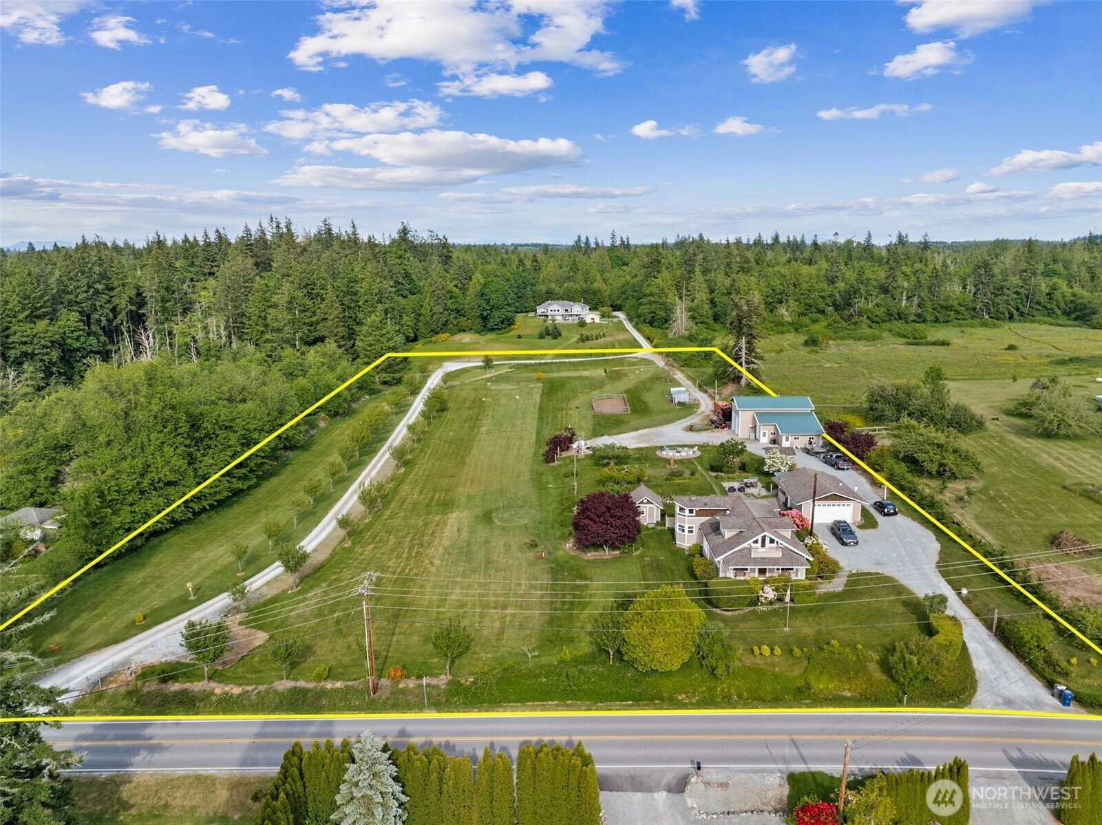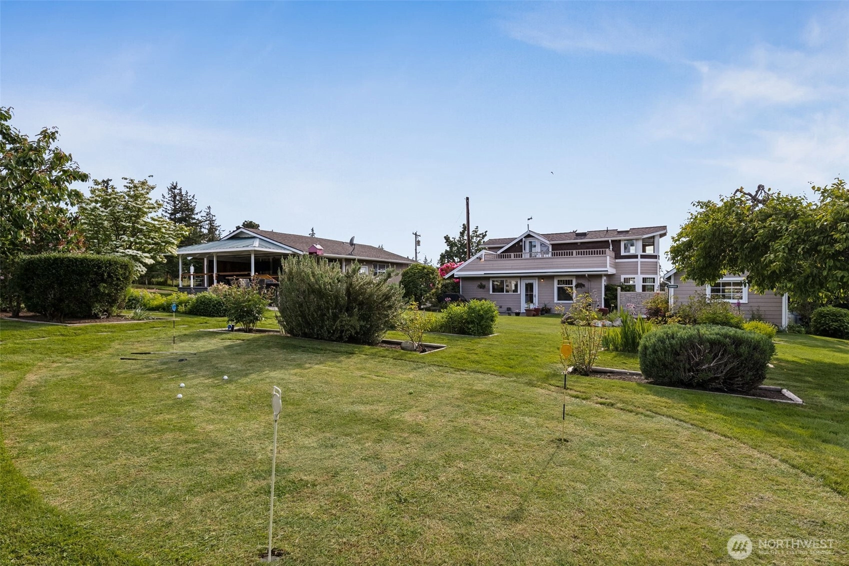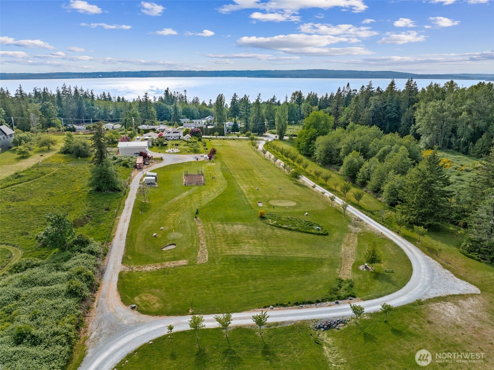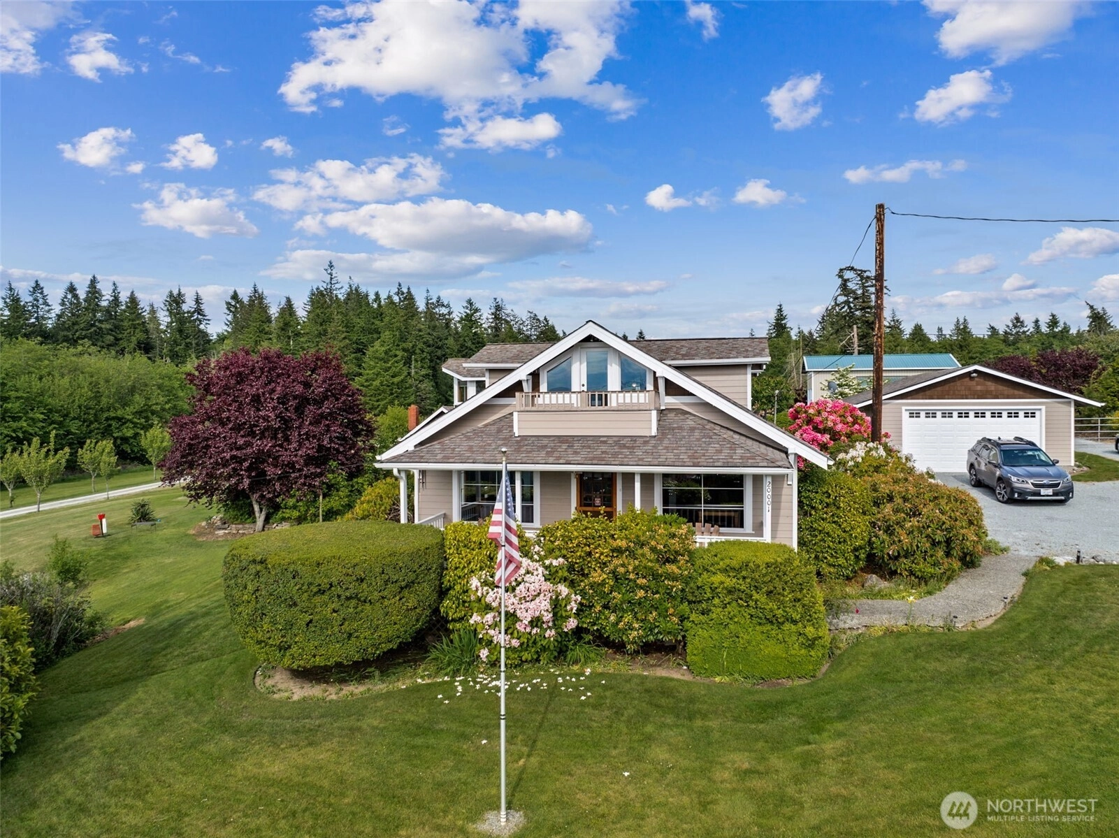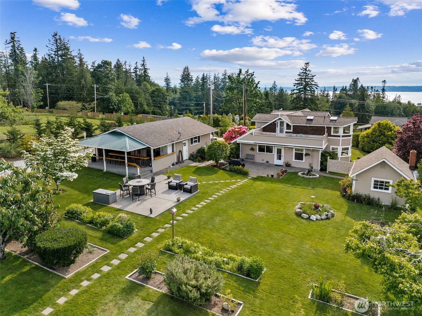 Entertainer & Golfer’s Paradise! Private 5-acre estate w/ 9-hole par-3 course—sand traps, pro signage & cart incl. Flexible acreage ideal for events, hobbies, animals or future ADU. Main home features wood floors, propane FP, kitchen w/ hickory cabs, tile counters, pantry & water view. Showstopping bar w/ cherry cabs, granite, mosaic tile & martini-glass ceiling. Lofted primary suite w/ 2 view decks—sunsets over Port Susan & sunrises over the course—plus spa bath. Guest house, bsmnt suite, huge, heated shop w/ 220, tall doors & wkshp. Outdoor bar, patios, gardens, fruit trees & more!