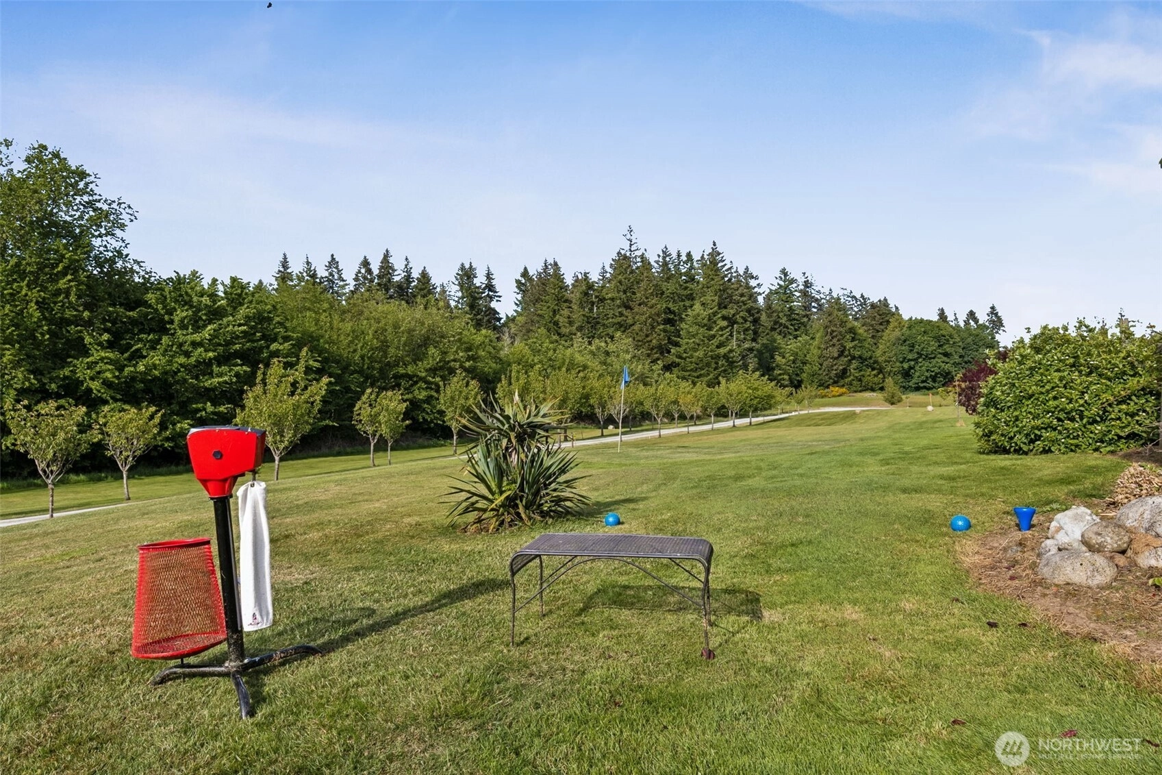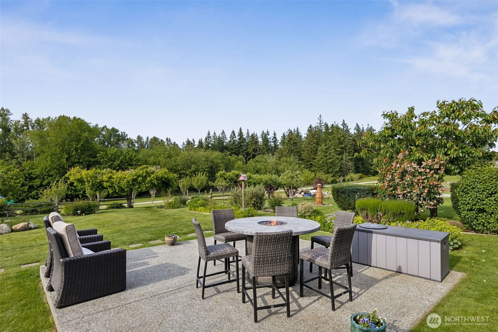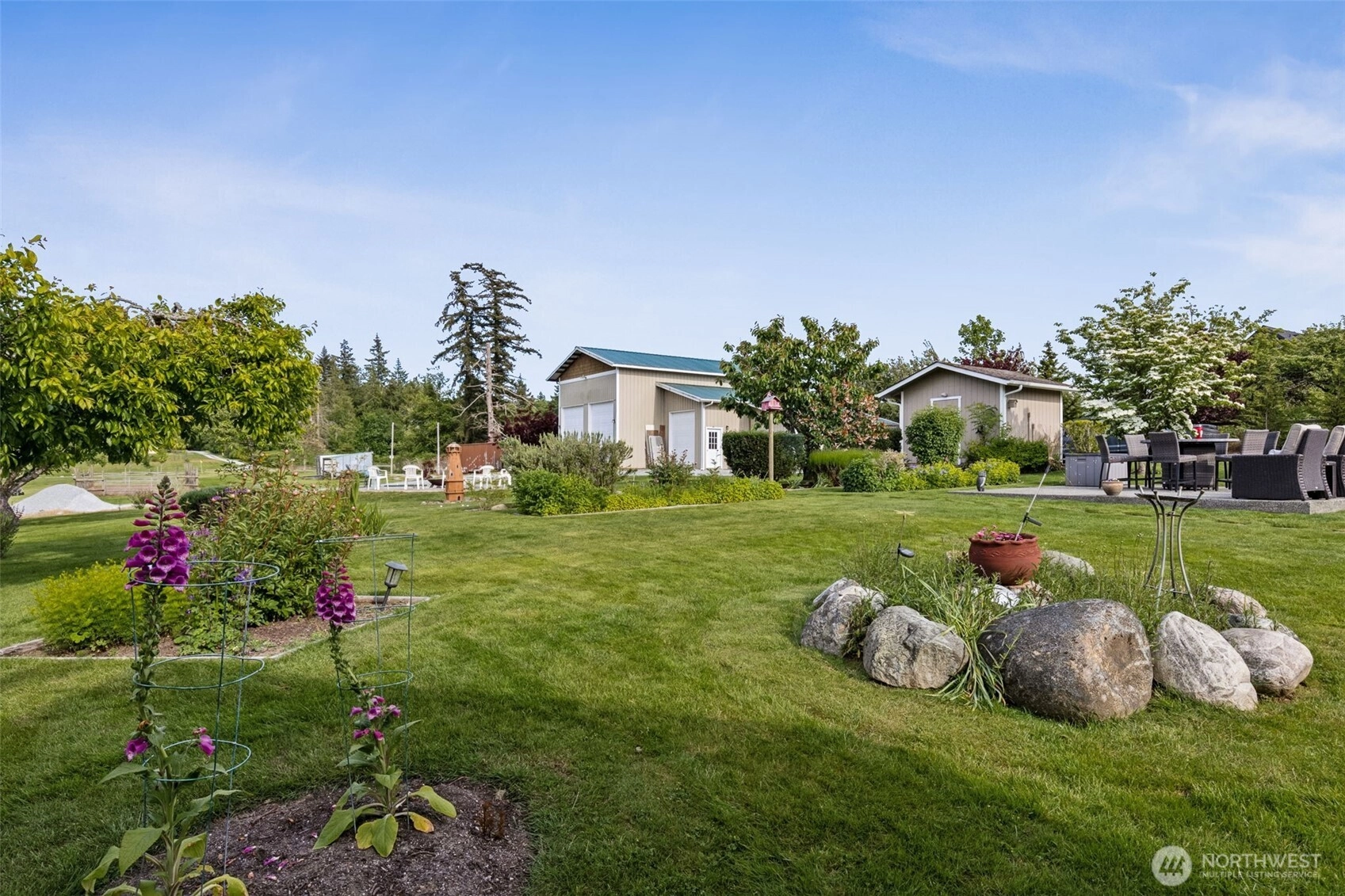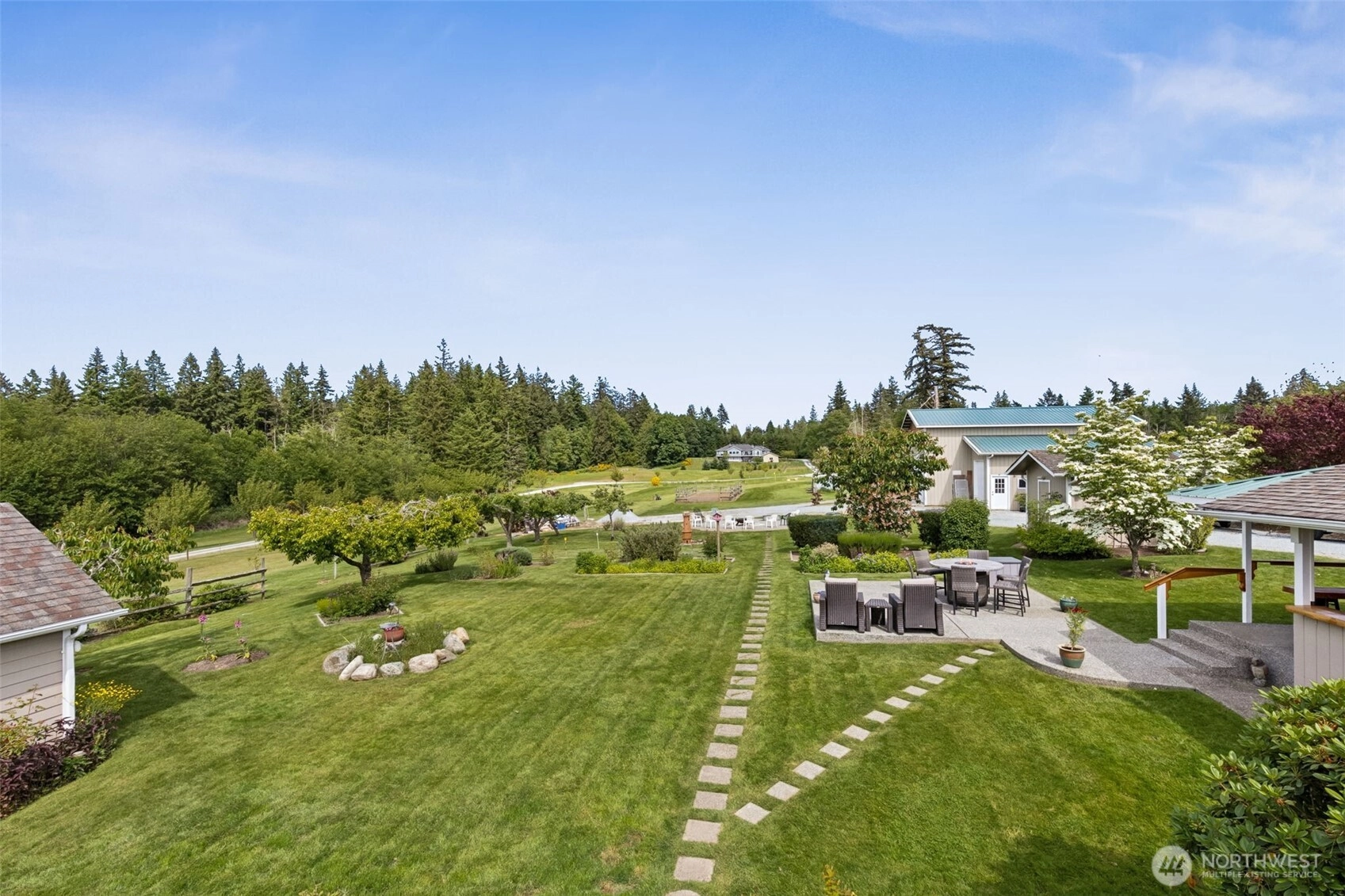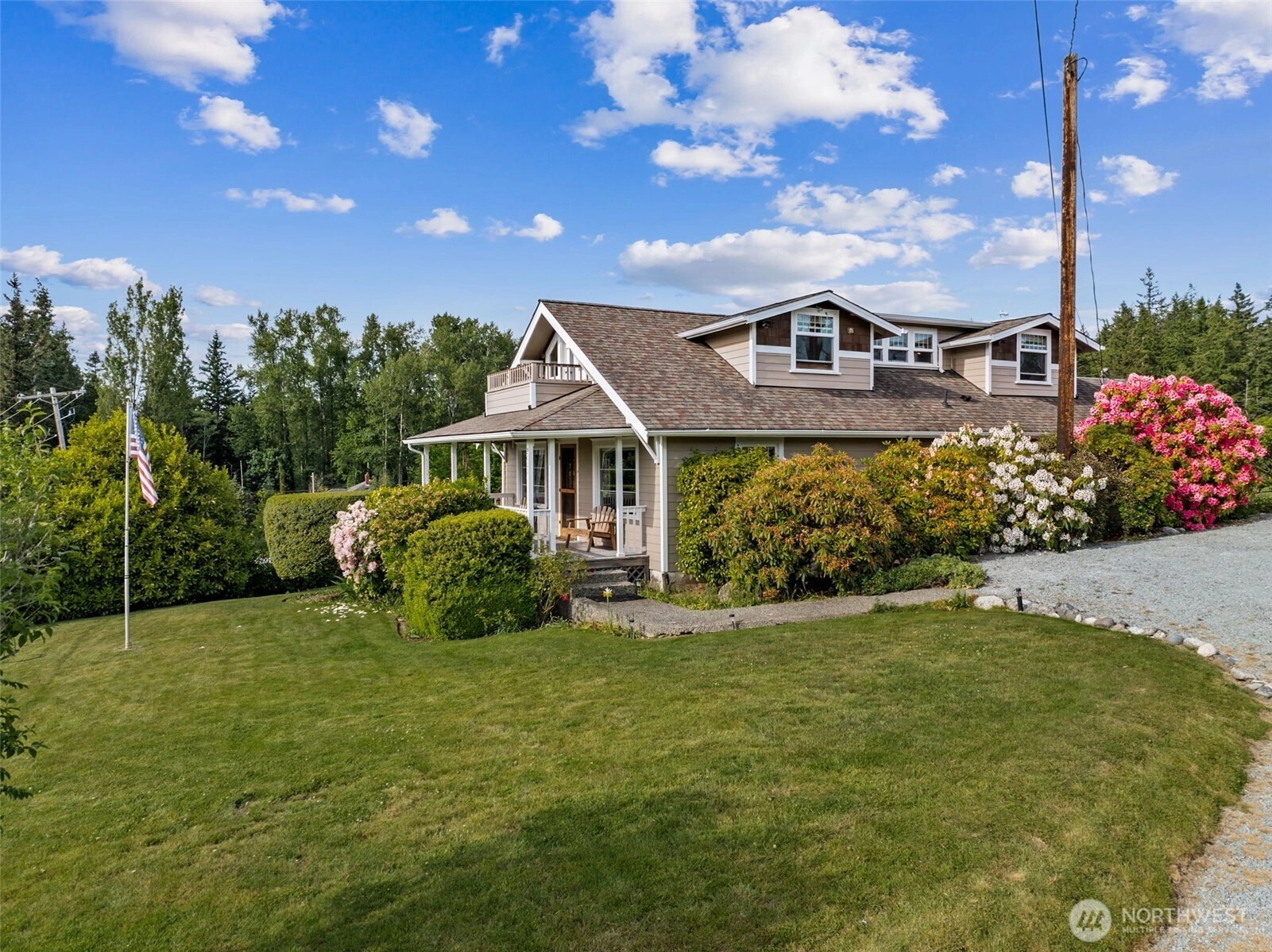 Entertainer & Golfer’s Paradise! Private 5-acre estate w/ 9-hole par-3 course—sand traps, pro signage & cart incl. Flexible acreage ideal for events, hobbies, animals or future ADU. Main home features wood floors, propane FP, kitchen w/ hickory cabs, tile counters, pantry & water view. Showstopping bar w/ cherry cabs, granite, mosaic tile & martini-glass ceiling. Lofted primary suite w/ 2 view decks—sunsets over Port Susan & sunrises over the course—plus spa bath. Guest house, bsmnt suite, huge, heated shop w/ 220, tall doors & wkshp. Outdoor bar, patios, gardens, fruit trees & more!