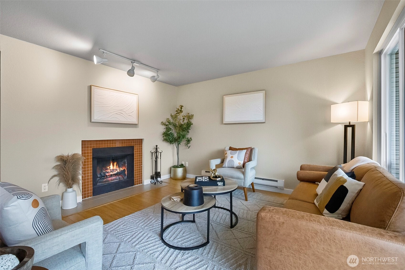 Discover this bright 2BD/1BA corner-unit condo set within a designated Seattle historical landmark, just minutes from downtown! Filled with natural light, this home features fresh interior paint, wood floors, and an open layout. The spacious kitchen offers granite countertops, stainless steel appliances, and an in-unit washer/dryer. Enjoy a cozy fireplace and private balcony, ideal for entertaining or relaxing. The primary suite includes a walk-in closet and an additional granite vanity for convenience. Secure, gated community amenities include an outdoor pool, hot tub, clubhouse, and designated parking with ample guest parking. Experience the charm of Seattle history with the ease of modern living in this rare urban oasis!