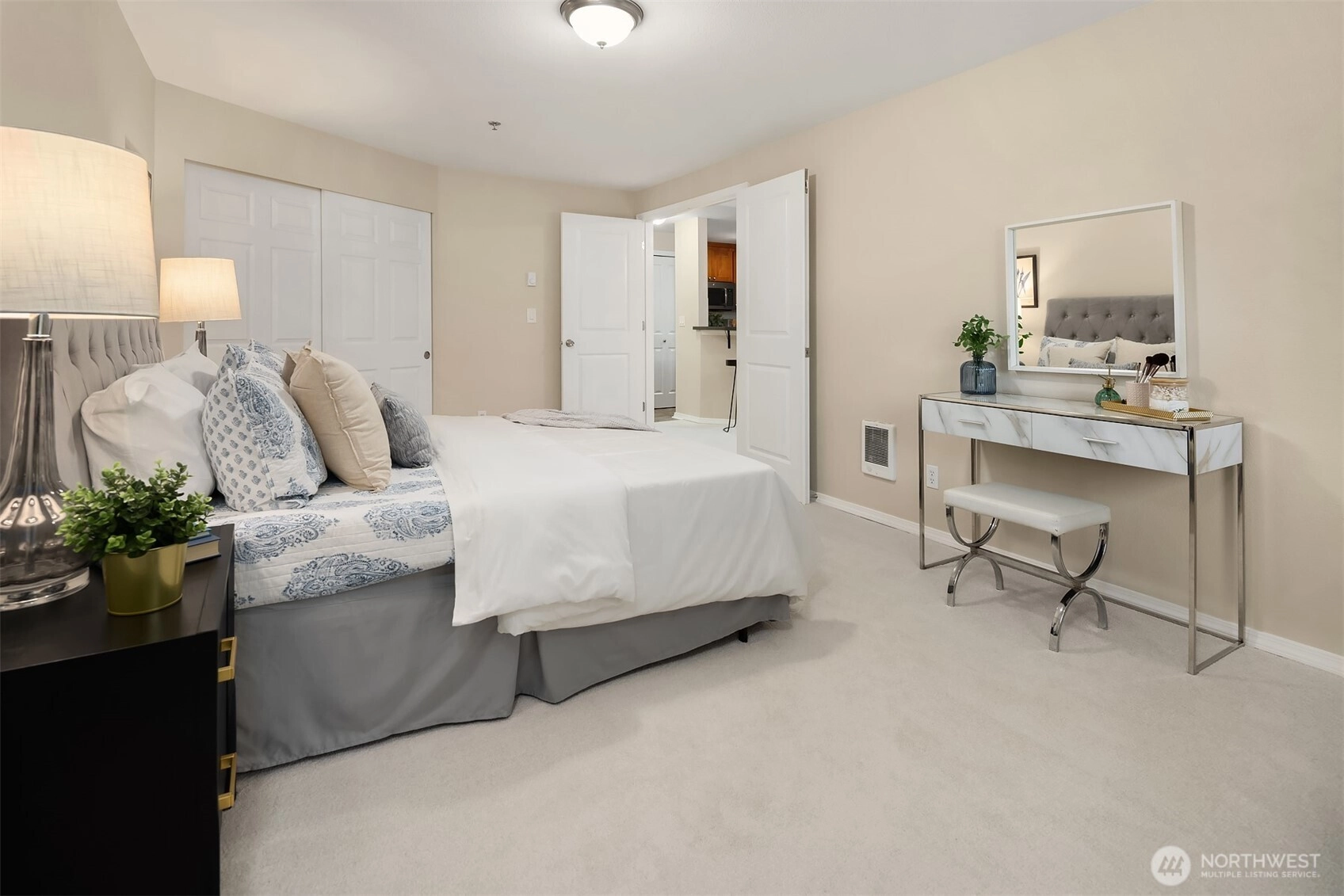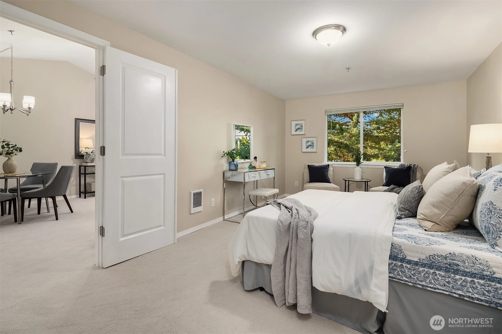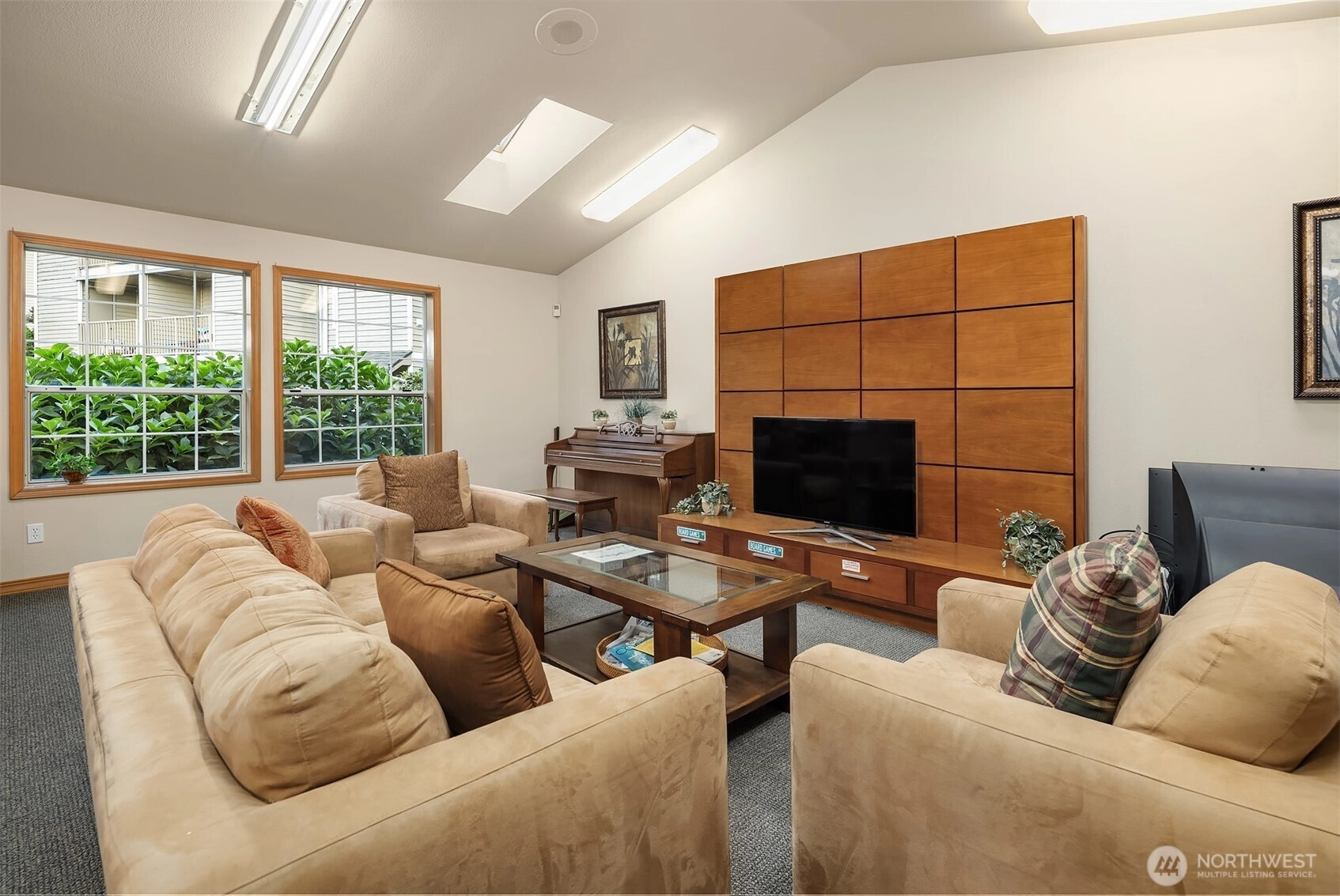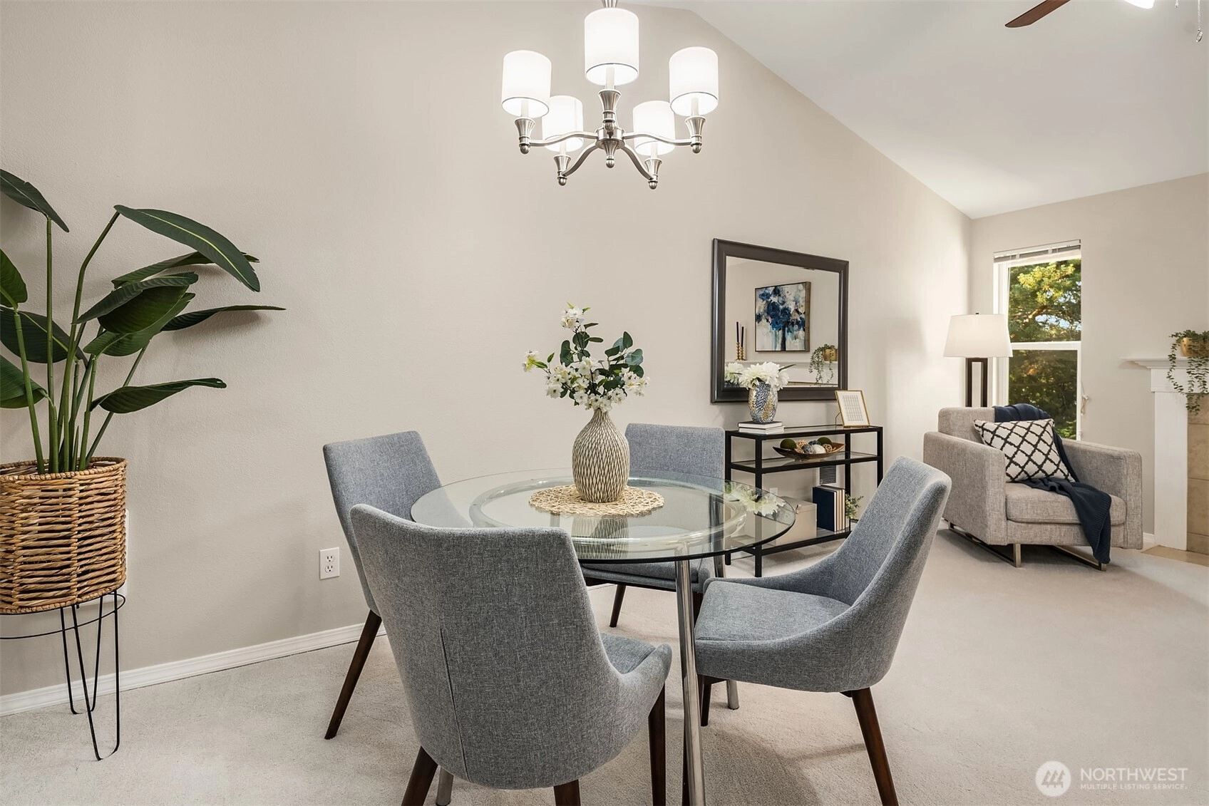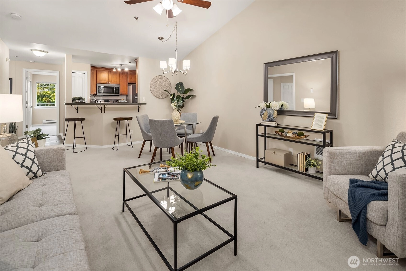 This charming top-floor 2-bedroom condo w/vaulted ceilings is move-in ready & sure to impress even the pickiest Buyer. Meticulously maintained home features fresh updates including new carpet, designer interior paint, kitchen faucet, & garbage disposal. The stunning kitchen offers SS appliances, a spacious pantry, an open view into the dining & living areas, ideal for entertaining. French doors lead to a generously sized bedroom w/a walk-in closet. Both the kitchen & bathroom showcase elegant tile flooring, while the bathroom’s subway tile adds a touch of timeless class. Convenience abounds w/in-unit laundry, completing this beautiful home. Two parking spots assigned, one covered. Amenites include a clubhouse, pool, gym, pool & tanning rm.