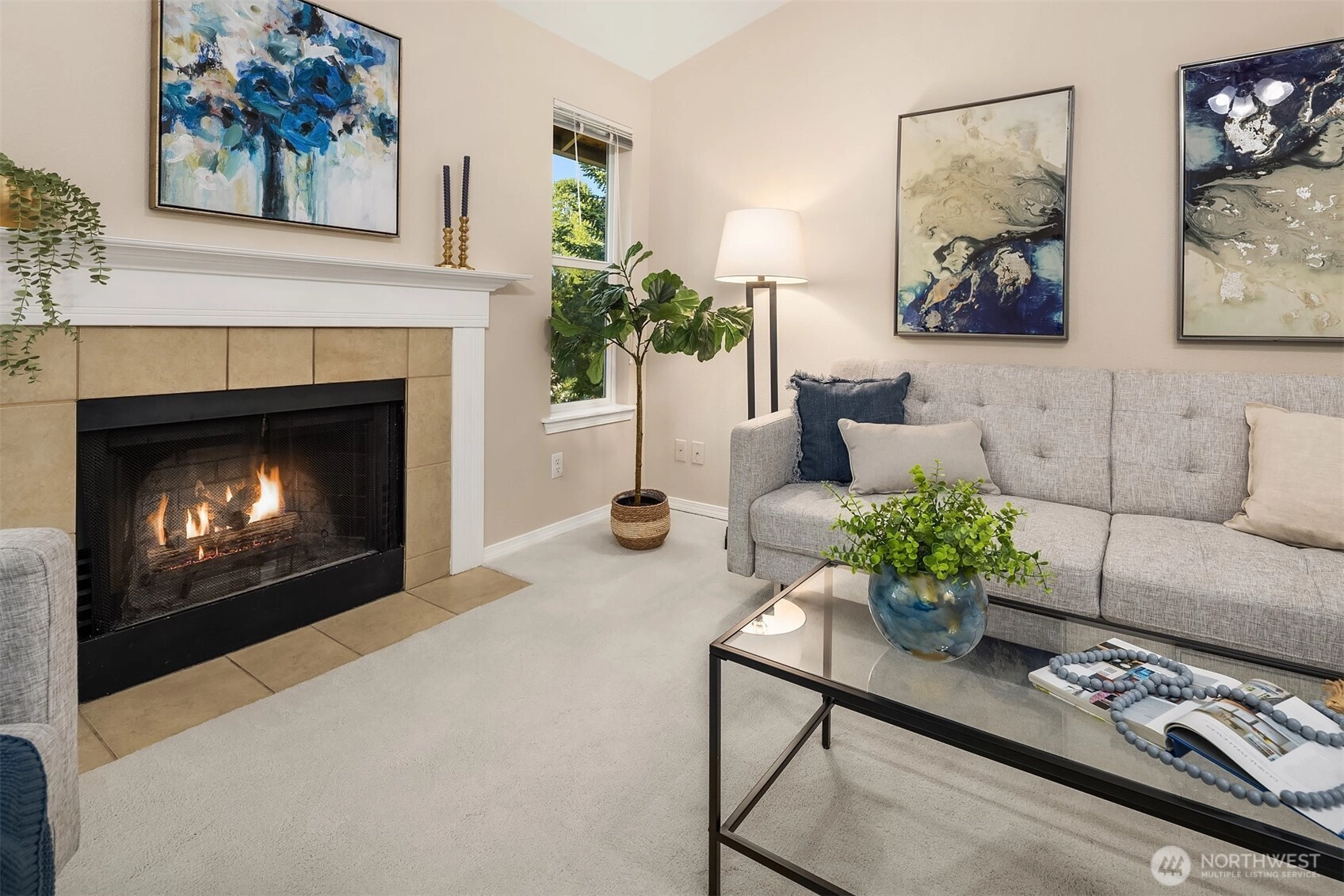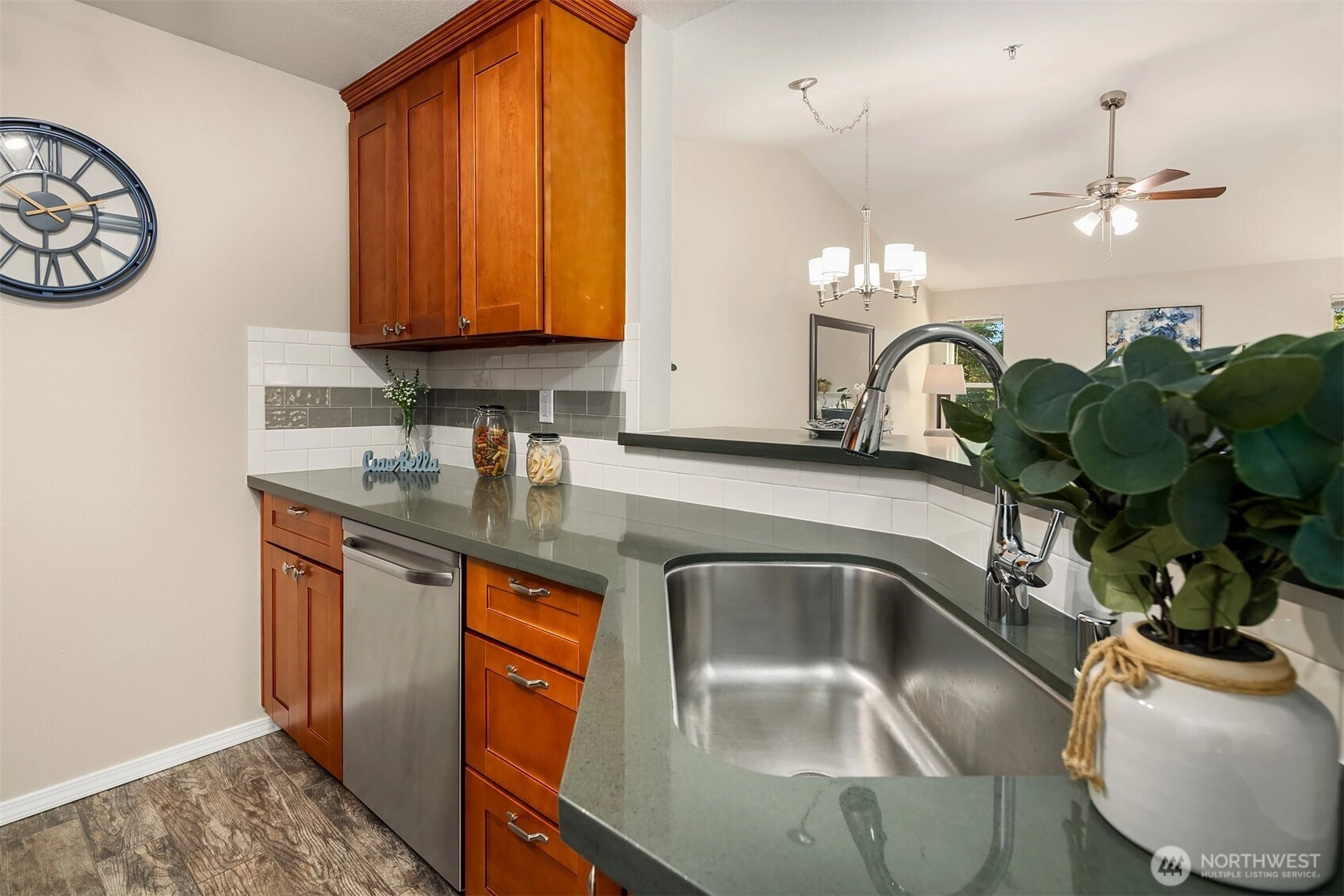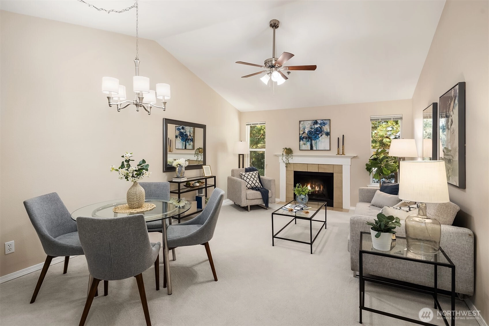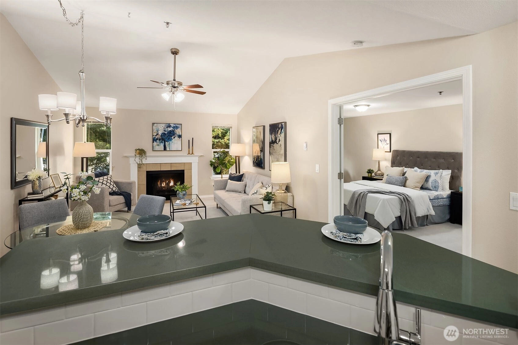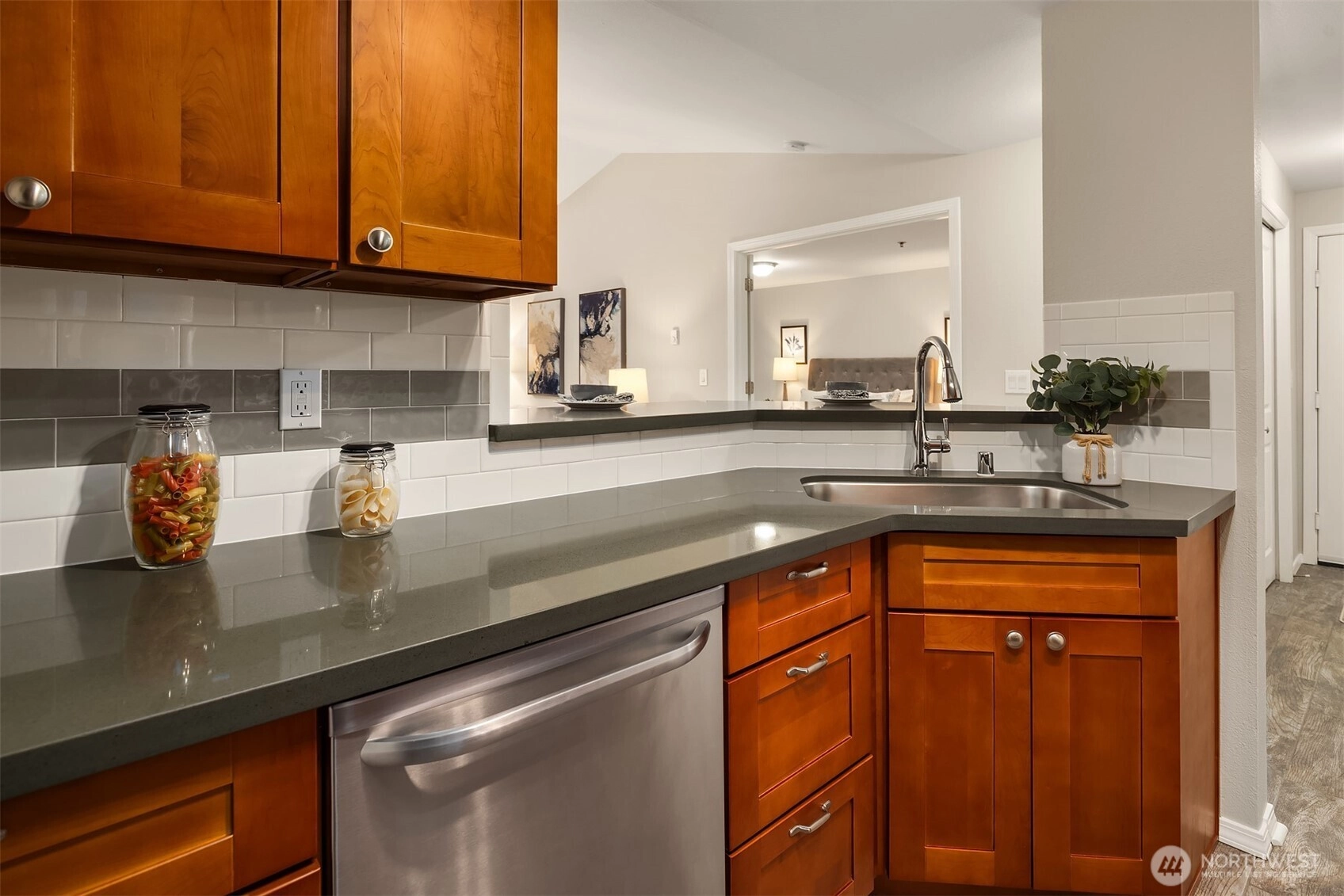 This charming top-floor 2-bedroom condo w/vaulted ceilings is move-in ready & sure to impress even the pickiest Buyer. Meticulously maintained home features fresh updates including new carpet, designer interior paint, kitchen faucet, & garbage disposal. The stunning kitchen offers SS appliances, a spacious pantry, an open view into the dining & living areas, ideal for entertaining. French doors lead to a generously sized bedroom w/a walk-in closet. Both the kitchen & bathroom showcase elegant tile flooring, while the bathroom’s subway tile adds a touch of timeless class. Convenience abounds w/in-unit laundry, completing this beautiful home. Two parking spots assigned, one covered. Amenites include a clubhouse, pool, gym, pool & tanning rm.