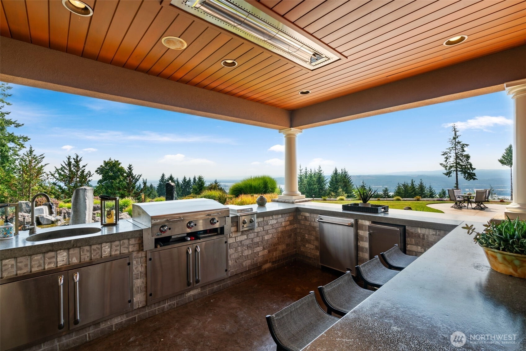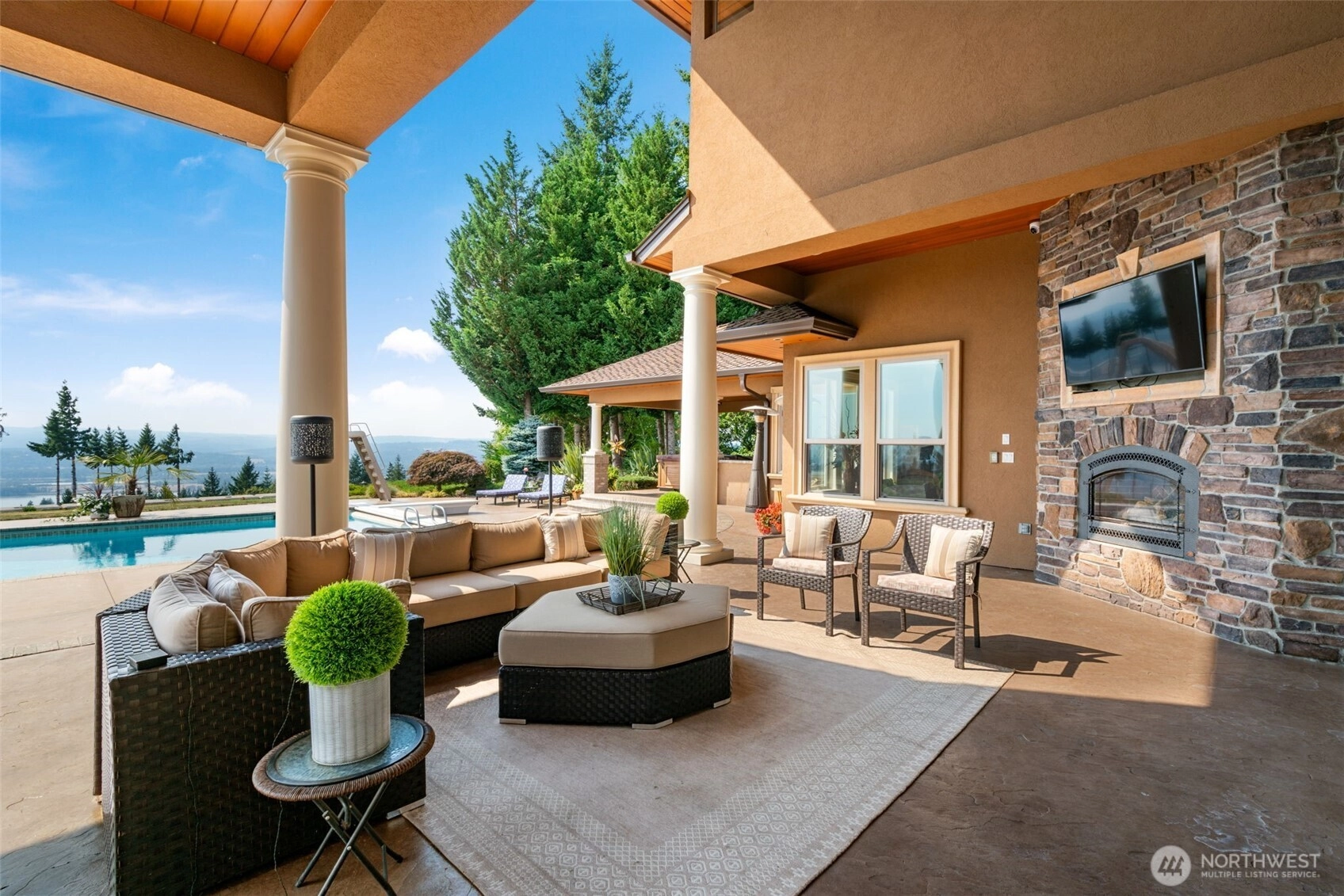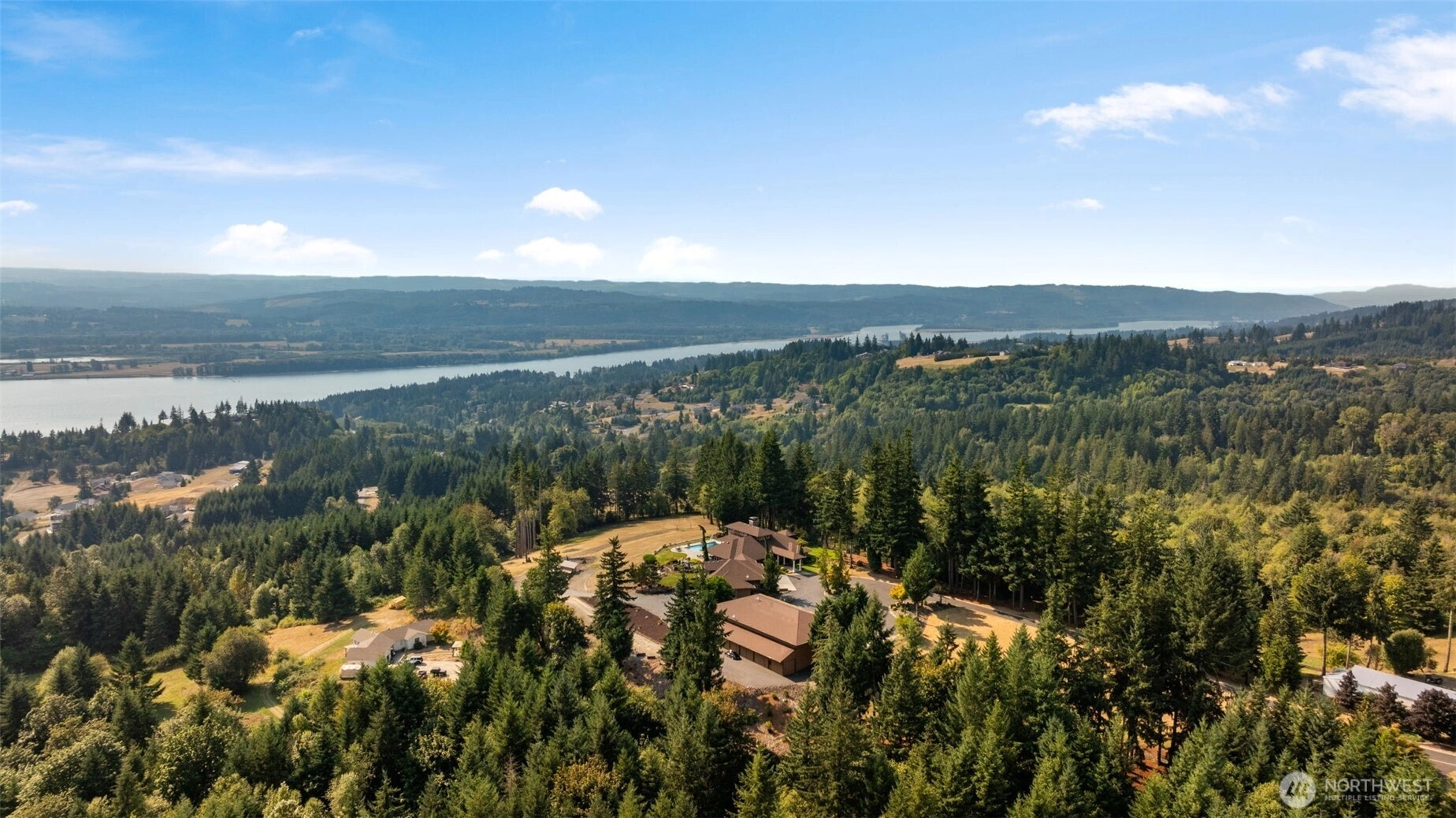 Gated single level estate on 13.76 acres with sweeping 180° Columbia River views. The 4,254 SF main home offers vaulted ceilings, expansive windows and a gourmet kitchen. The primary suite includes a wet bar, sauna, spa bath with jetted tub, walk-in shower, dual vanity, walk-in closet, plus private outdoor shower, bath, and hot tub. Two additional bedrooms, 2.5 baths complete the home. A 2 bed,1 bath ADU with 1,876 SF adds a game room, theater, kitchenette, bar, and gym. The 3,528 SF shop features 7 bays, full bath, bar/entertaining area, and 4 storage bays. Outdoors enjoy a heated pool with slide, outdoorkitchen, fireplace, koi pond, landscaped grounds, firepit, and two RV hookups.