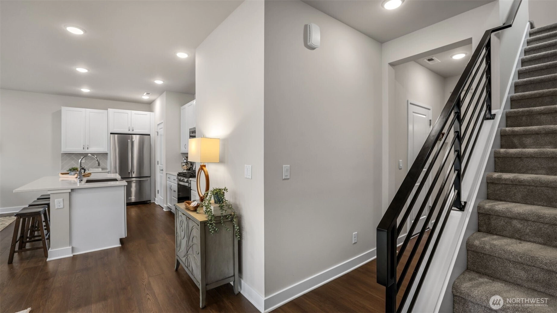 Charming nearly-new 3-bedroom Craftsman in River Trail at Elliott Farm! Light-filled open plan with modern kitchen featuring elegant white cabinetry with pull-out shelves & soft-close drawers, quartz countertops, large island with farmhouse sink, pantry, and stainless steel appliances including gas cooktop-ideal for entertaining. Spacious gathering and dining areas complete the great room. Main floor offers a private office; upstairs includes a spacious primary suite with luxurious bath, rain-dome shower, and walk-in closet, plus a bonus loft & convenient upstairs laundry. Central heating and cooling. Fenced yard ideal for pets & gardening. surrounded by green spaces w/nearby trails, golf, parks. Easy commute to Seattle, Bellevue, & SeaTac