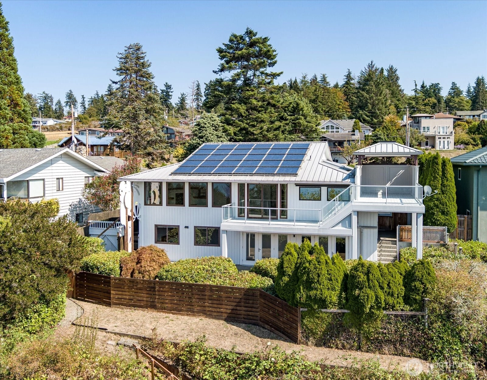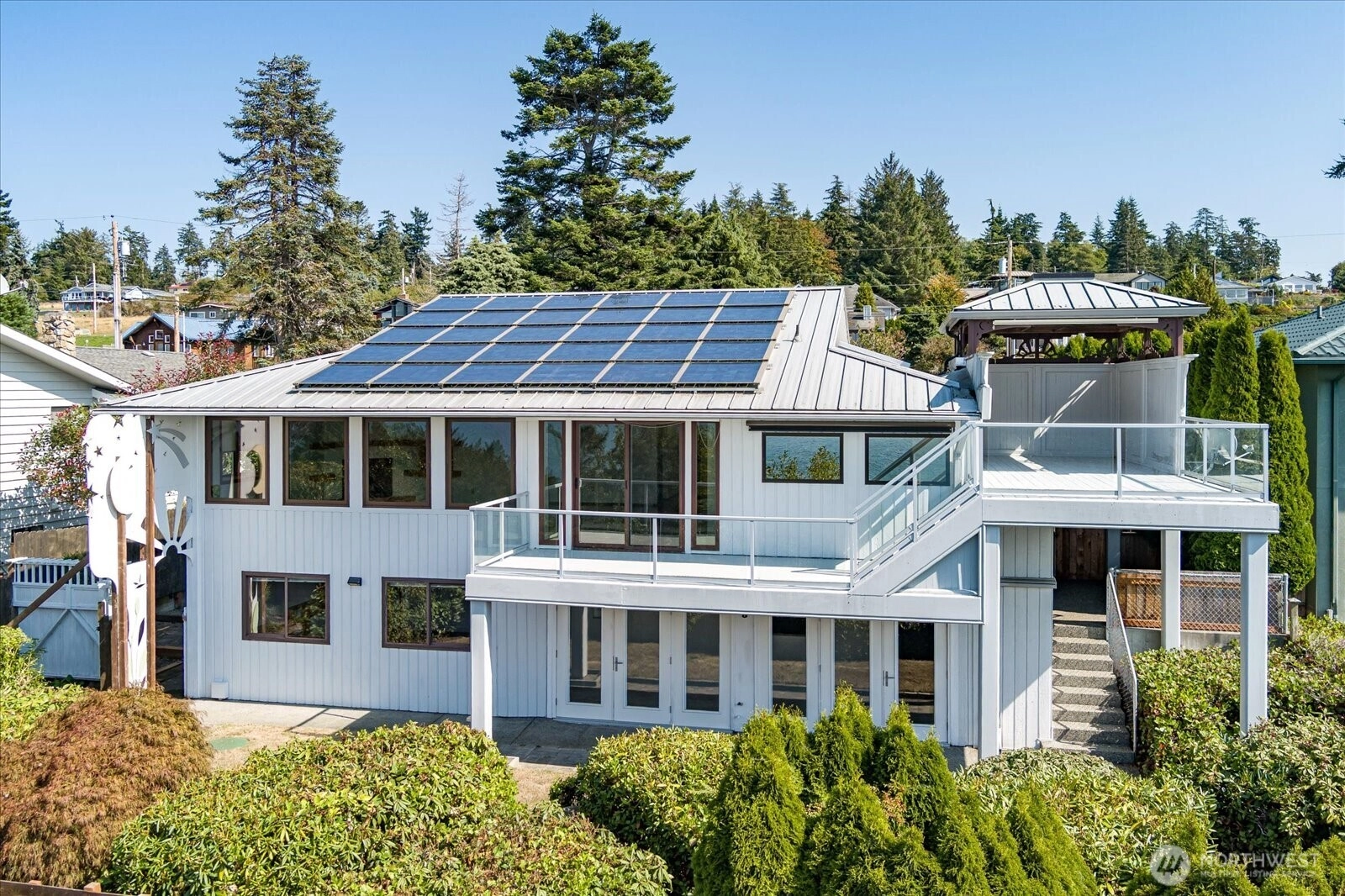 Welcome to this beautiful home with sweeping, unobstructed west side shipping lane, mountain & Strait of Juan de Fuca views. On a clear day one can even catch a glimpse of Victoria, B.C. Nestled on .33 acres with a 50' view corridor. Timeless craftsmanship with modern updates for comfort & efficiency. A private 2 tier deck with covered area to enjoy al fresco meals while taking in the views. Inside you’ll find red oak flooring, porcelain tile, new kitchen appliances, breakfast bar facing the water a pantry & much more. Featuring 2 main floor bedrooms, fireplace, & professionally landscaped grounds by Creative Gardens. Energy efficient home w/solar panels, a mini split & 2 tankless water heaters. Enjoy beach access, a sports court & parking.