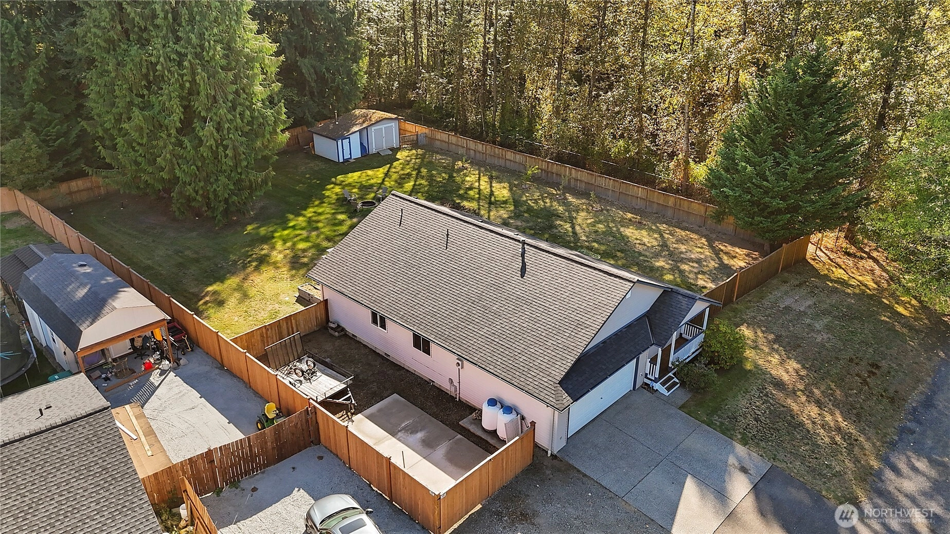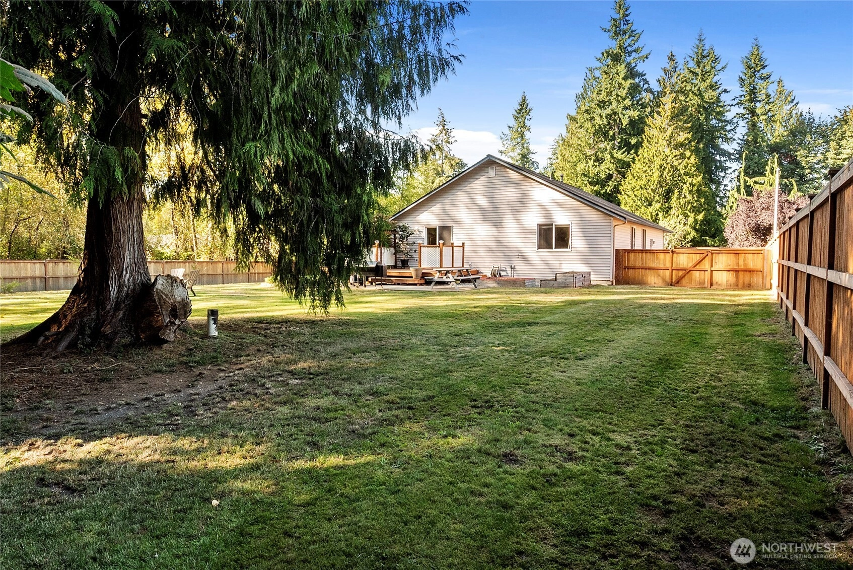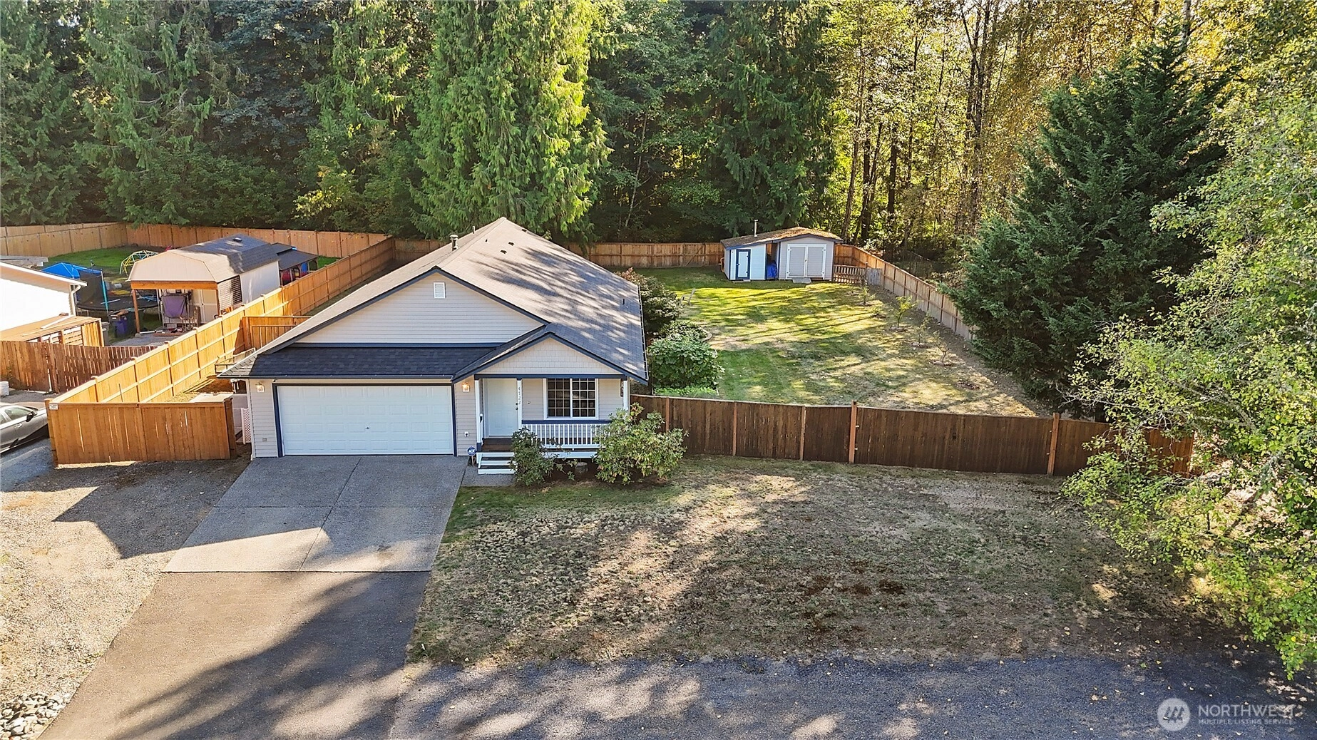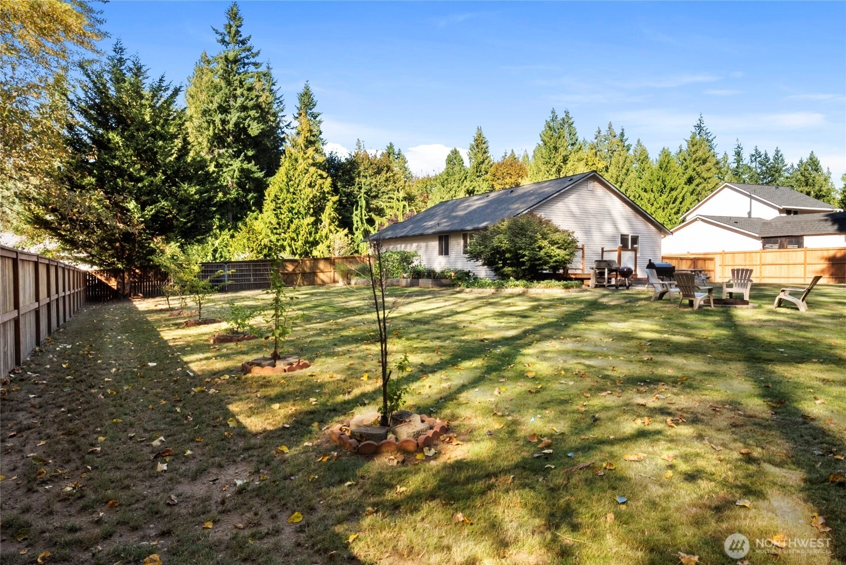 This well-maintained rambler in the sought-after Kackman Creek neighborhood is situated on a nearly half-acre lot backing to private greenspace. Enjoy a south-facing, level, and fully fenced backyard with an outdoor wood-fired sauna, RV/boat pad, dog run, and a 12x12 shed. Inside, you're greeted by beautiful white oak floors and plenty of natural light throughout. The spacious living room features vaulted ceilings, and the kitchen is perfect for everyday living. Primary suite with an attached bath and walk-in closet. With a newer roof (2023), a 2-car garage, 50 acres of walking trails, and easy access to Hwy 9 & I-5, this home offers the perfect balance of quiet living and convenience.