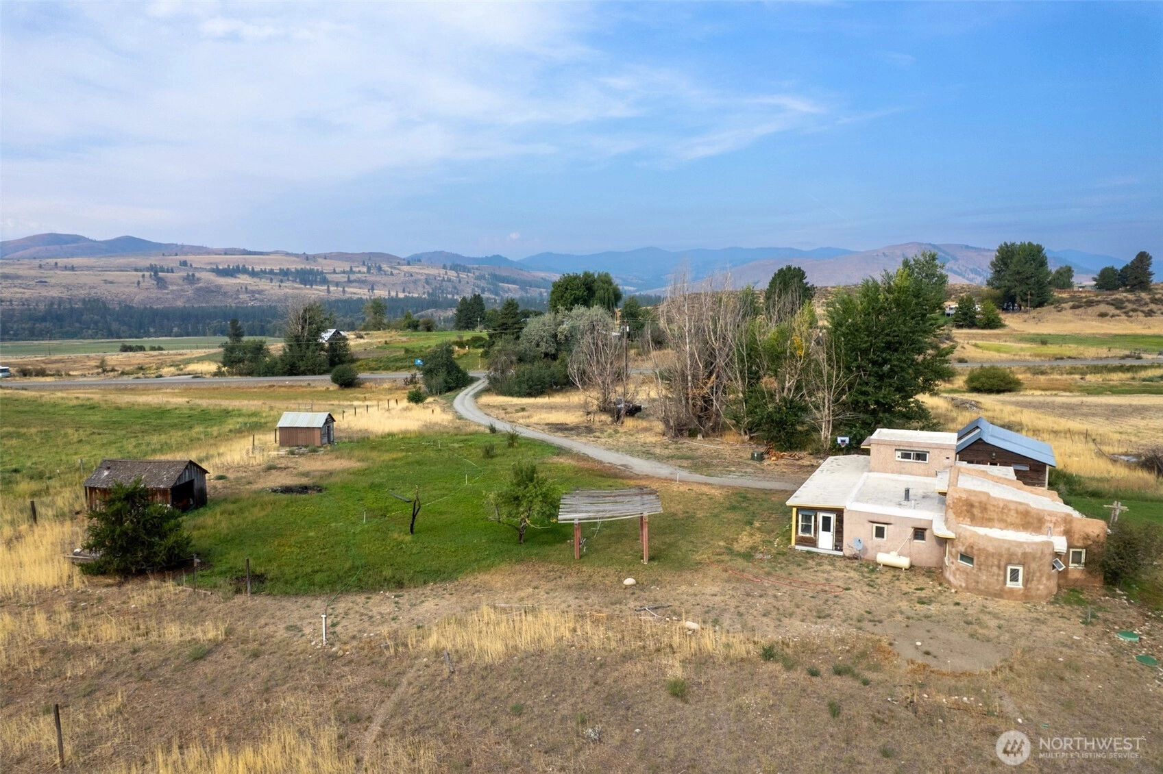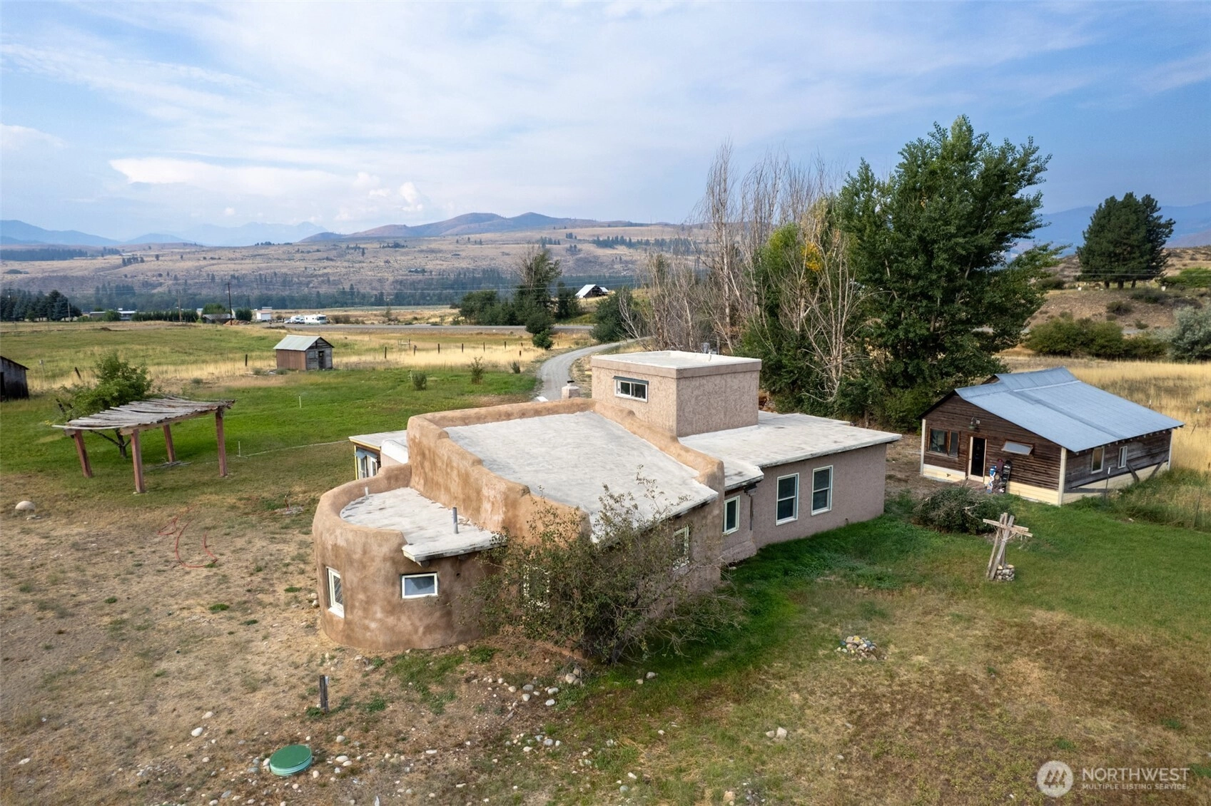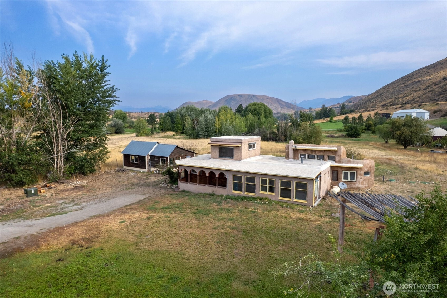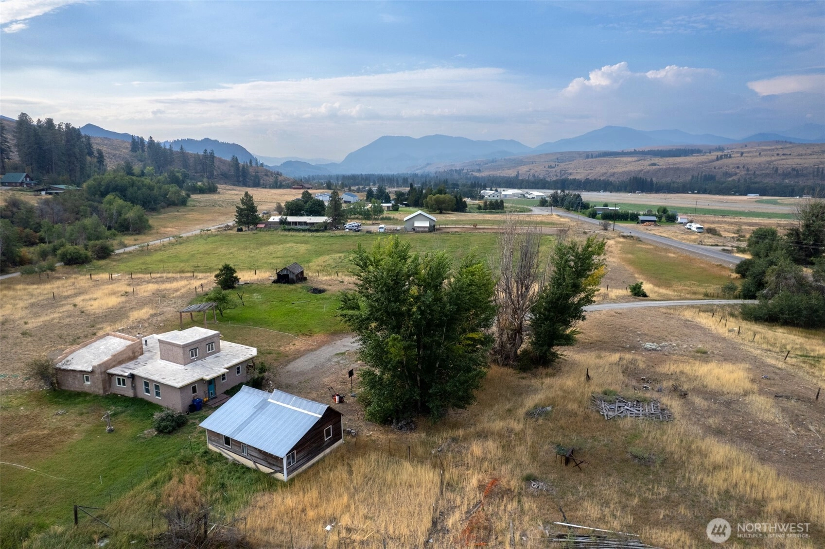 Bring your vision and build equity! This distinctive 1989 Winthrop home, crafted by local builder Doug Potter, showcases lasting quality with open beam ceilings, thick stucco walls, and artistic stacked log accents. Offering 3 bedrooms, 2 baths, a spacious laundry room, partial basement, and a light-filled second-floor study overlooking pastoral views, the home provides ample space for full-time living. This 3.7-acre flat parcel, irrigated by the Chewuch Canal, has the potential to become entirely green and could easily support a hobby farm or garden. A 875 sq ft outbuilding with power is ready to transform into an office, studio, or gym. Thoughtful improvements here will reward you well in this beloved corner of the Methow Valley.
