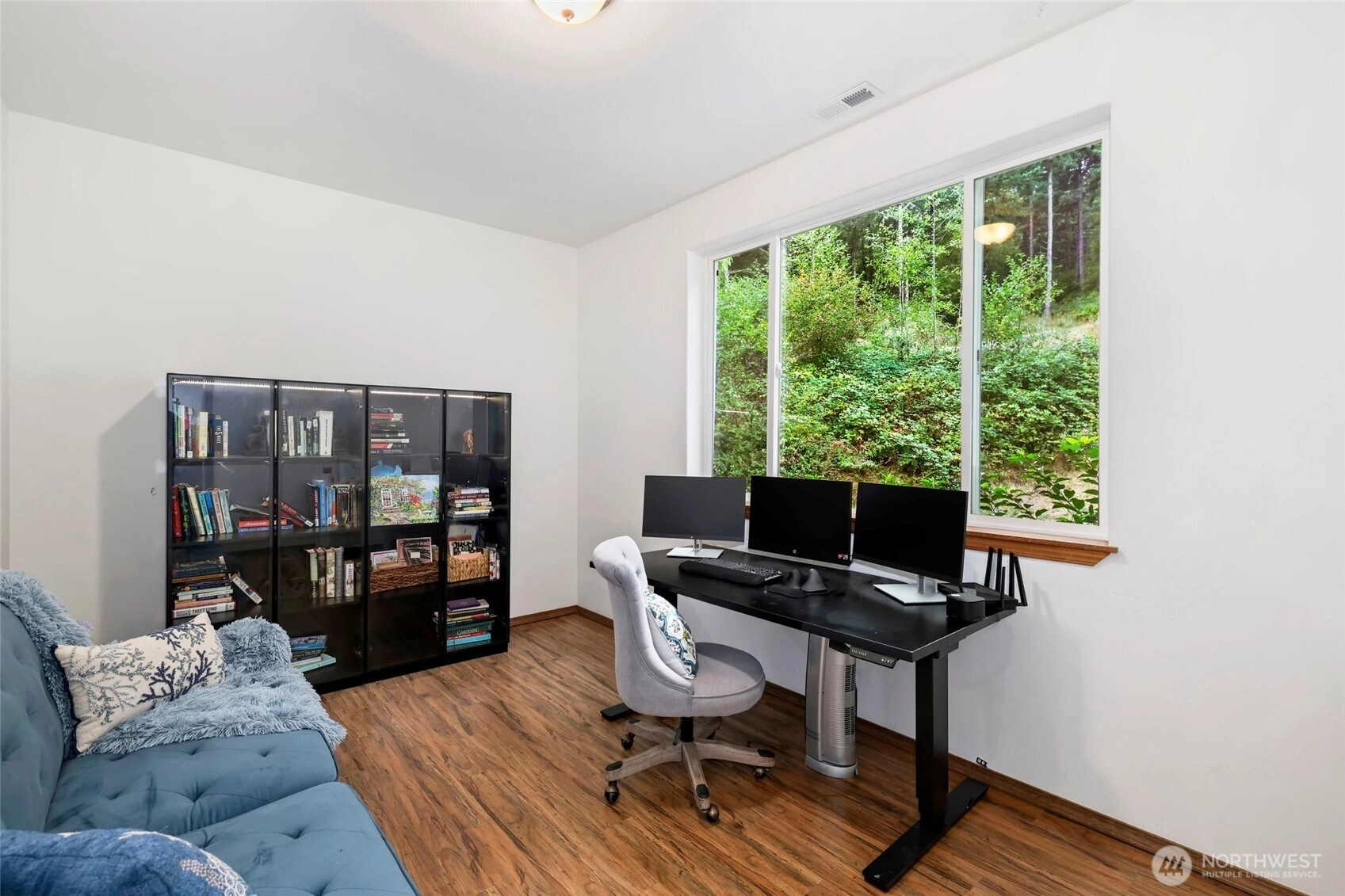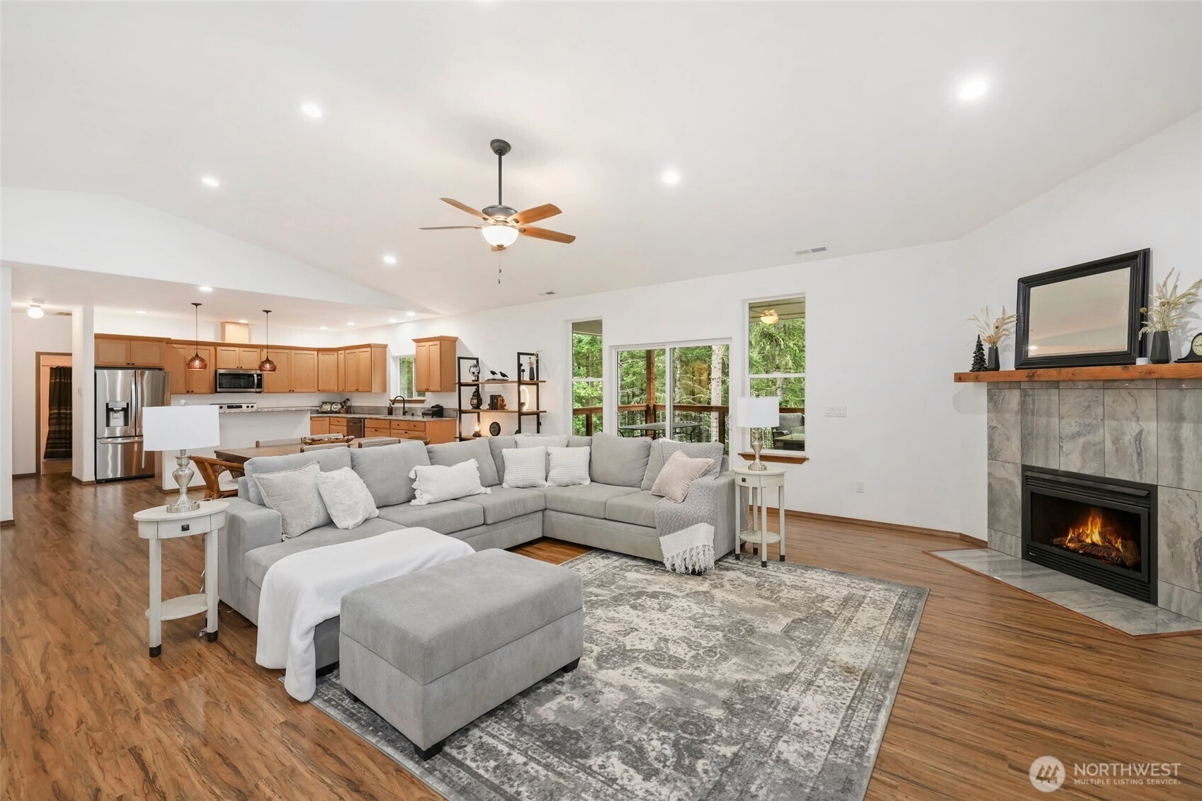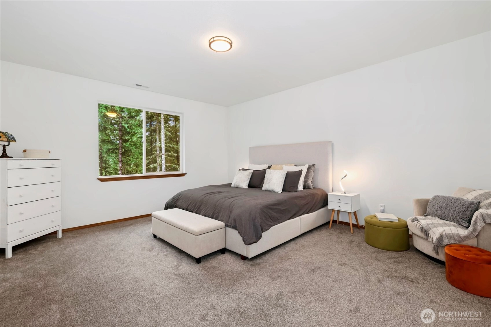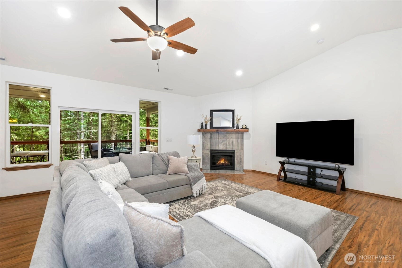 Welcome to your ultimate forest sanctuary on 6.7 acres of PNW splendor, surrounded by towering trees in a gated community with privacy, security, and scenic walking trails. A covered porch opens to a grand entry with soaring ceilings & a wall of windows framing serene forest views. The open-concept living room, dining area, & chef’s kitchen are ideal for entertaining, while a fireplace and covered deck extend living year-round. The private primary suite offers a soaking tub, luxe shower, dual vanities, & walk-in closet. A light-filled office with forest views, plus two guest suites on the opposite side of the house, each with their own bath, provide perfect multi-generational living. A spacious laundry & half bath complete this refined plan