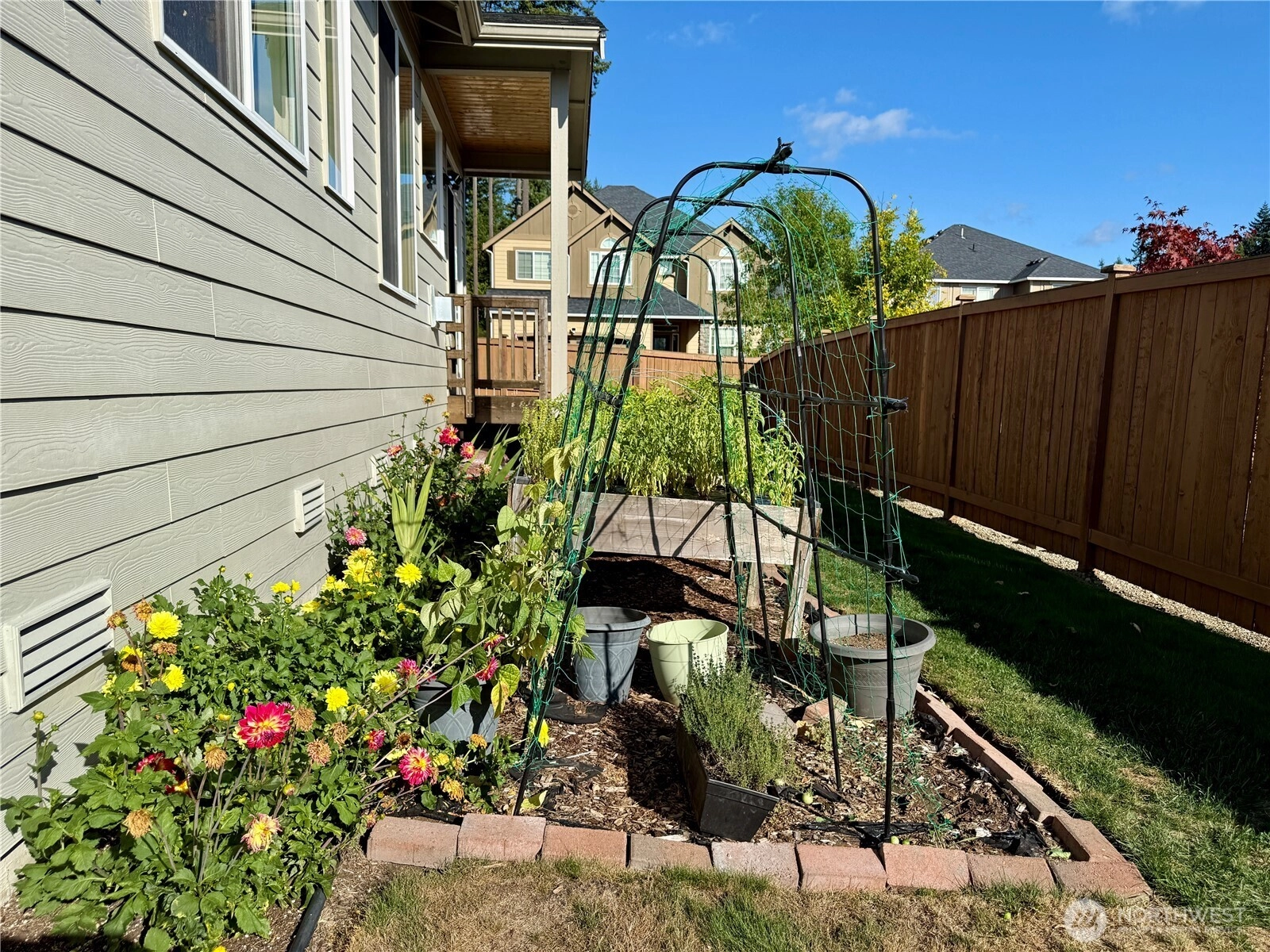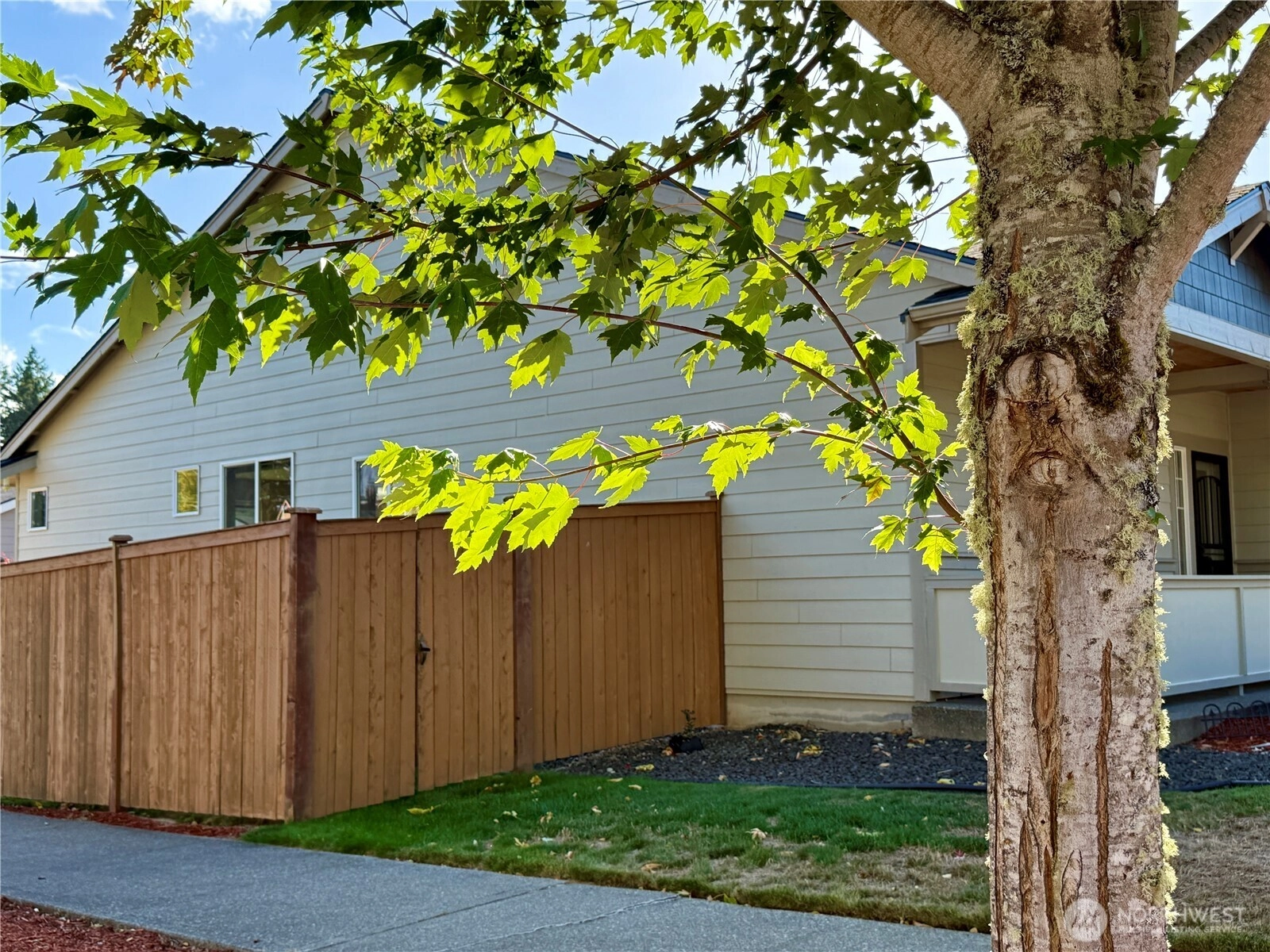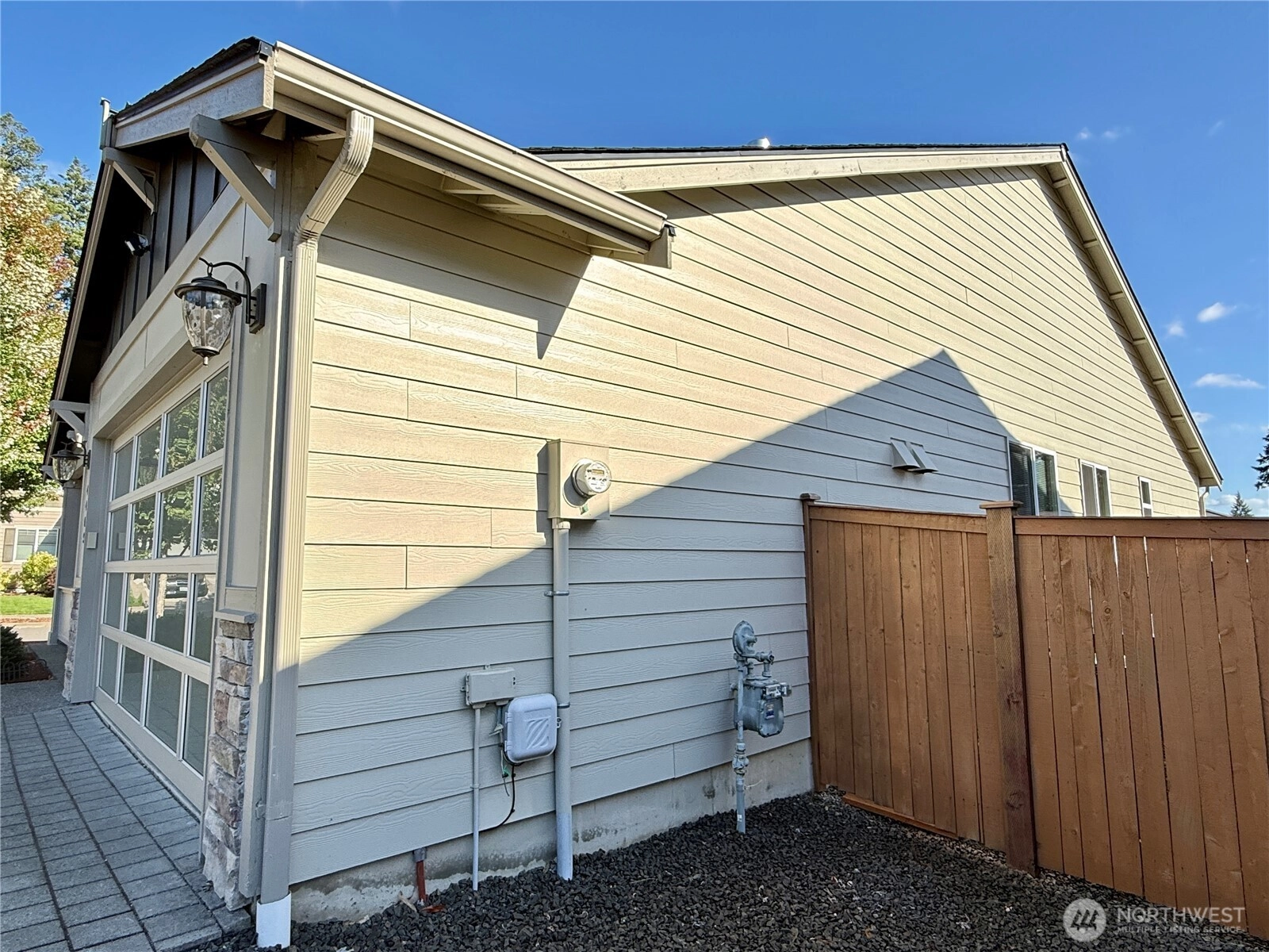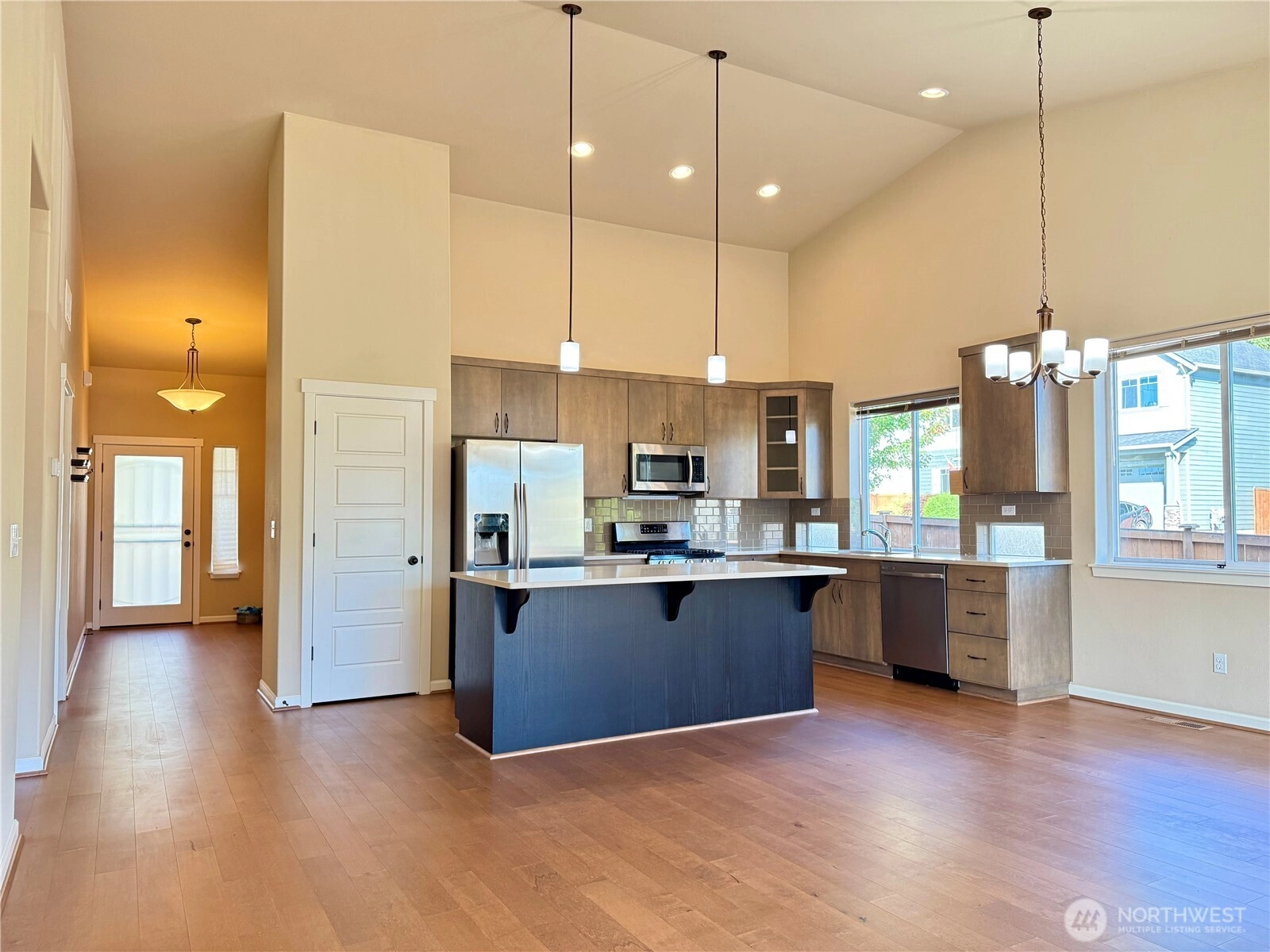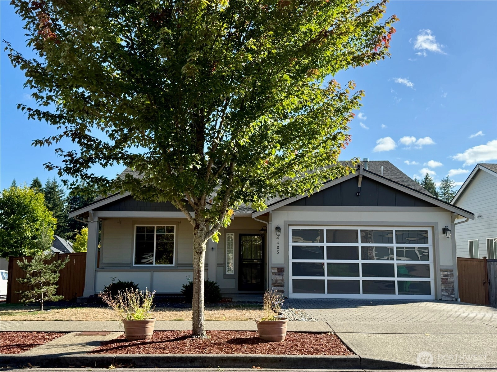 Extremely well maintained home in Evergreen Pointe with hardwood floors, quartz counters & stainless appliances. Sunny windows all around & natural gas fireplace in this energy efficient home. Cabinets with soft close doors & drawers. Gorgeous paver driveway leading to top of the line matching translucent garage and front doors. Enter through the glass/screen security door & take in the soaring ceilings throughout. Warm and inviting floors and cabinets with coordinating quartz counters. Primary bedroom has a large walk-in closet and 5 piece bathroom suite with extra deep soaking tub, shower & separate water closet. 6 ft cedar fence with gates, storage shed, aggregate patio & raised beds. Quaint community park and Hansen elementary nearby.