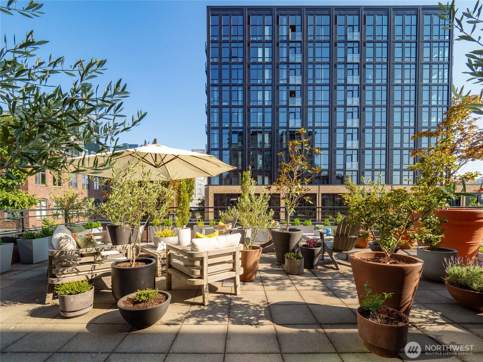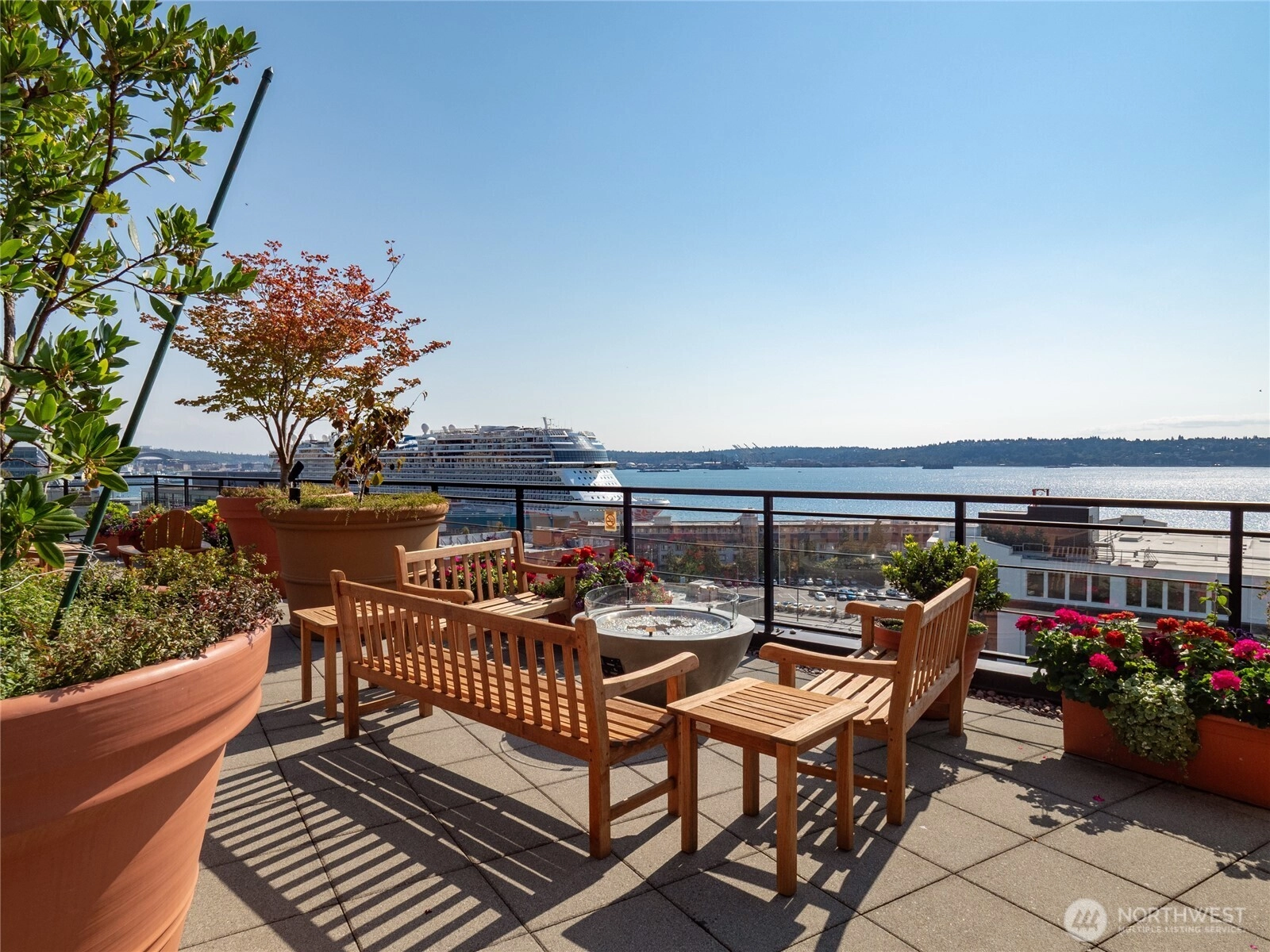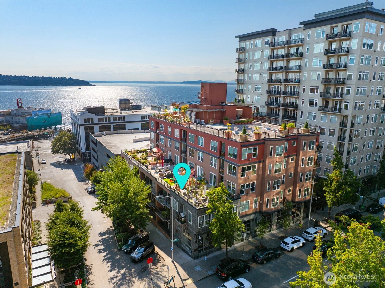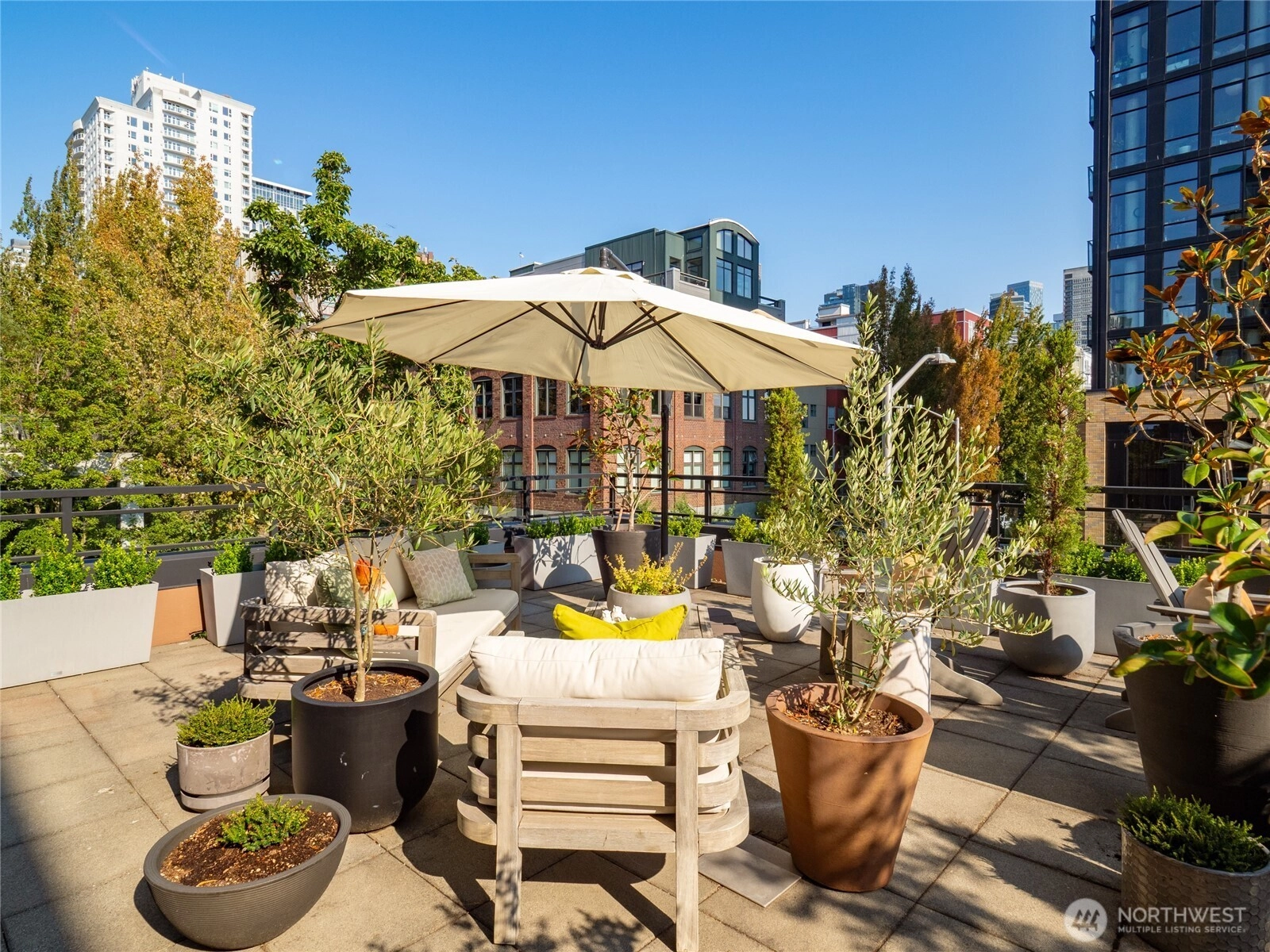 Bask in sunlight, sea breeze & stunning views from this one-of-a-kind unit at The Vine! Savor life's sweetest moments from the rare, private 660sqft terrace overlooking Elliott Bay, downtown & the Olympics; a remarkable outdoor sanctuary! French doors seamlessly connect the terrace to the bright interior, boasting large corner windows, new LVP floors, fresh paint, a gas fireplace & a chef's kitchen w/ quartz counters & stainless appliances. The versatile layout features 2 bdrms & an office nook. Parking & storage too. Fantastic bldg amenities include a rooftop deck & lounge w/ breathtaking views, 24hr concierge, guest suites, a gym & more! Immerse yourself in the vibrant energy of the city, then unwind in the calm of your peaceful retreat.