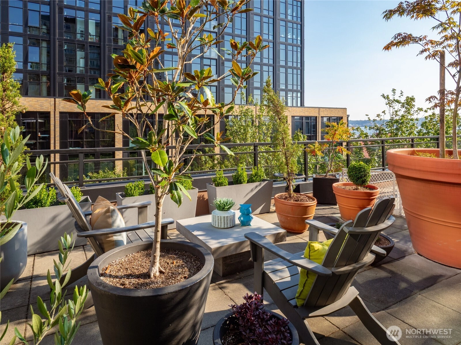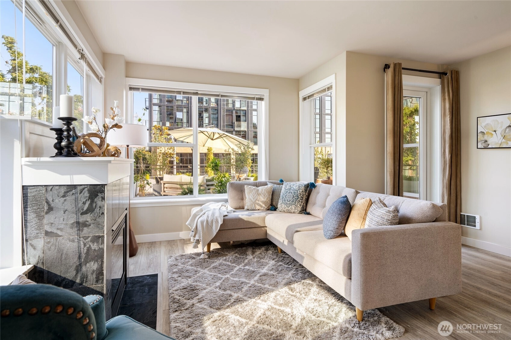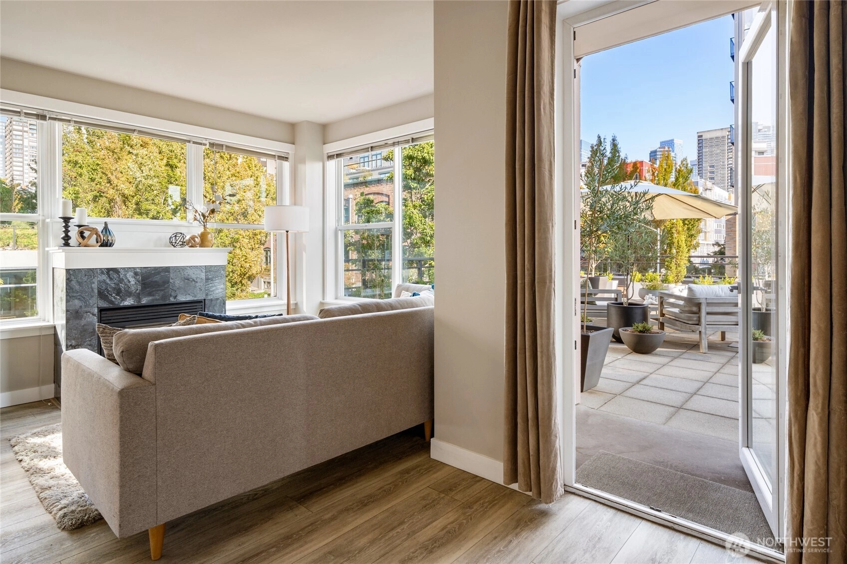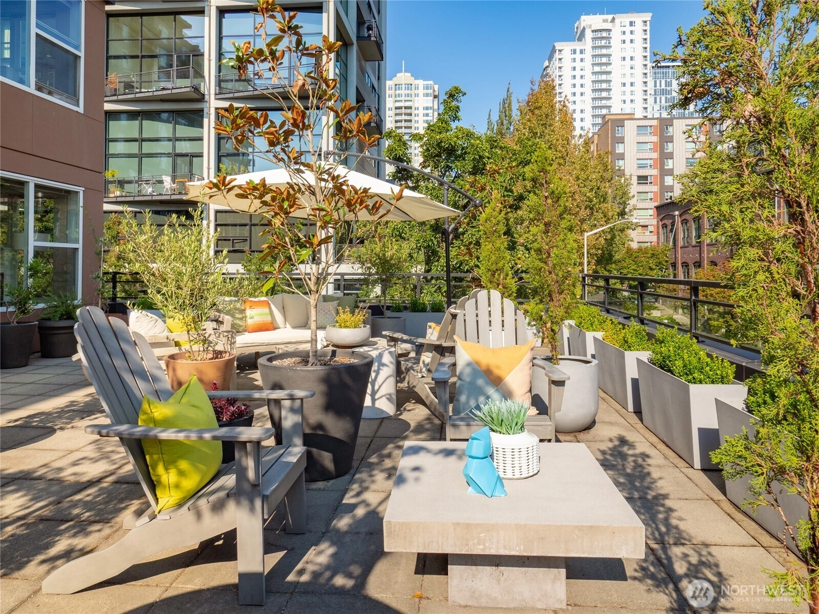 Bask in sunlight, sea breeze & stunning views from this one-of-a-kind unit at The Vine! Savor life's sweetest moments from the rare, private 660sqft terrace overlooking Elliott Bay, downtown & the Olympics; a remarkable outdoor sanctuary! French doors seamlessly connect the terrace to the bright interior, boasting large corner windows, new LVP floors, fresh paint, a gas fireplace & a chef's kitchen w/ quartz counters & stainless appliances. The versatile layout features 2 bdrms & an office nook. Parking & storage too. Fantastic bldg amenities include a rooftop deck & lounge w/ breathtaking views, 24hr concierge, guest suites, a gym & more! Immerse yourself in the vibrant energy of the city, then unwind in the calm of your peaceful retreat.