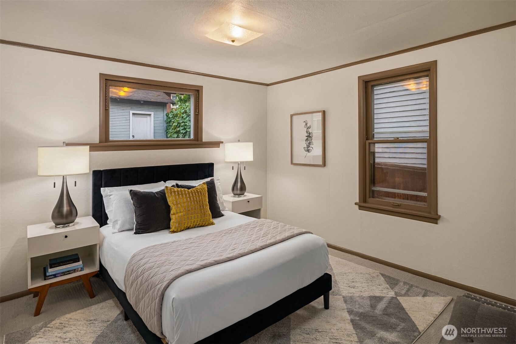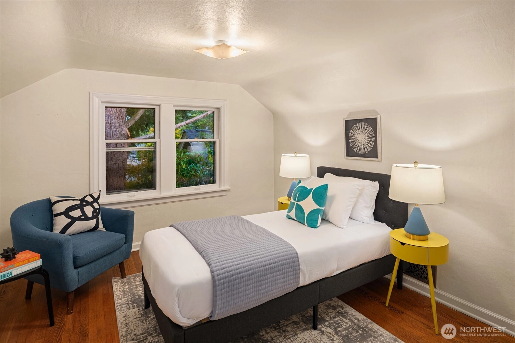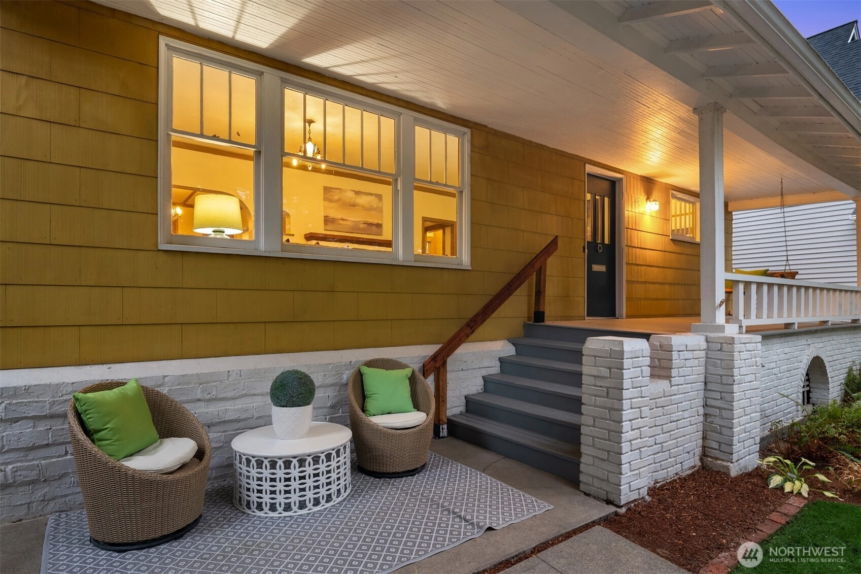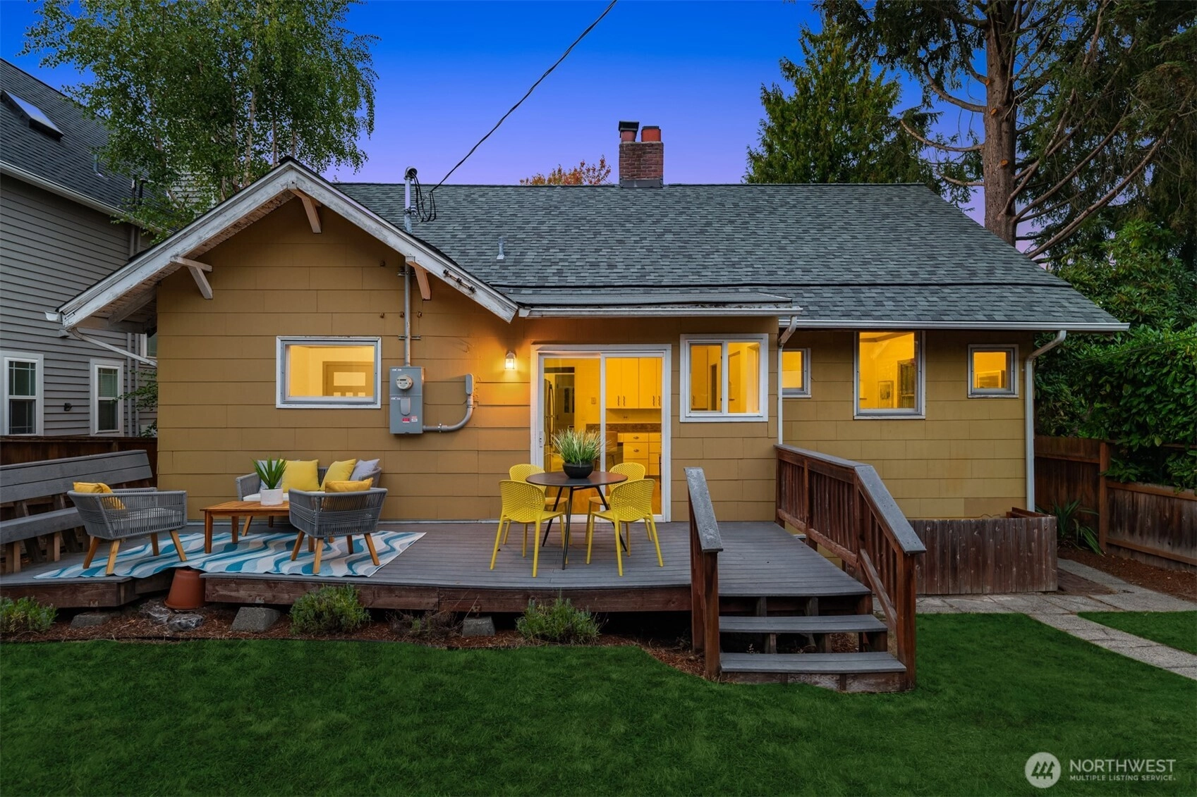 All the charm + character is still intact in this stunning Green Lake Craftsman. Captivating curb appeal with mature landscaping + inviting front porch. Sunlight streaming through expansive windows bathes interior. Classic design elements include vintage chandeliers, fireplace + built-in bookcases. Oak hardwoods are ready to be uncovered. Updated kitchen with stainless appliances, gas range, white cabinetry + breakfast bar. Two bedrooms + full bath on main level. Upstairs are two additional bedrooms + a bonus space to use as den, office or studio. Outside is a private deck for enjoying BBQs + vegetable gardens. Unfinished basement has great potential. Blocks to park + Green Lake Village.