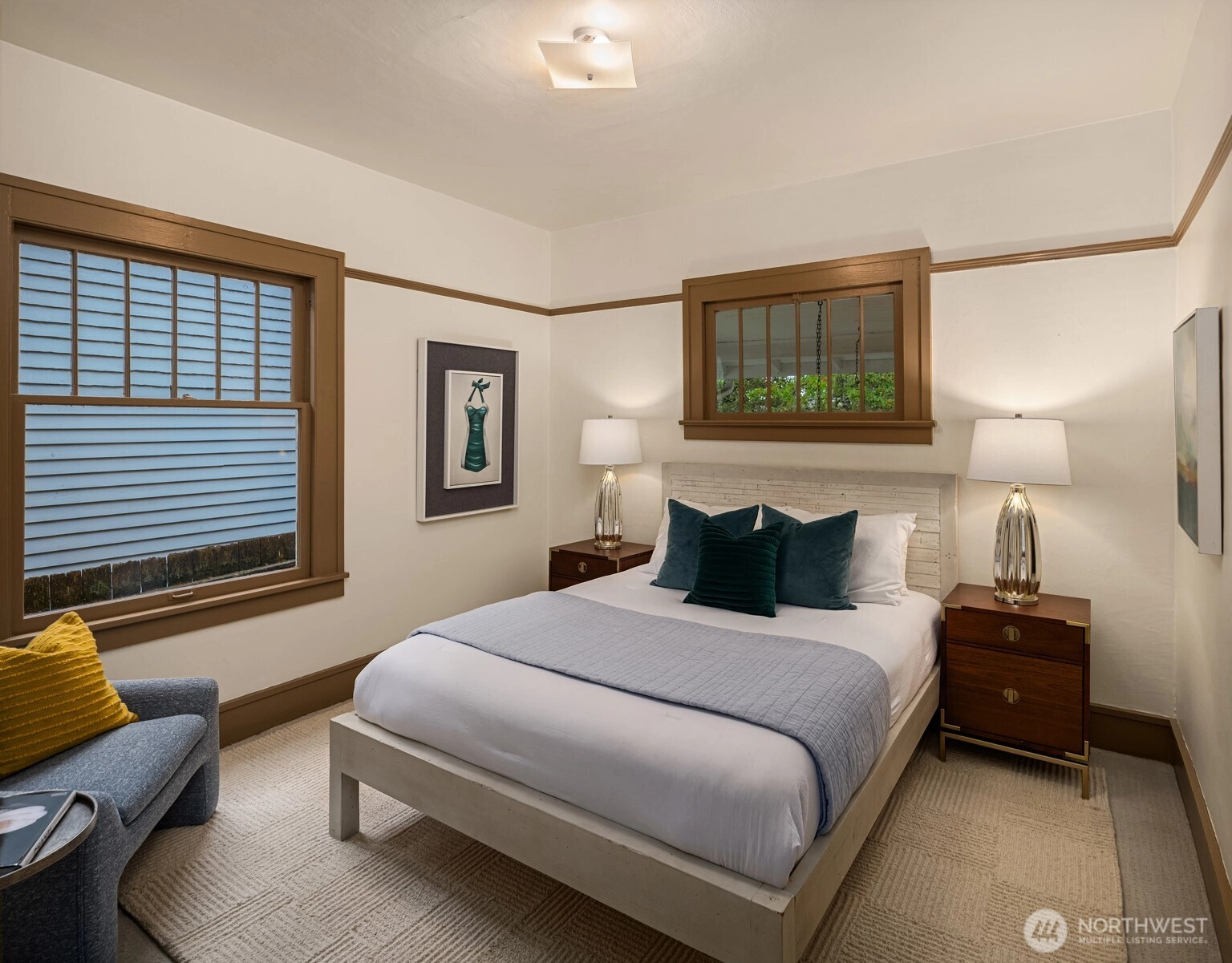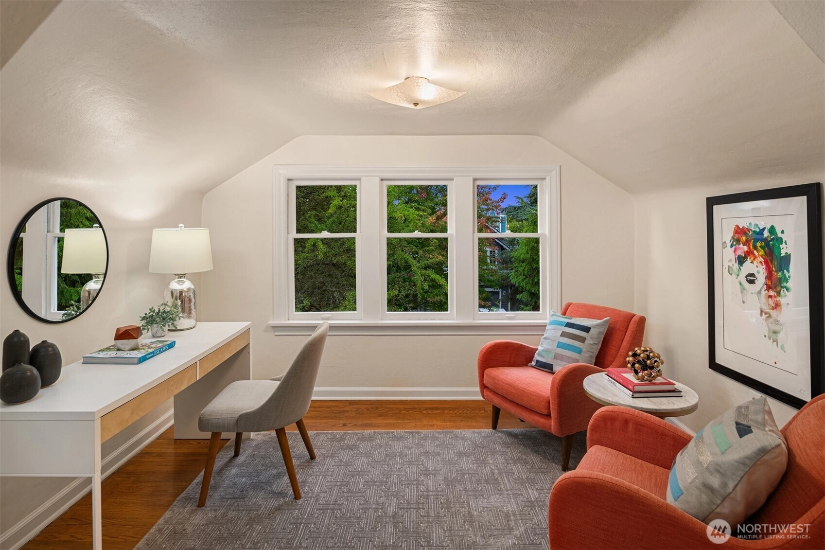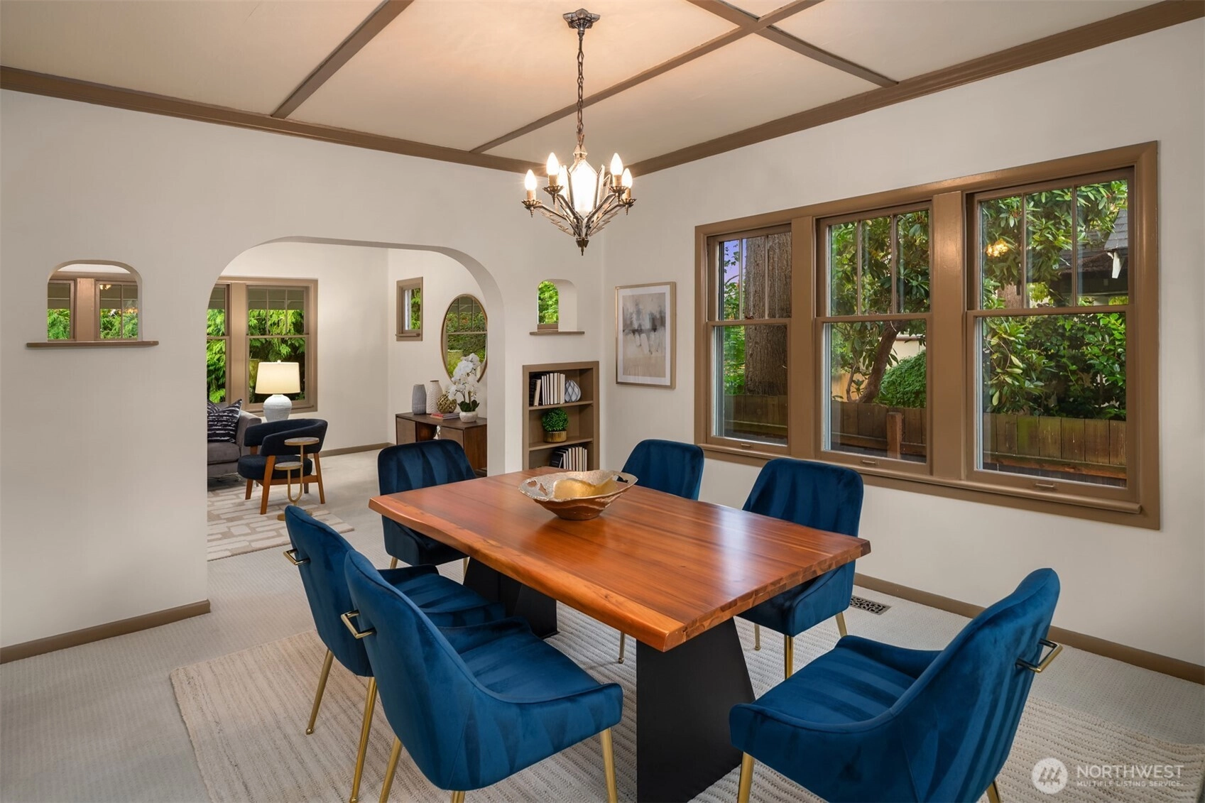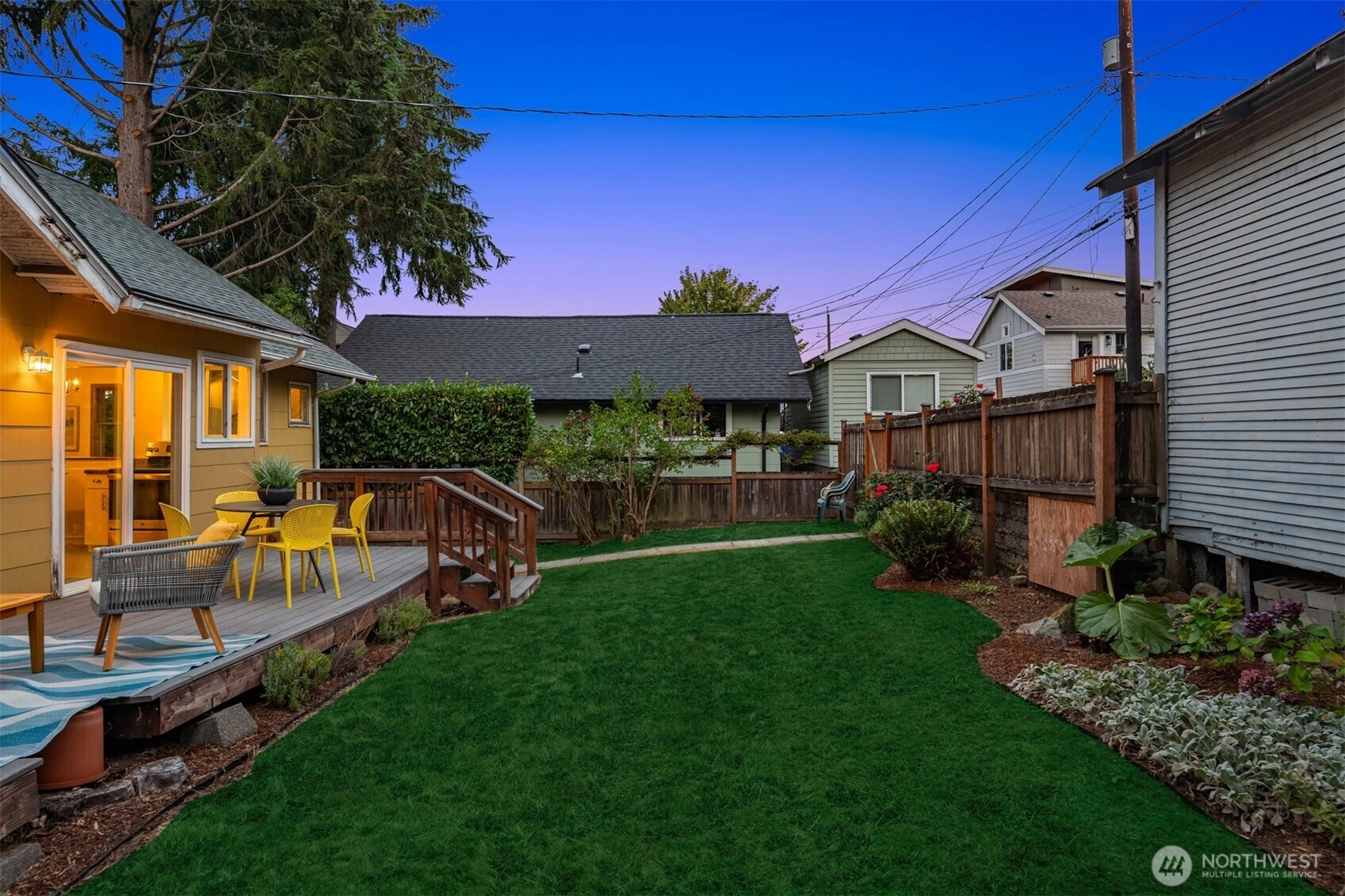 All the charm + character is still intact in this stunning Green Lake Craftsman. Captivating curb appeal with mature landscaping + inviting front porch. Sunlight streaming through expansive windows bathes interior. Classic design elements include vintage chandeliers, fireplace + built-in bookcases. Oak hardwoods are ready to be uncovered. Updated kitchen with stainless appliances, gas range, white cabinetry + breakfast bar. Two bedrooms + full bath on main level. Upstairs are two additional bedrooms + a bonus space to use as den, office or studio. Outside is a private deck for enjoying BBQs + vegetable gardens. Unfinished basement has great potential. Blocks to park + Green Lake Village.