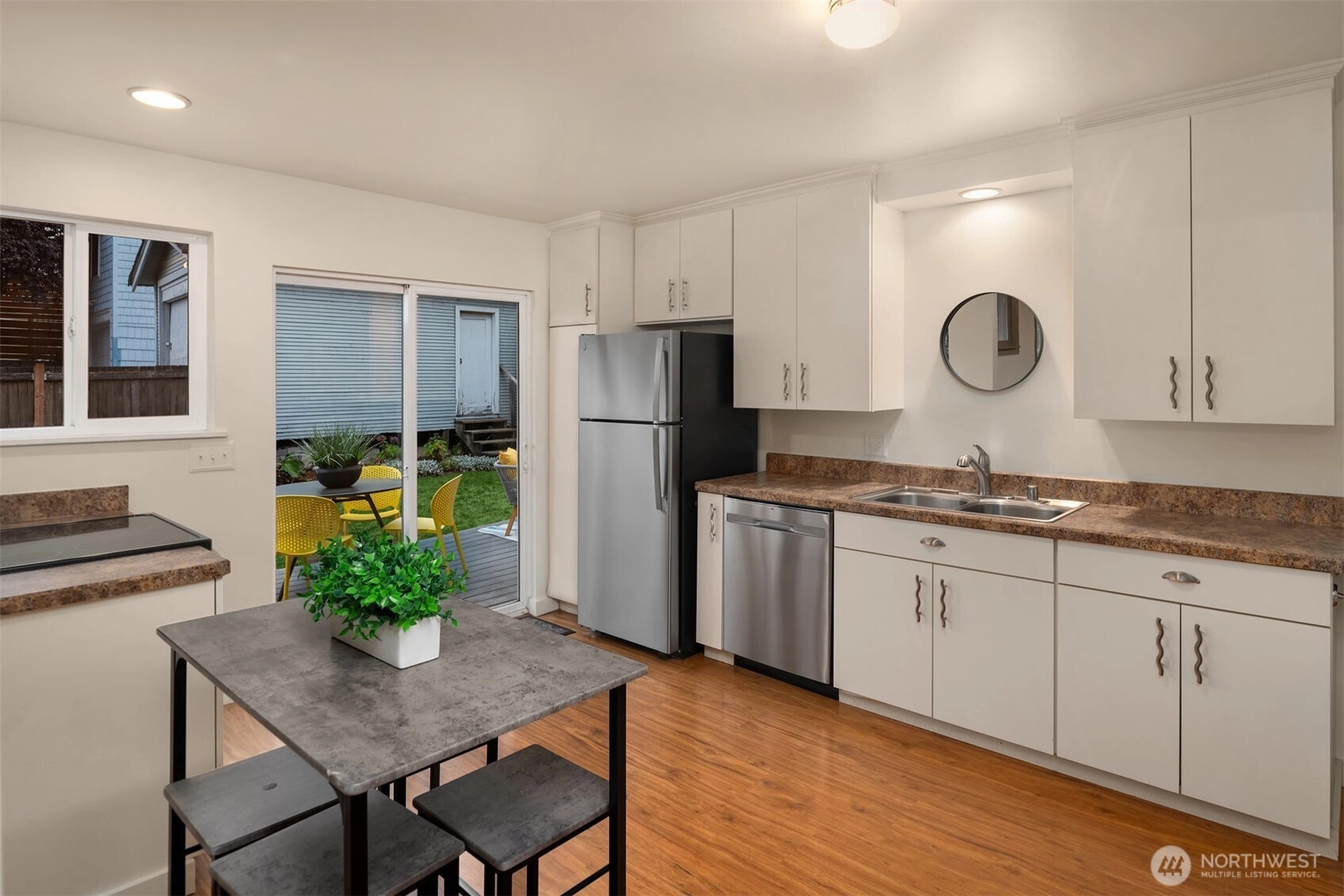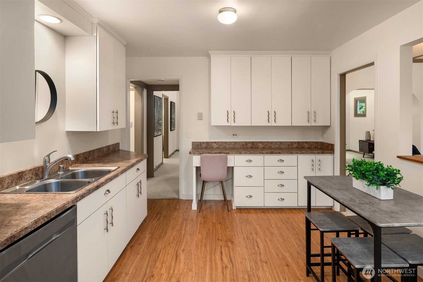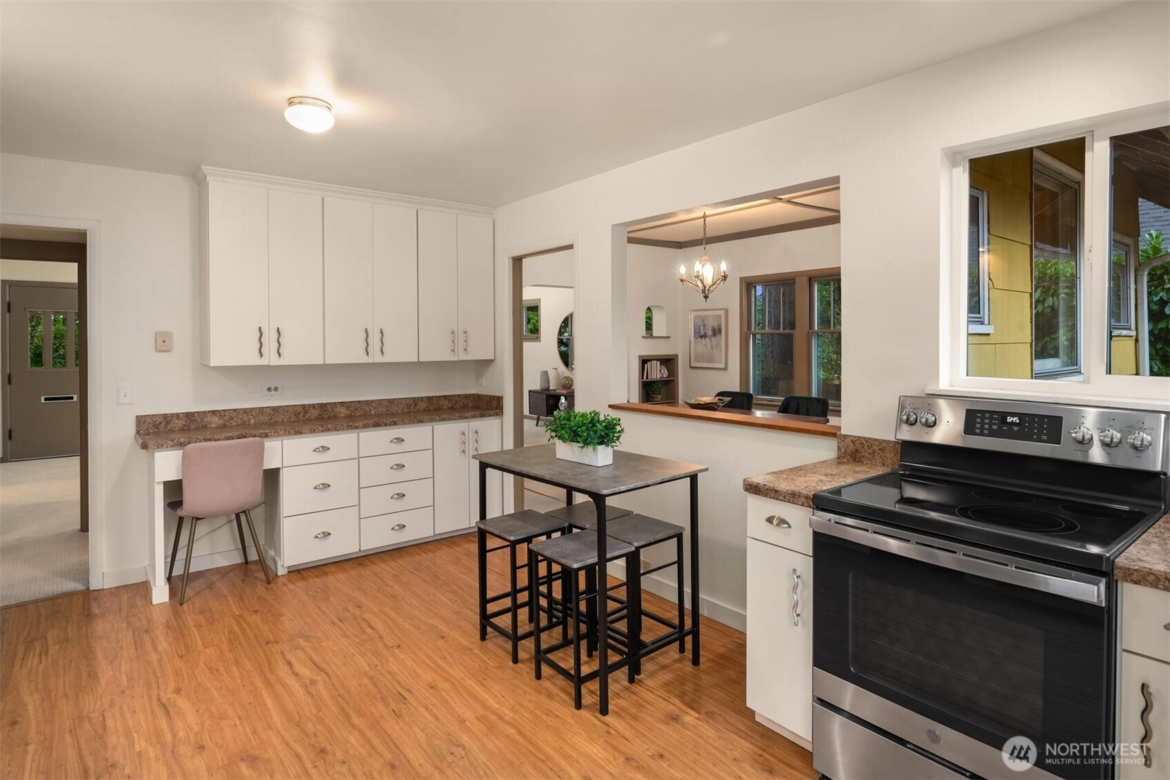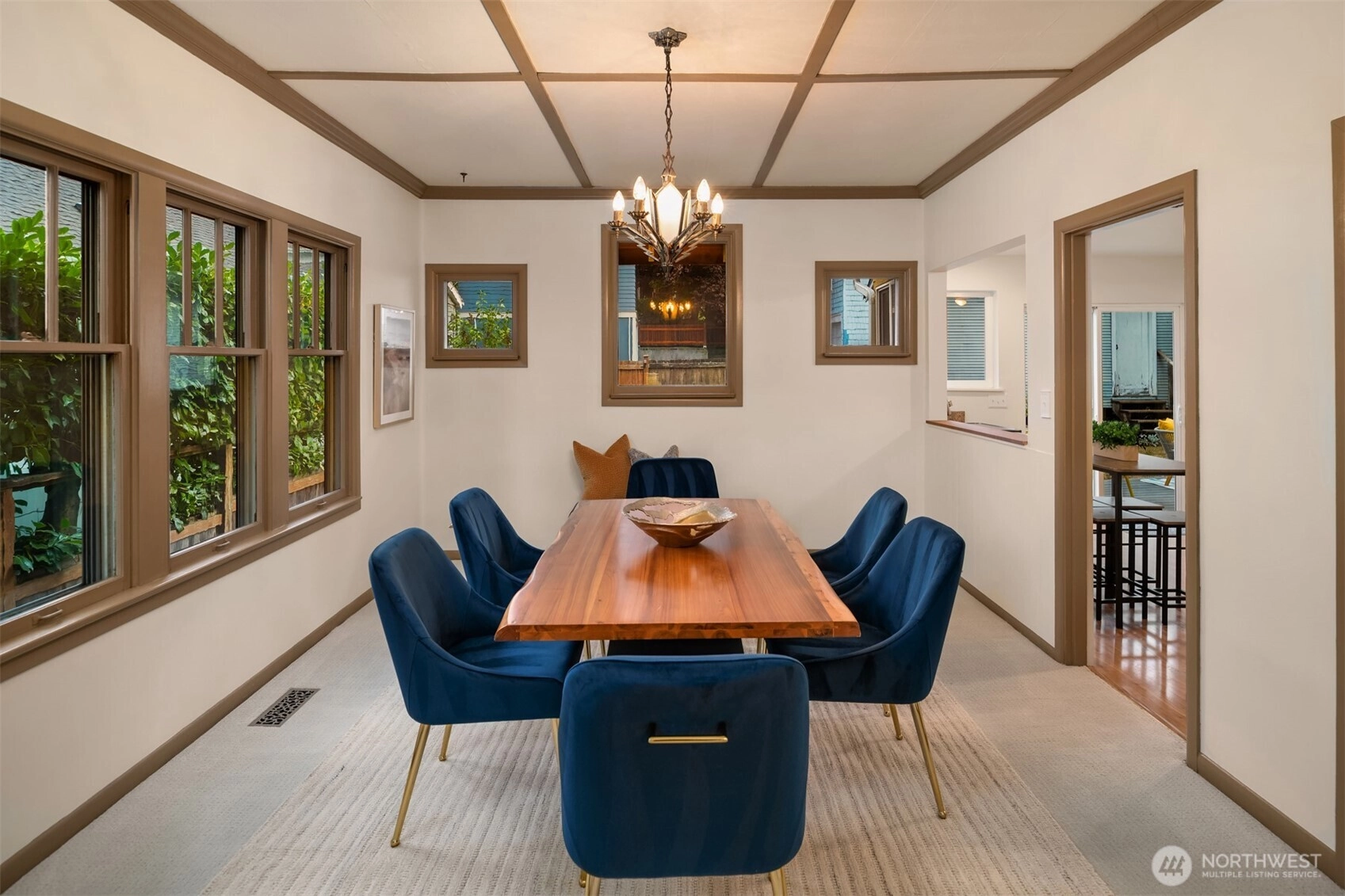 All the charm + character is still intact in this stunning Green Lake Craftsman. Captivating curb appeal with mature landscaping + inviting front porch. Sunlight streaming through expansive windows bathes interior. Classic design elements include vintage chandeliers, fireplace + built-in bookcases. Oak hardwoods are ready to be uncovered. Updated kitchen with stainless appliances, gas range, white cabinetry + breakfast bar. Two bedrooms + full bath on main level. Upstairs are two additional bedrooms + a bonus space to use as den, office or studio. Outside is a private deck for enjoying BBQs + vegetable gardens. Unfinished basement has great potential. Blocks to park + Green Lake Village.