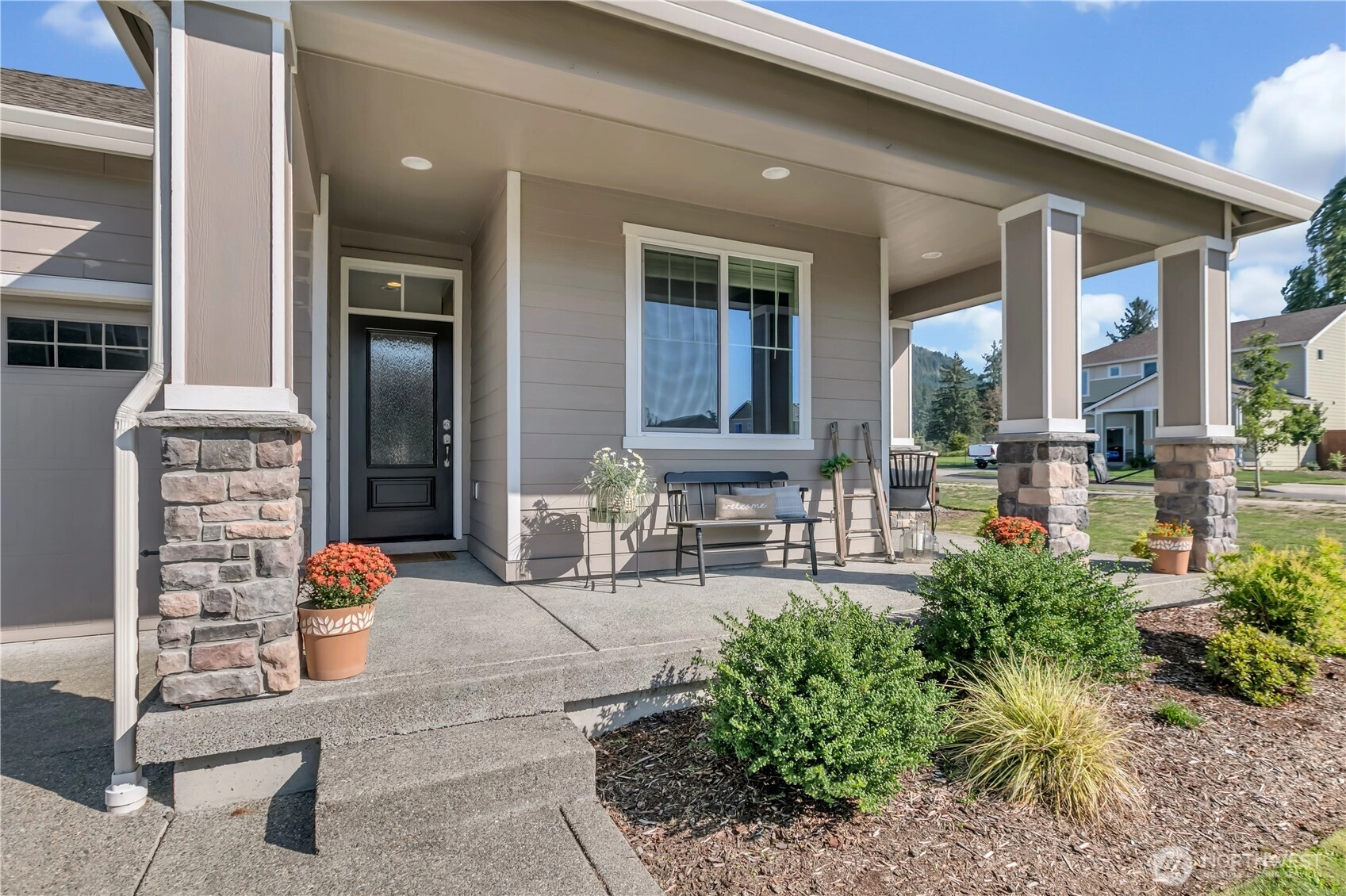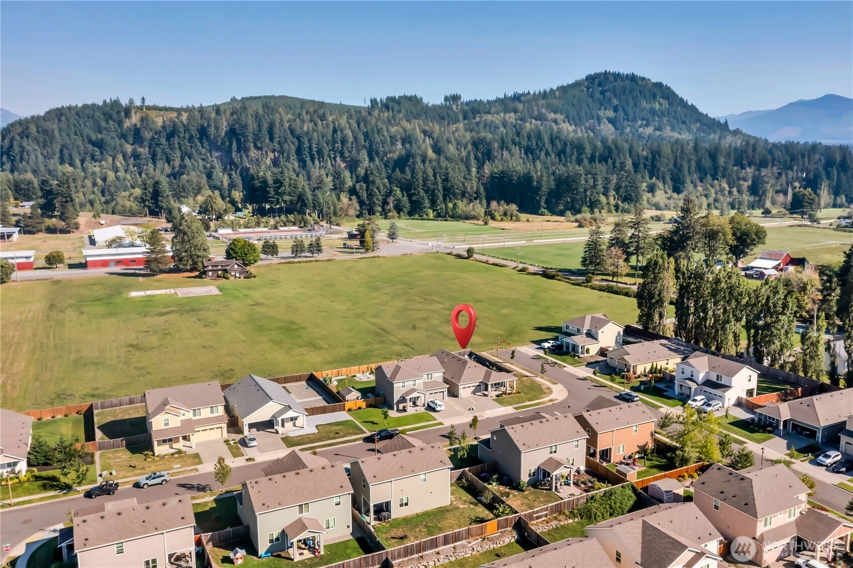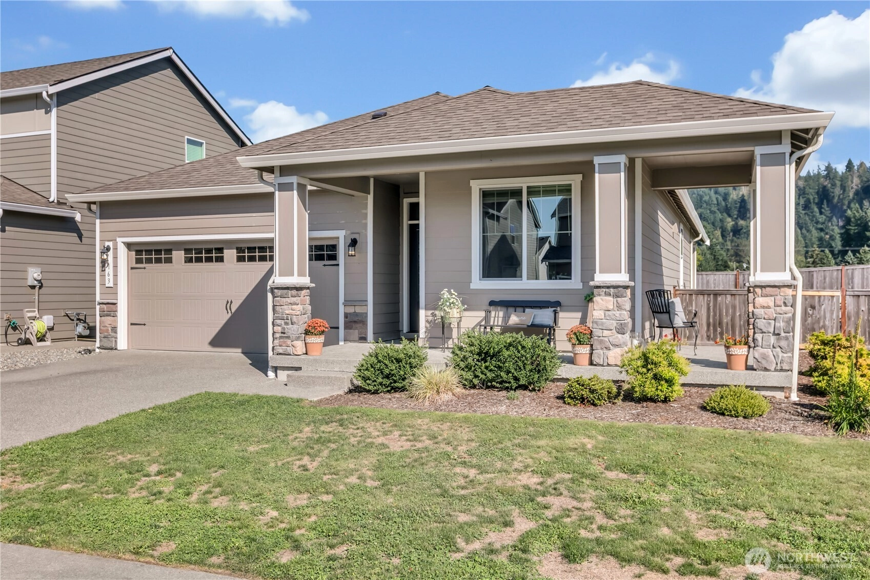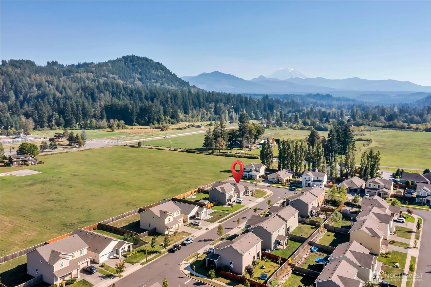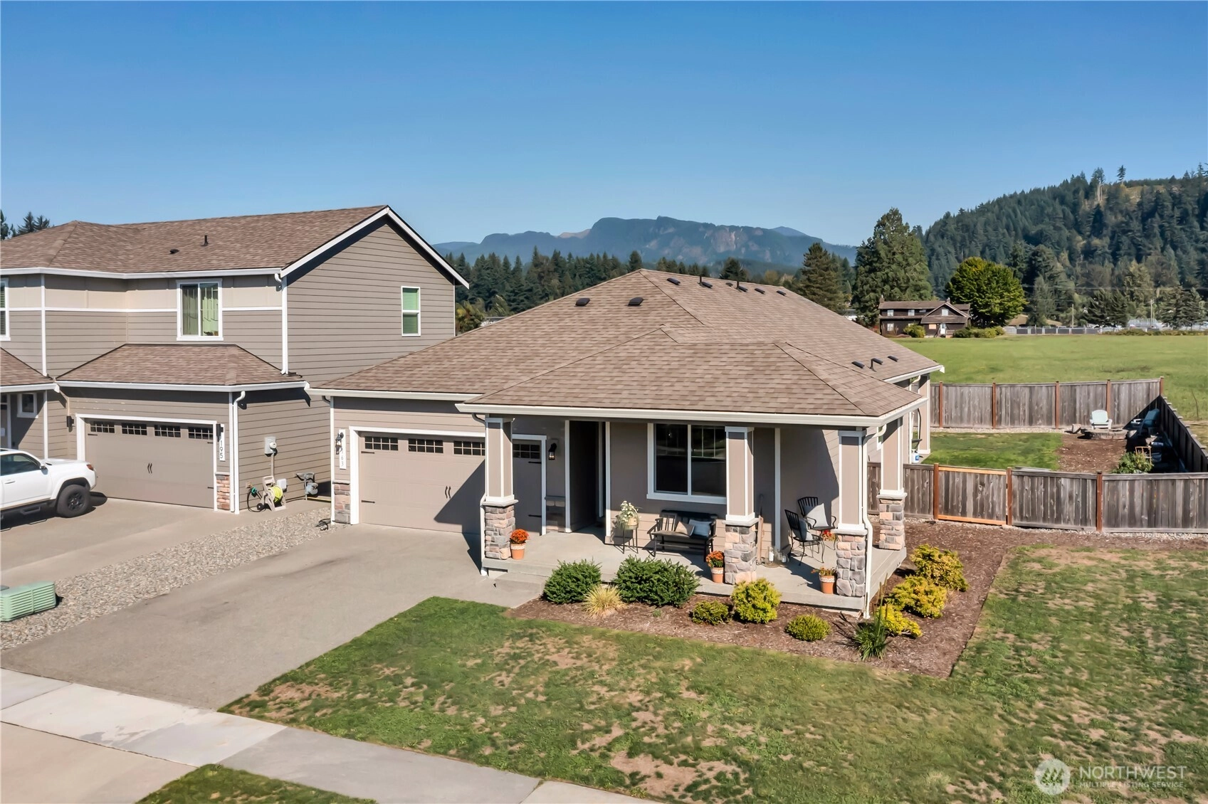 Nestled at the base of Mt. Peak in the scenic Suntop Farms neighborhood, this inviting corner lot RAMBLER offers the perfect blend of comfort & community! Find 1,480 sqft of open living space, 3 beds & 2 full baths, all on a fully fenced lot w/ NO rear neighbors! Inside find formal living & dining rooms, kitchen w/ SS appliances, quartz counters, custom tile backsplash & convenient pantry. Durable LVP flooring throughout the main living areas & newer carpet in bedrooms. Primary suite features 5-piece bath & walk-in closet. Outside enjoy the fenced backyard w/ covered patio. 2 car garage provides more room for storage w/ custom racks. Stay comfy year-round w/ new AC! Just minutes from downtown Enumclaw, walking trails, shopping and schools!