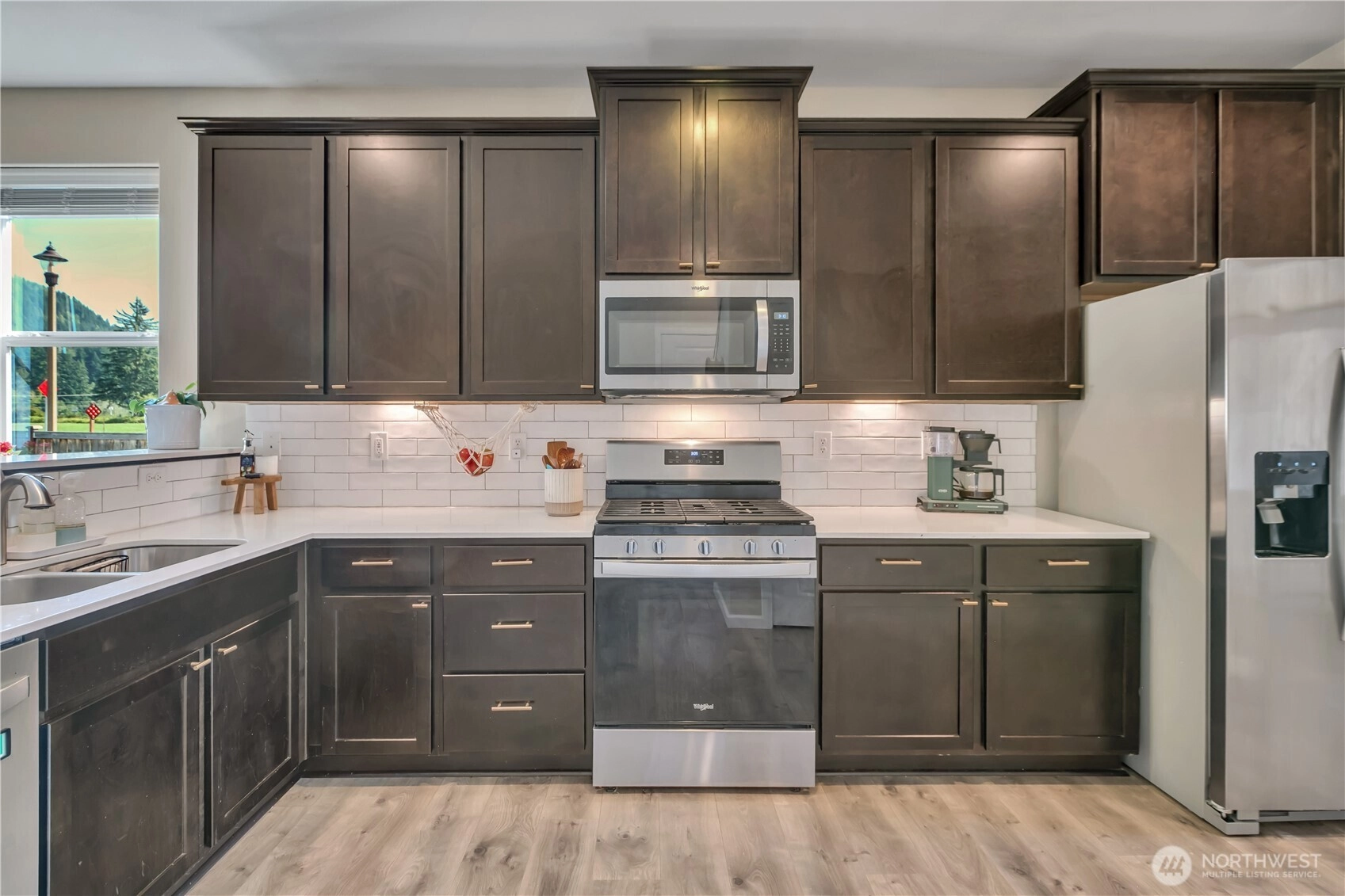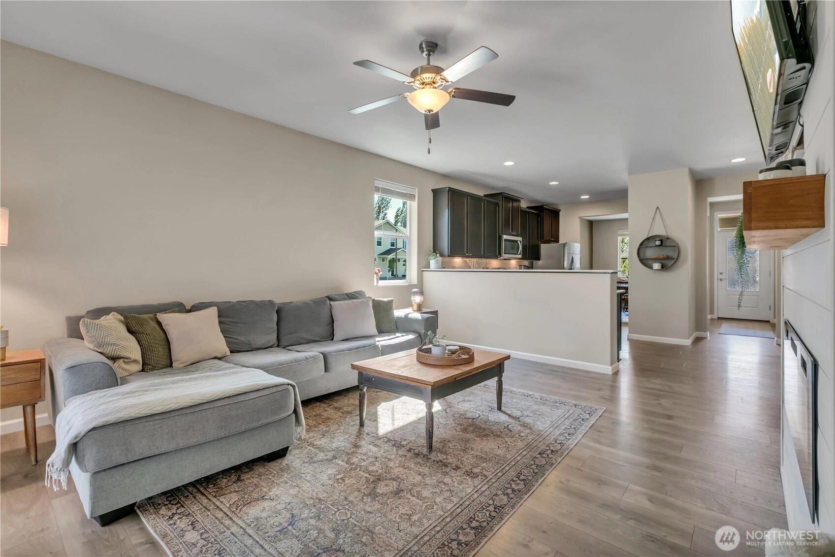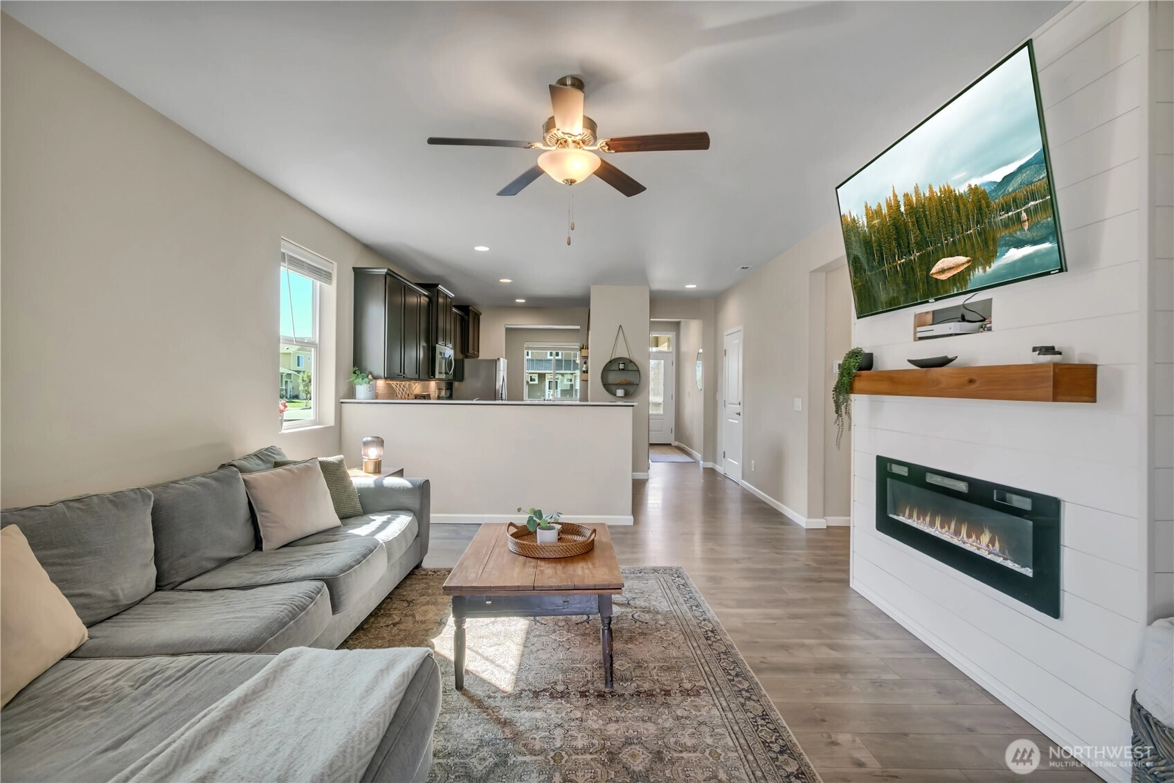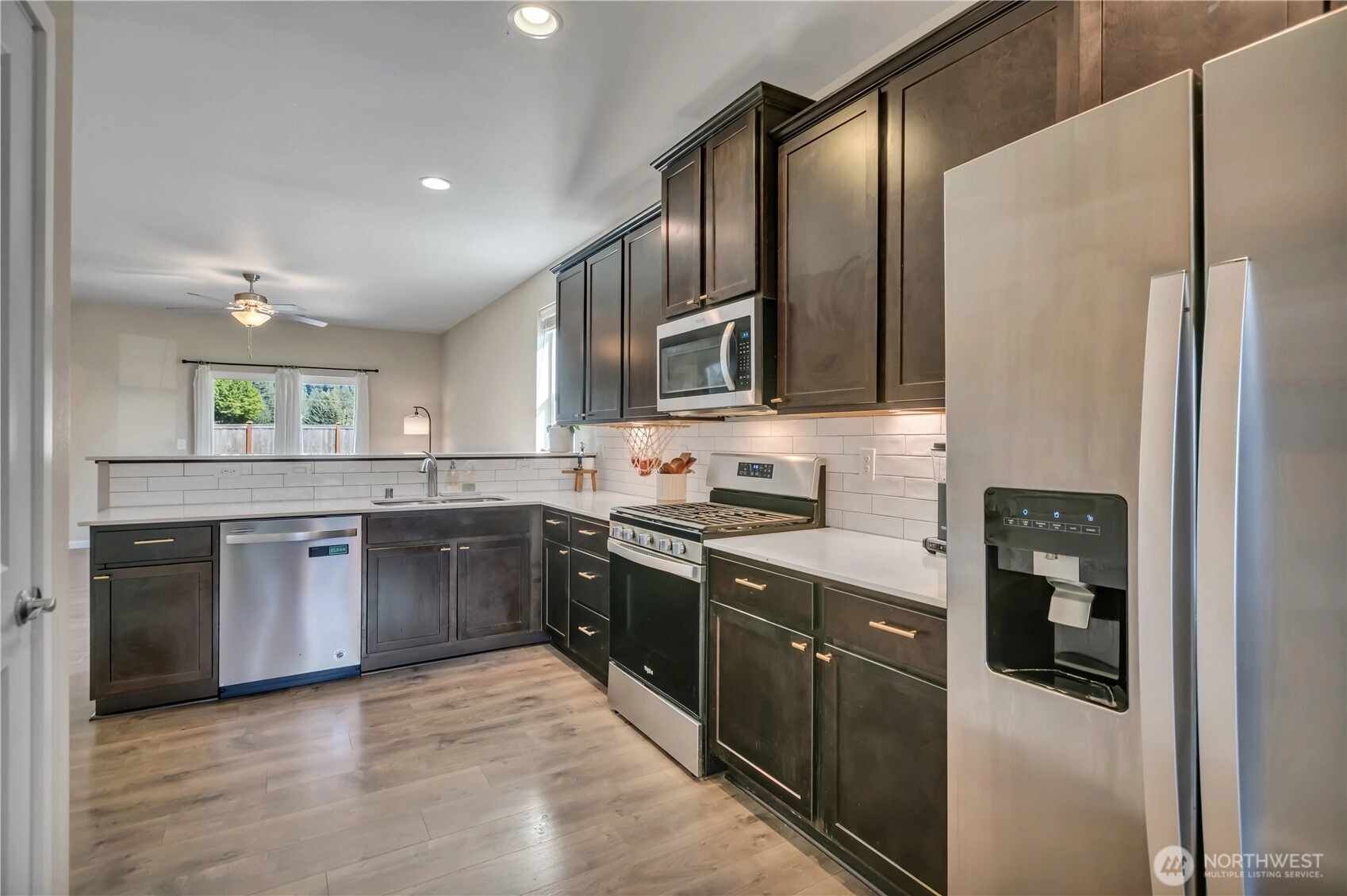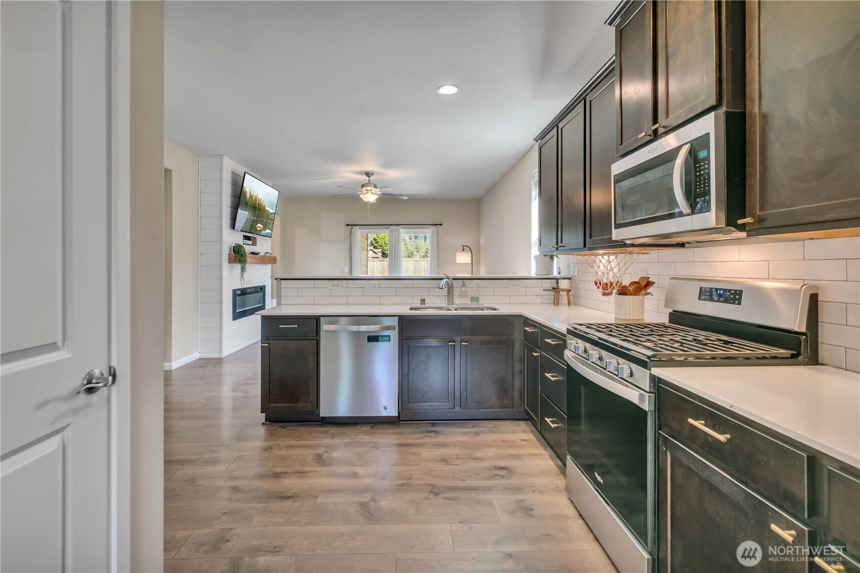 Nestled at the base of Mt. Peak in the scenic Suntop Farms neighborhood, this inviting corner lot RAMBLER offers the perfect blend of comfort & community! Find 1,480 sqft of open living space, 3 beds & 2 full baths, all on a fully fenced lot w/ NO rear neighbors! Inside find formal living & dining rooms, kitchen w/ SS appliances, quartz counters, custom tile backsplash & convenient pantry. Durable LVP flooring throughout the main living areas & newer carpet in bedrooms. Primary suite features 5-piece bath & walk-in closet. Outside enjoy the fenced backyard w/ covered patio. 2 car garage provides more room for storage w/ custom racks. Stay comfy year-round w/ new AC! Just minutes from downtown Enumclaw, walking trails, shopping and schools!
