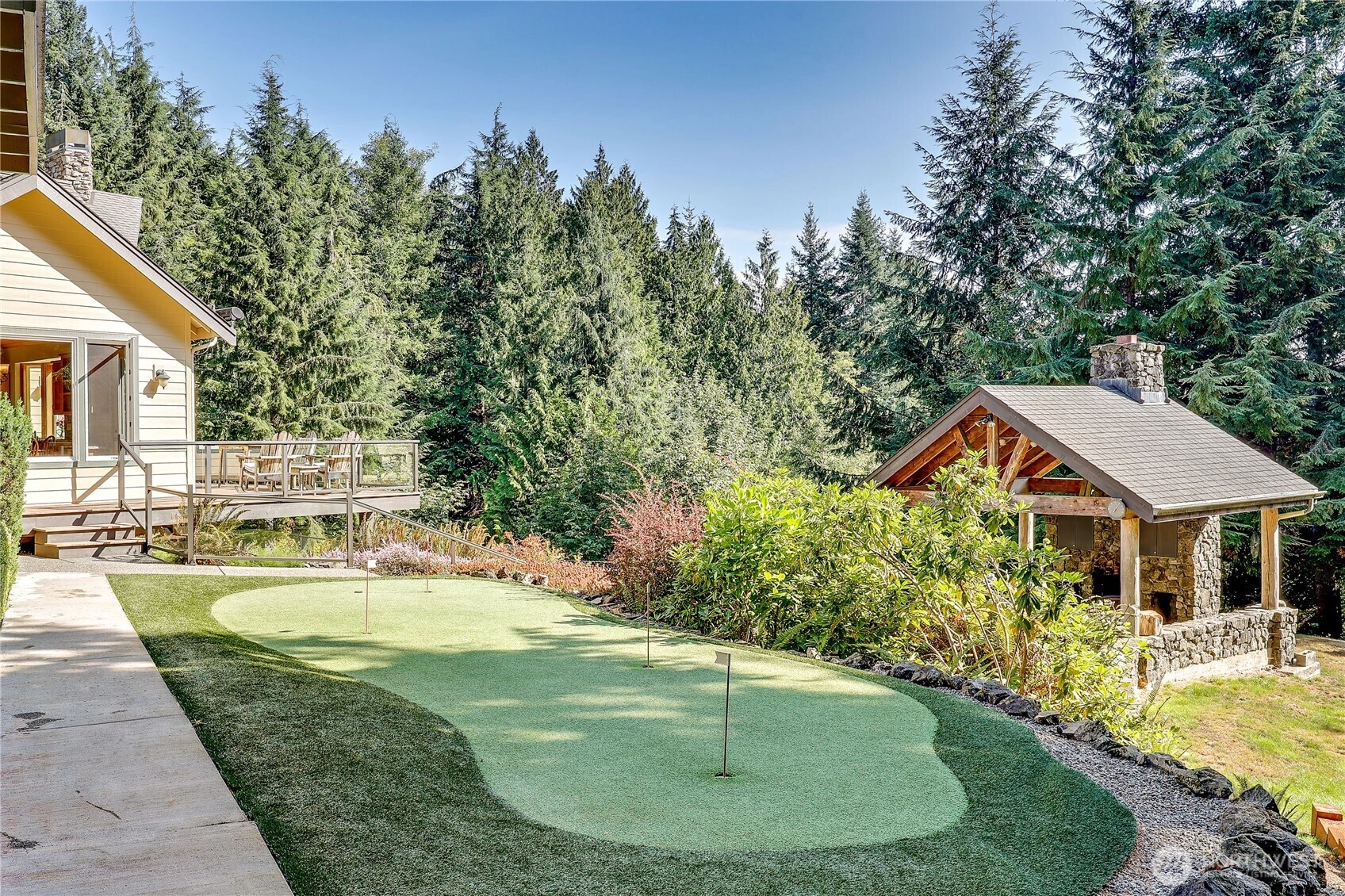 Experience refined living in Port Ludlow on 5.08 serene acres with a guest suite offering private entrance, full kitchen, bath, and laundry. The main residence showcases hardwood and tile floors, vaulted wood ceilings, expansive windows, and two interior fireplaces. A spacious balcony invites relaxation among the trees, while the gazebo with fireplace and a putting green create an entertainer’s retreat. The 3-car garage adds practicality to this elegant setting. Minutes from resort amenities, golf, and the marina, this property blends Northwest beauty with ultimate quite, comfort, style, and functionality.