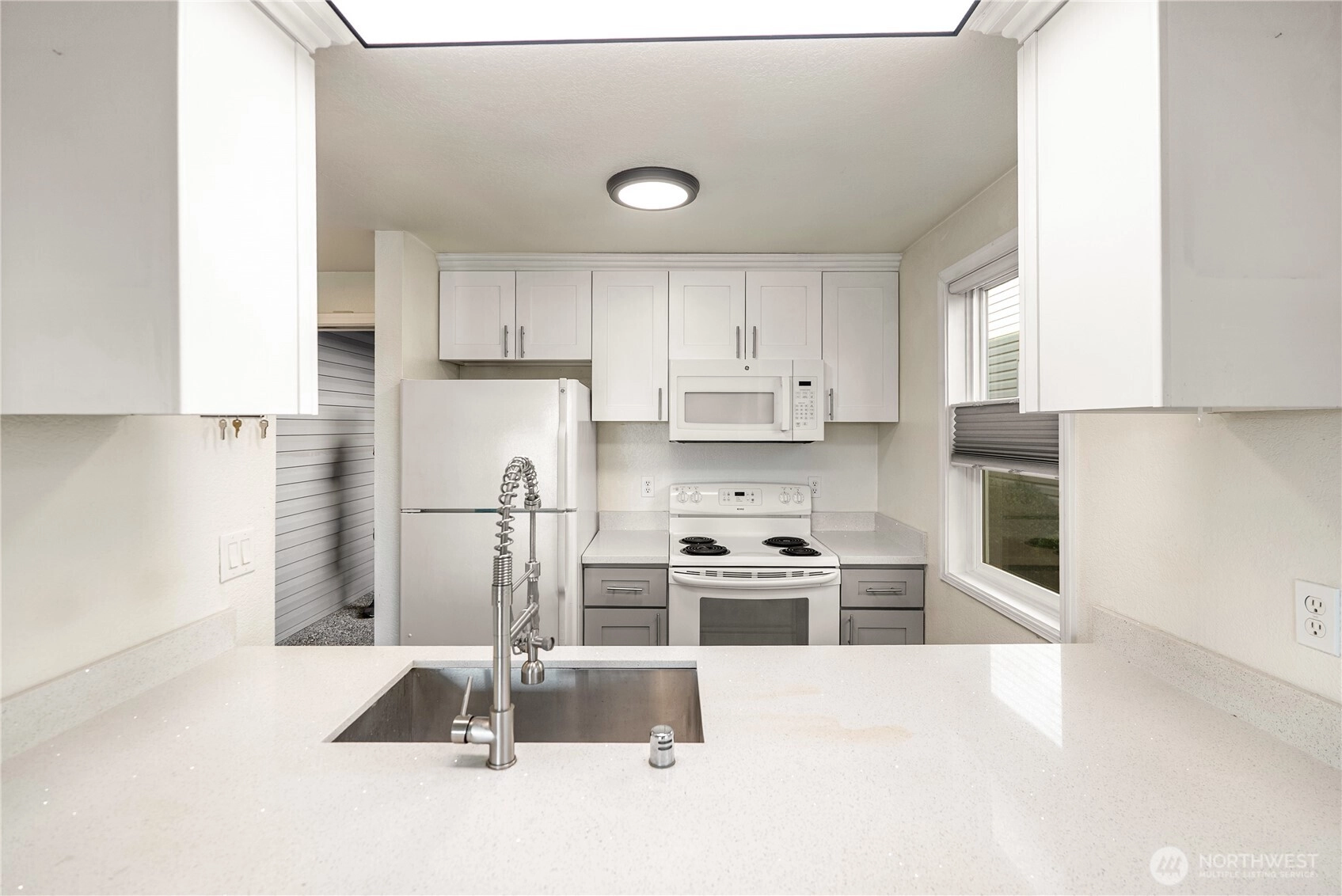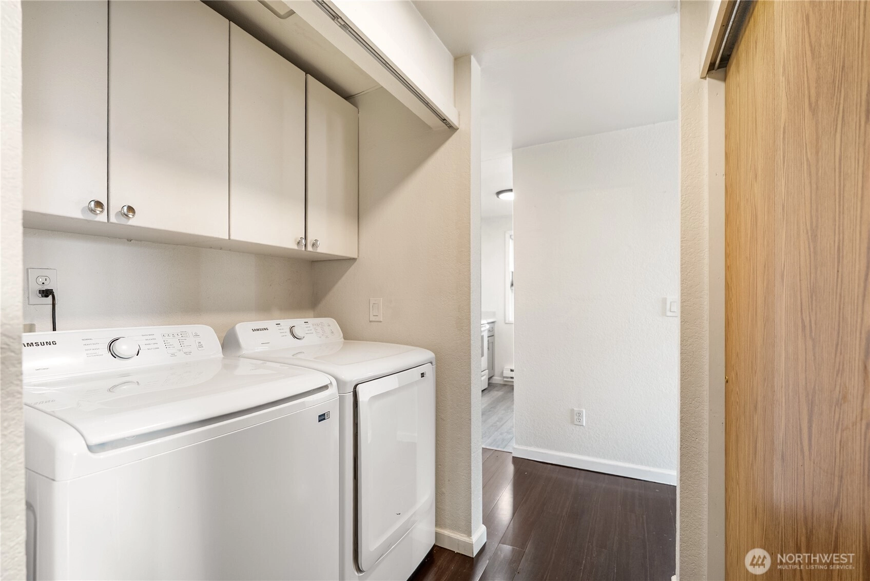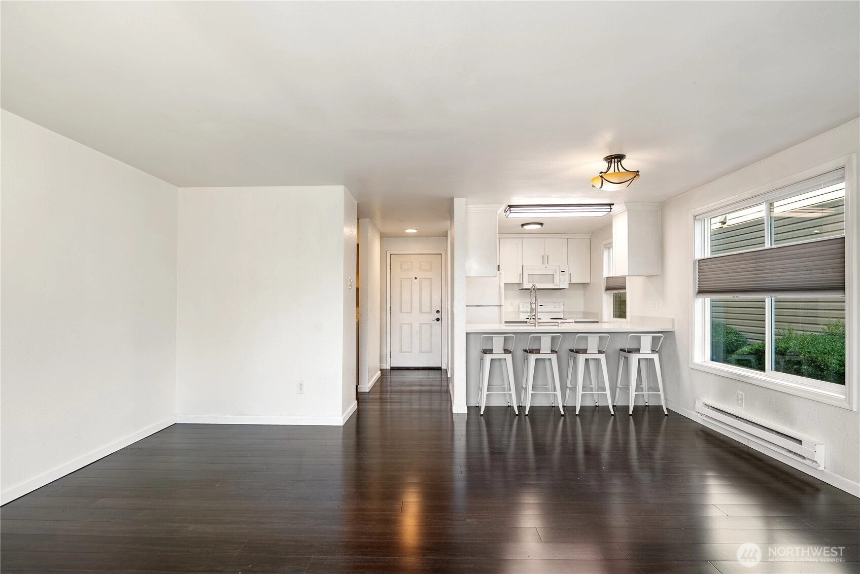 Bright and well-cared-for end-unit condo in North Everett with mountain views and beautiful sunrises. This 2-bedroom home offers an inviting eat-in kitchen, bamboo flooring, and washer/dryer hookups with appliances included. Reserved parking plus your own garage and driveway provide added convenience and storage. Enjoy the ease of nearby shopping, Everett Community College, Providence Hospital, and quick I-5 access. HOA covers water, sewer, garbage, landscaping, earthquake, and exterior insurance—low-maintenance living at its best. WELCOME HOME!