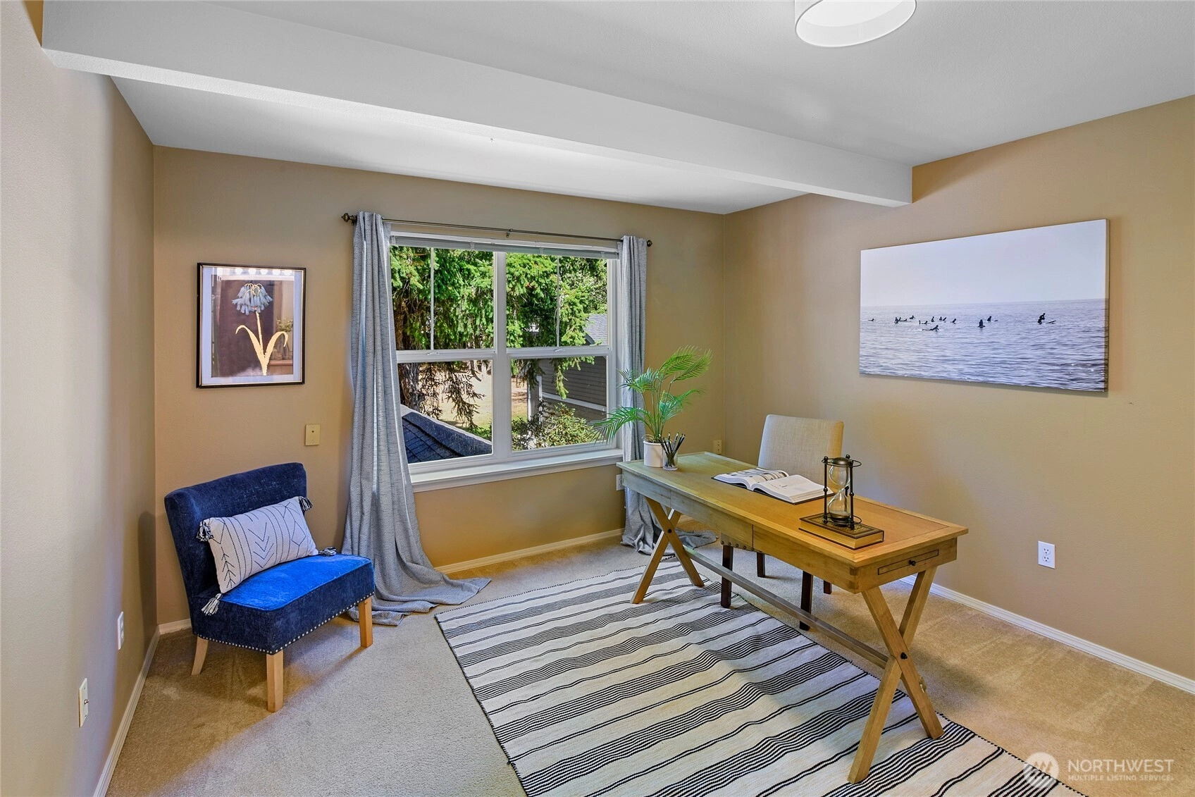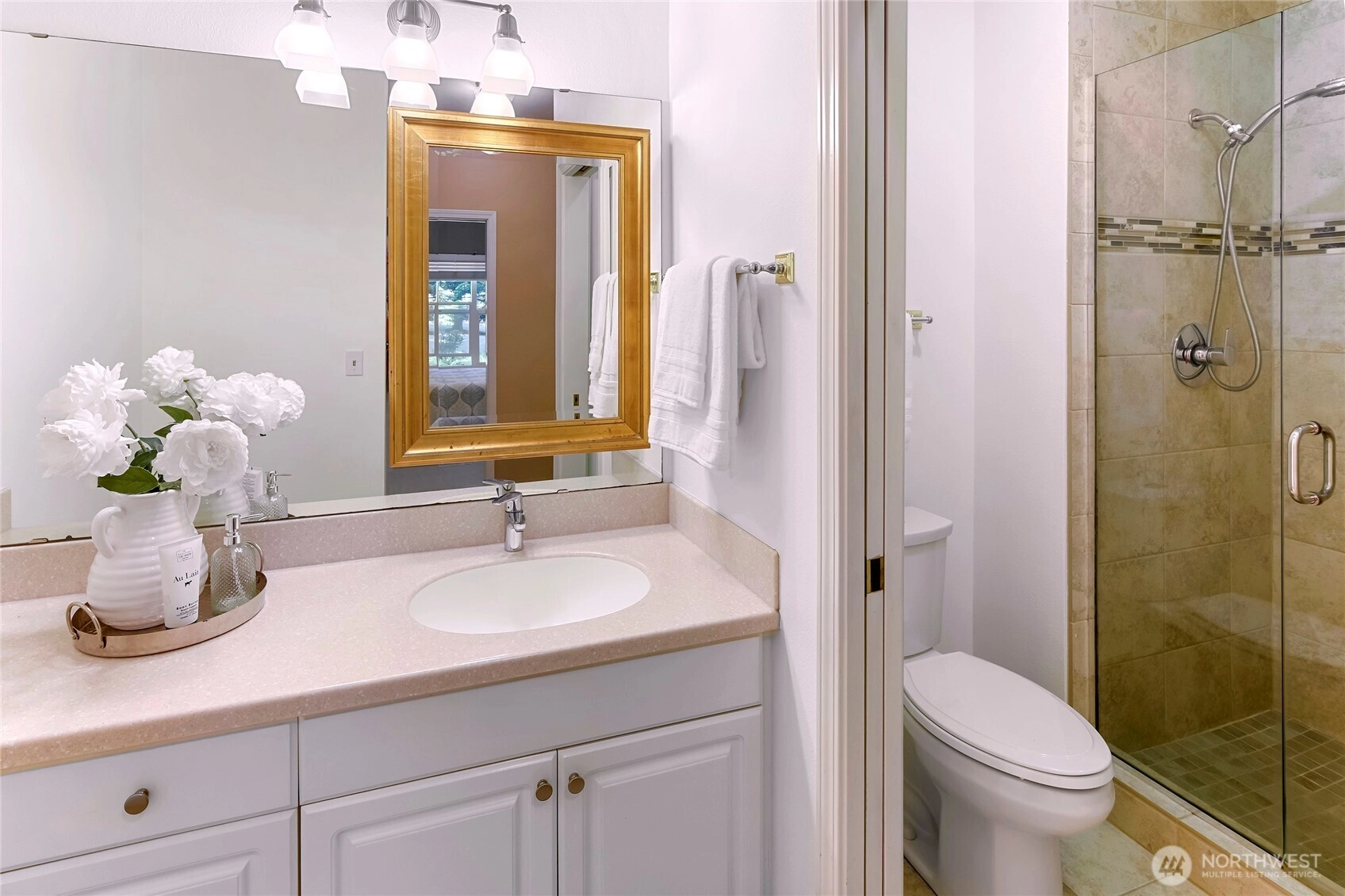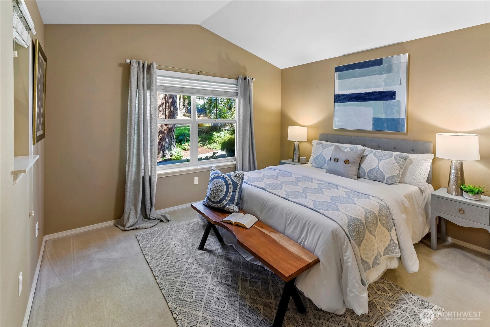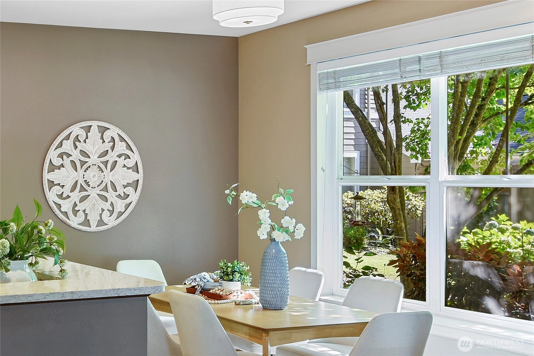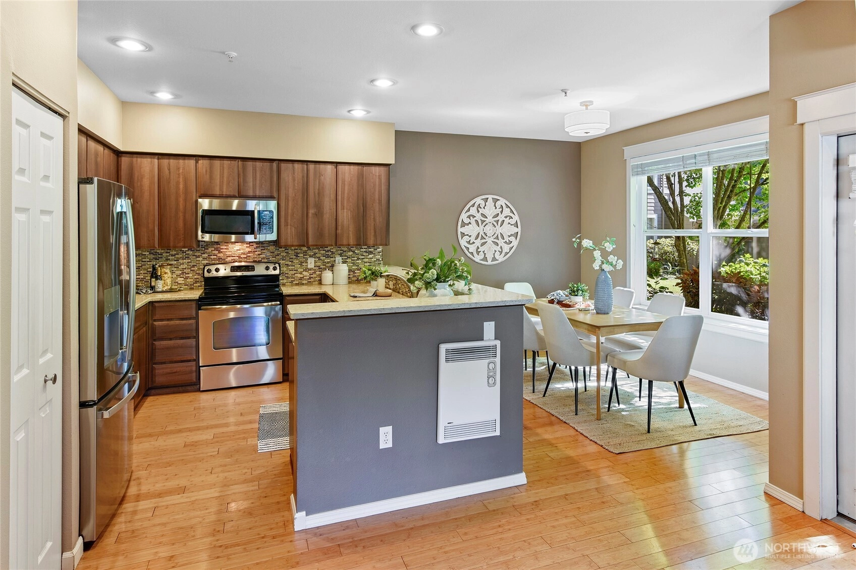 Don't miss this gem of a 3 bedroom townhome nestled in a park-like setting centrally located close to schools, library and parks. One level living with primary suite and all the communal spaces on the main level. Two additional bedrooms upstairs share a full bath. Surrounded by beautiful landscaping with serene views and spacious sitting area off the back porch. Tasteful updates include bamboo floors on the main level, mini-split for heating and cooling, quartz counters in kitchen and stainless kitchen appliances. 9 foot ceilings and an abundance of natural light make the open concept living both cozy and bright. Enjoy one of Bainbridge Island's most desirable communities w/ easy access to vibrant downtown Winslow and the ferry to Seattle.