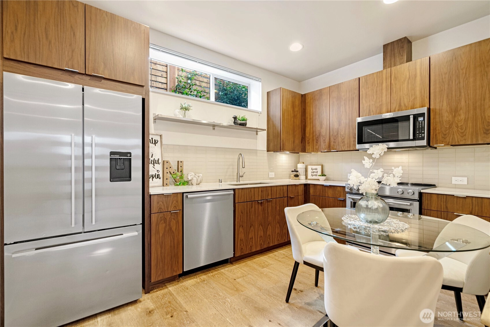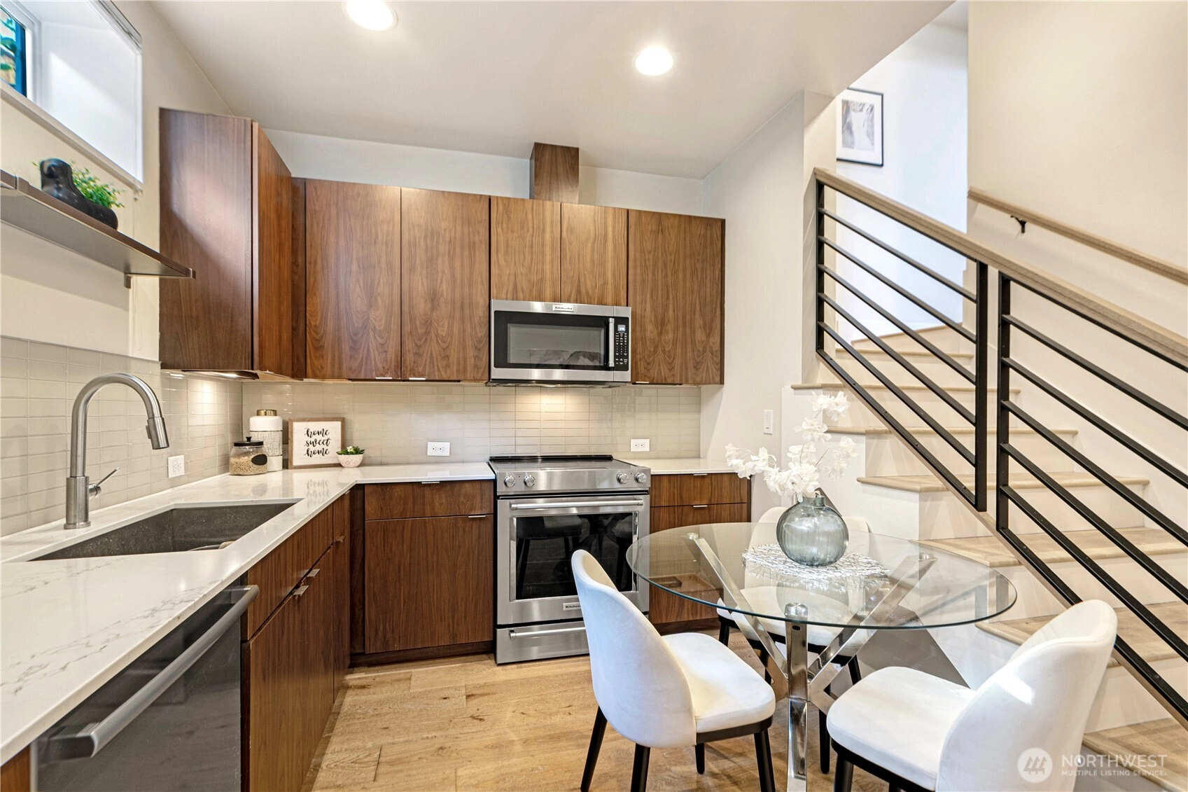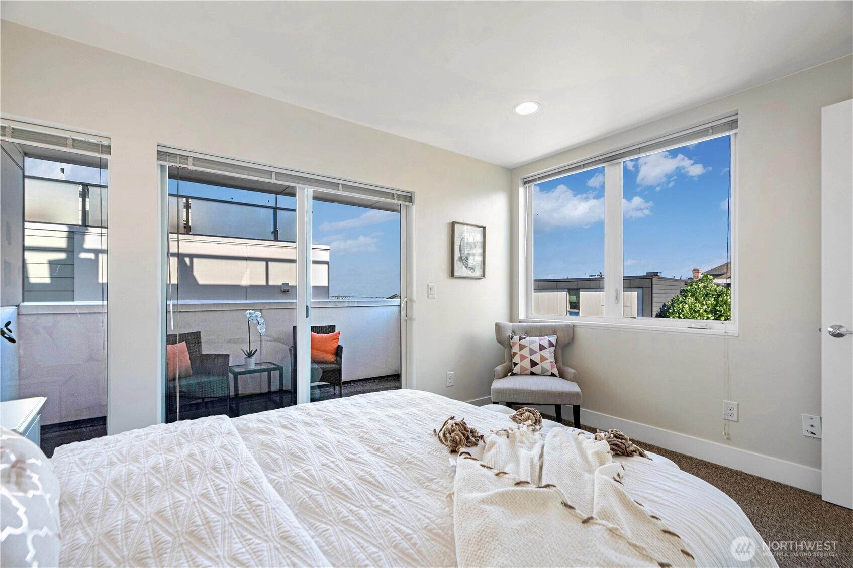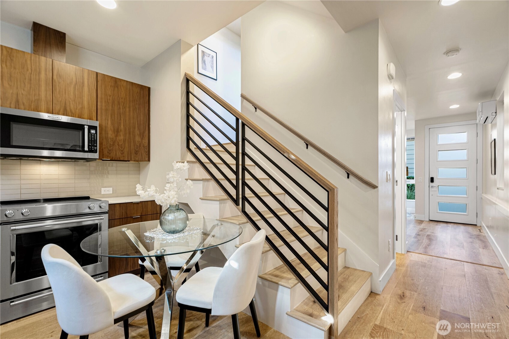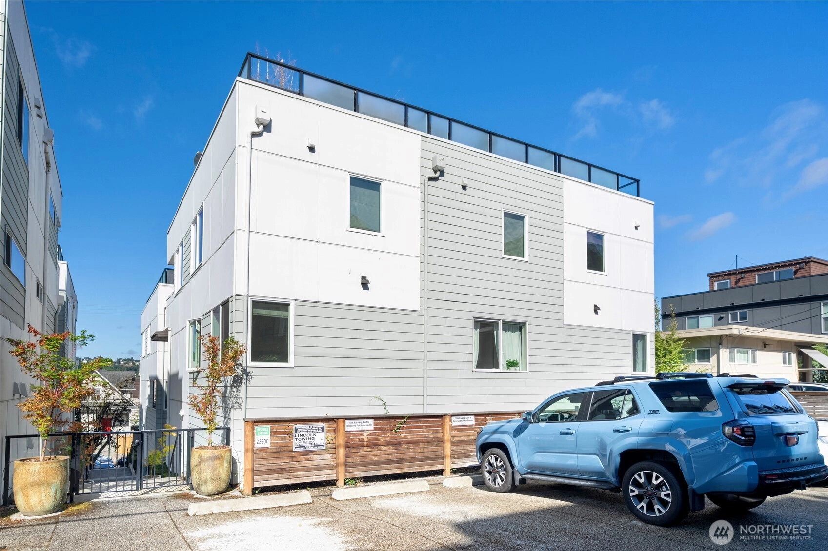 Welcome to this serene end-unit residence, crafted by Murray Franklin and boasting stunning views of Lake Union and the downtown skyline. The primary bedroom offers beautiful views of the scenery in the distance. Ideally situated in the sought-after Eastlake neighborhood, this home offers quick access to Downtown Seattle, the University of Washington, I-5, and Highway 520. It complemented by brand-new carpeting and fresh interior paint. The primary suite includes a walk-in closet for added convenience. A dedicated parking space is provided in the rear alley. Built by Berkshire Hathaway in 2017 and never before offered on the market, this well-maintained home is being sold "As Is."