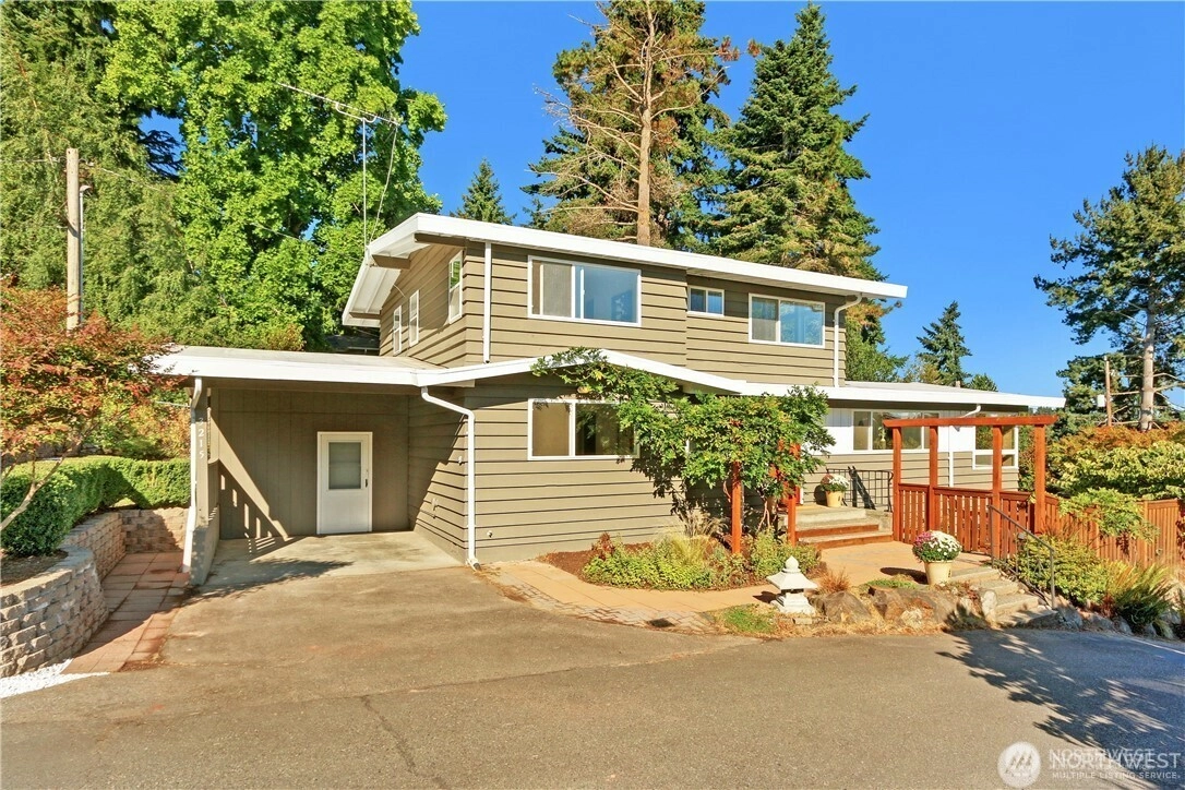 Flooded with natural light, this Mid-Century gem offers sweeping territorial views, wall-to-wall windows, and multiple patios for indoor-outdoor living. The main floor flows seamlessly into dining and living areas, while the upper level features a spacious great room/office, two bedrooms, and a bath. The lower-level rec room has a fireplace, mini bar, and access to the level backyard. Major updates: roof and flooring (2021). Parking includes a carport and additional spaces, with room for six cars total. Home is not staged. Seller offering $3,500 appliance credit. Non-conforming main-floor bath; buyer to verify permits/usage.