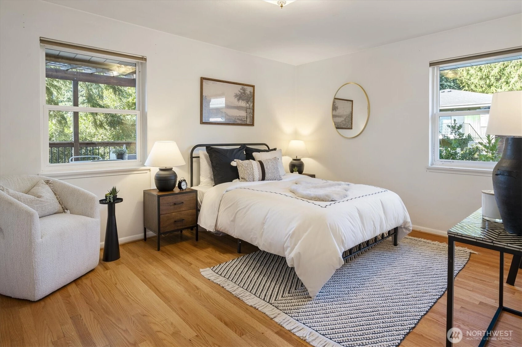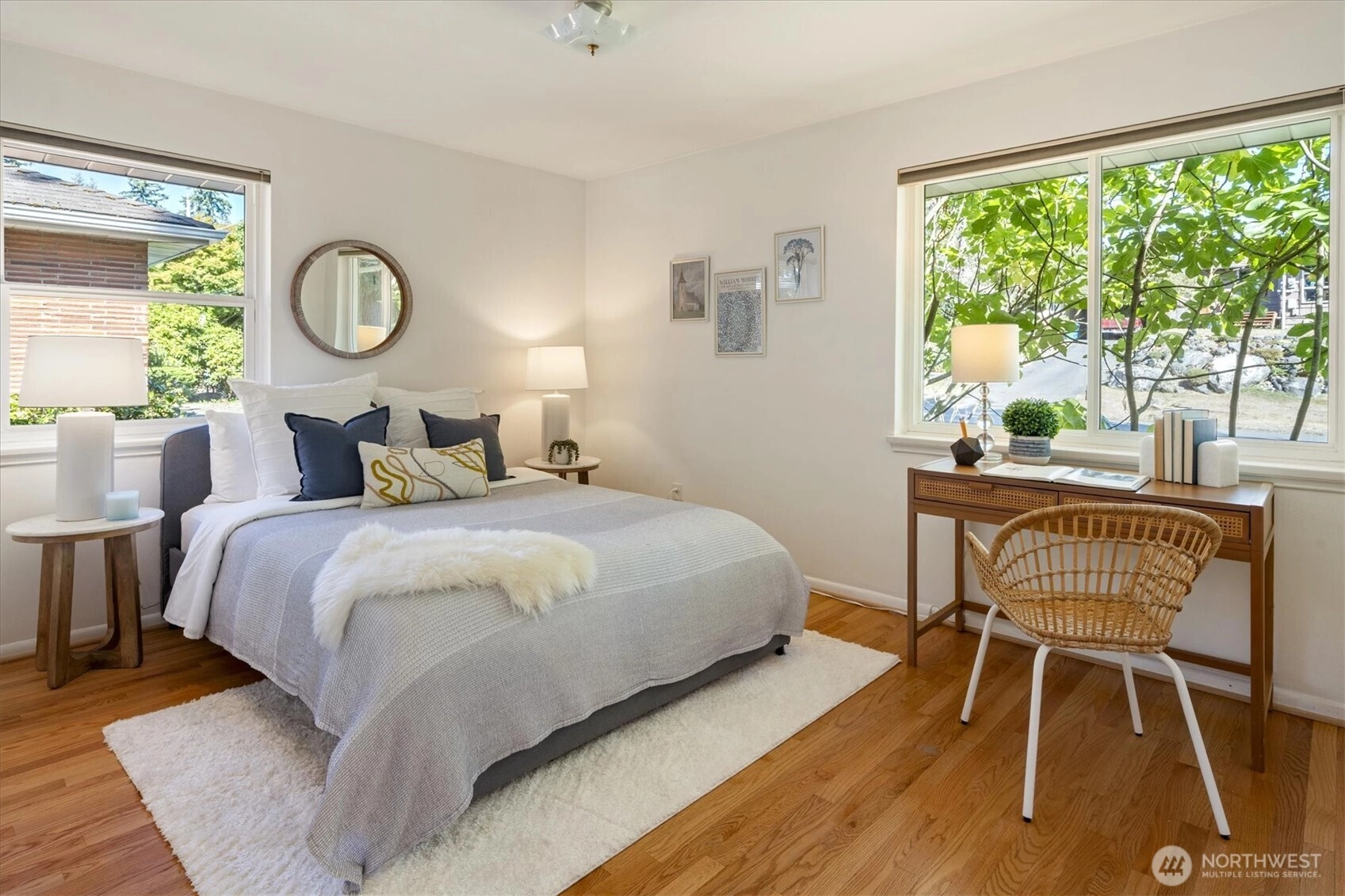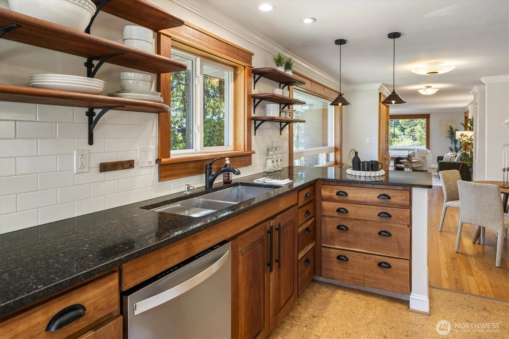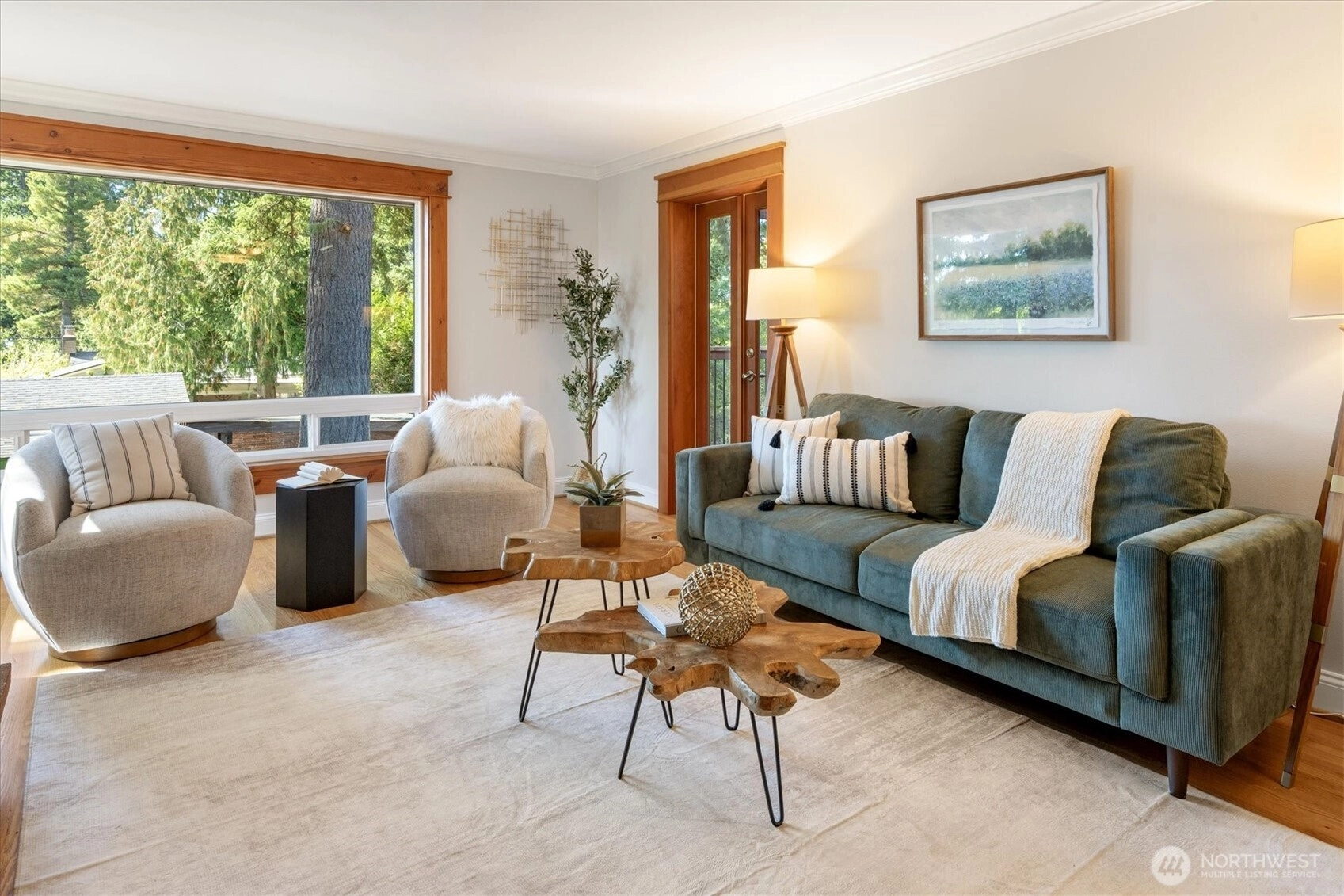 Remodeled by a master carpenter, this unique mid-century home blends timeless craftsmanship with thoughtful modern updates. Rich natural wood accents bring the PNW inside, while large windows invite natural light and partial Puget Sound & mountain views. The main level features 3 bdrms, full bath, sunny kitchen, dining & living spaces with warm hardwoods. The freshly renovated daylight lower level includes a spacious 2nd kitchen, 3/4 bath & additional bdrm—ideal for guests, multigenerational living or potential income-generating ADU. Spacious level backyard w/room to garden or play. 400sf attached garage w/220-amp subpanel. Updated plumbing & electrical, newly lined sewer. A truly special home where character, function & potential converge.
