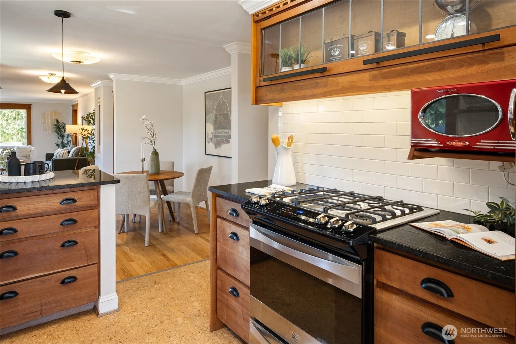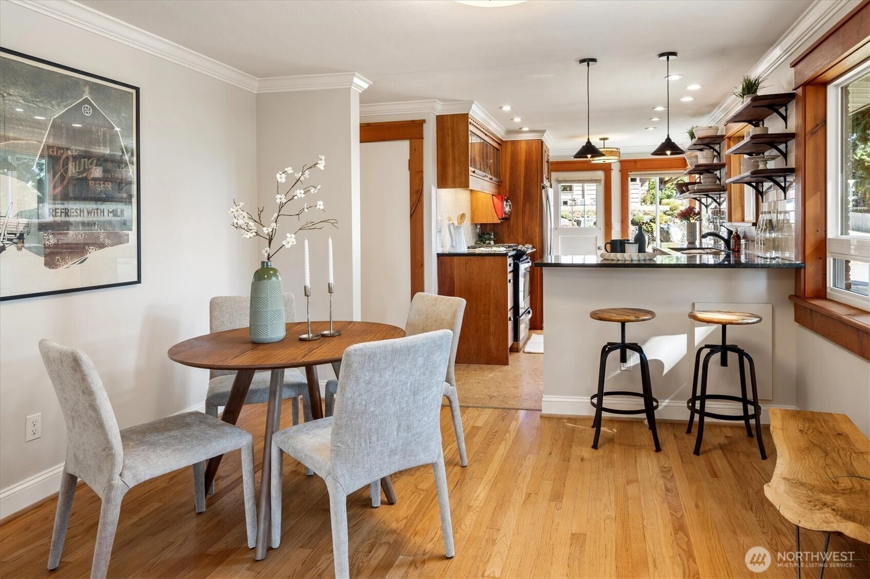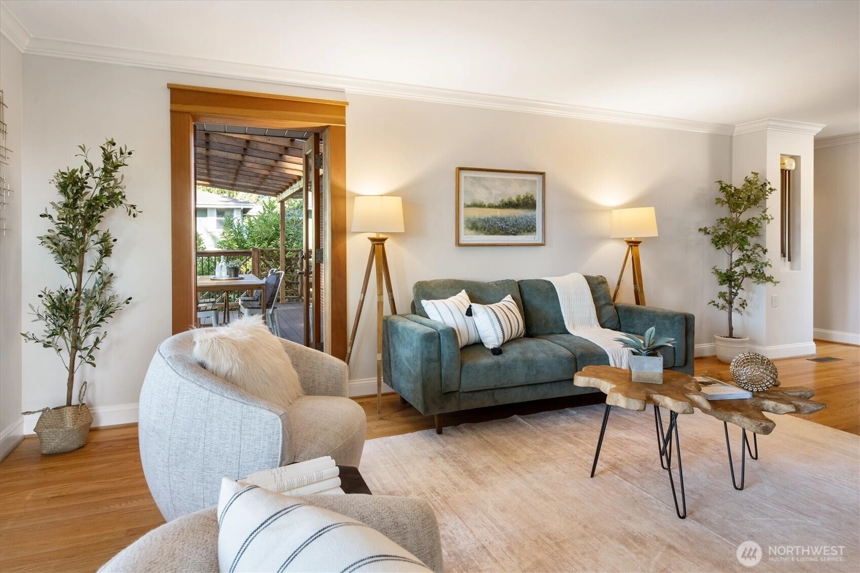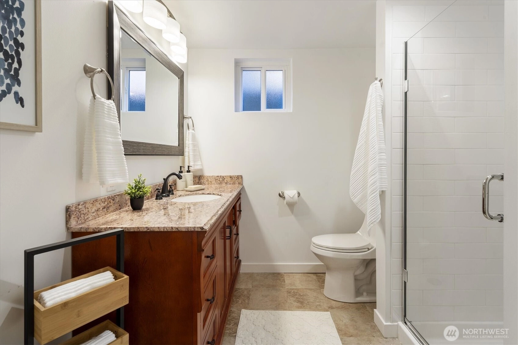 Remodeled by a master carpenter, this unique mid-century home blends timeless craftsmanship with thoughtful modern updates. Rich natural wood accents bring the PNW inside, while large windows invite natural light and partial Puget Sound & mountain views. The main level features 3 bdrms, full bath, sunny kitchen, dining & living spaces with warm hardwoods. The freshly renovated daylight lower level includes a spacious 2nd kitchen, 3/4 bath & additional bdrm—ideal for guests, multigenerational living or potential income-generating ADU. Spacious level backyard w/room to garden or play. 400sf attached garage w/220-amp subpanel. Updated plumbing & electrical, newly lined sewer. A truly special home where character, function & potential converge.