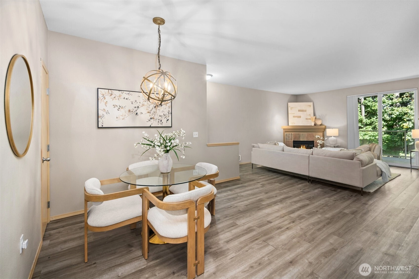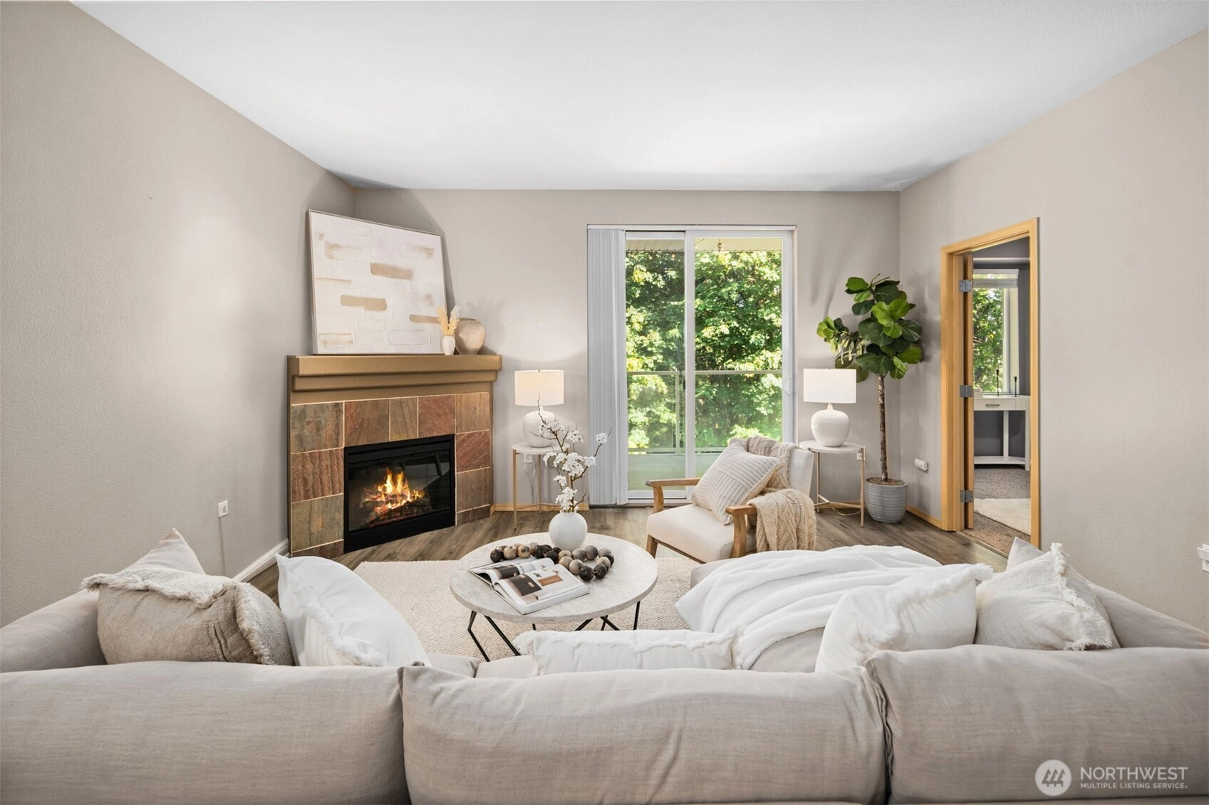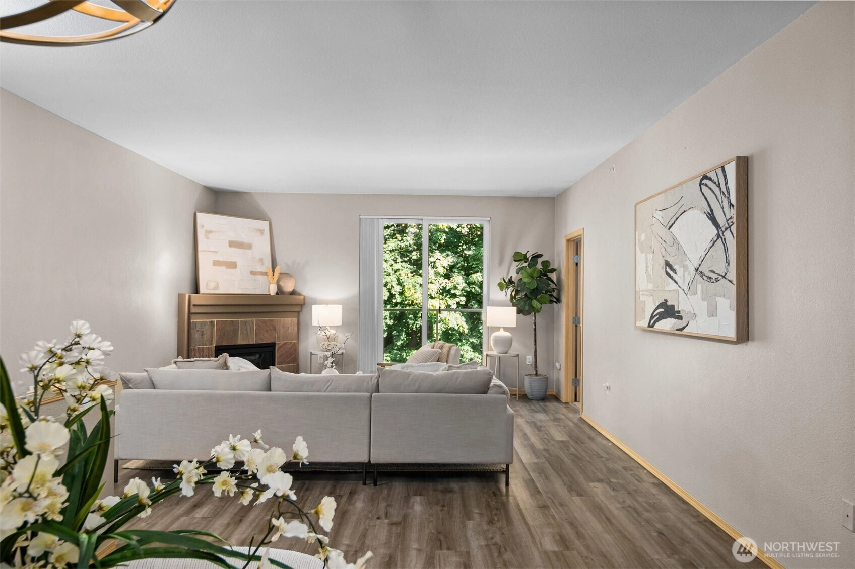 Tucked in the private, gated community of Shadow Hawk, sits this top floor, 2 bedroom condo. Backing to a private green space; enjoy the serene setting from the living room or PNW Fall evenings on the spacious, covered balcony. The open floor plan is highlighted by a chef's kitchen w/quartz countertops, laminate hardwood floors & electric fireplace. The primary bedroom offers a walk-in closet & ensuite bath. The 2nd bedroom is perfect for guests or a home office. Shadow Hawk is pet-friendly, has no rental cap and features a clubhouse, fitness center, sports court and is close to walking trails. Garage offers ample storage and parking for two vehicles! HOA dues include water, sewer & garbage! Close to The Landing, 405 & 167! Welcome Home!
