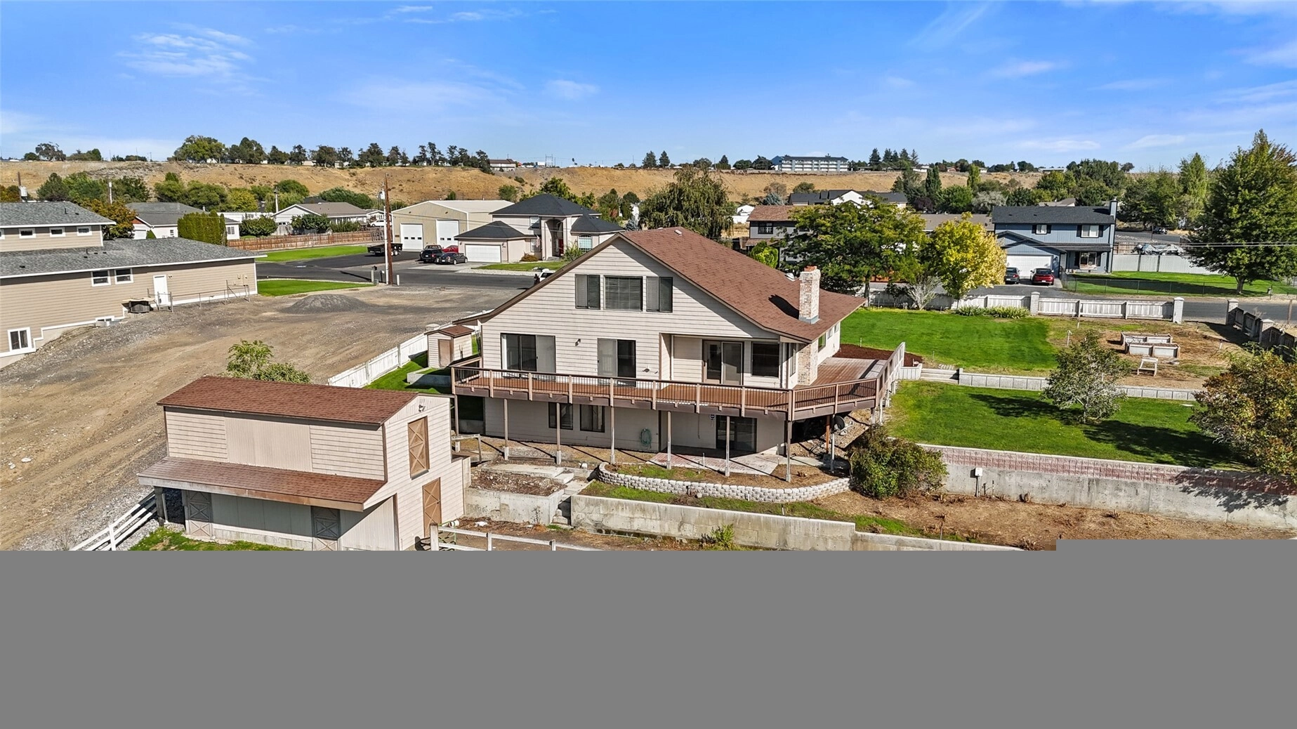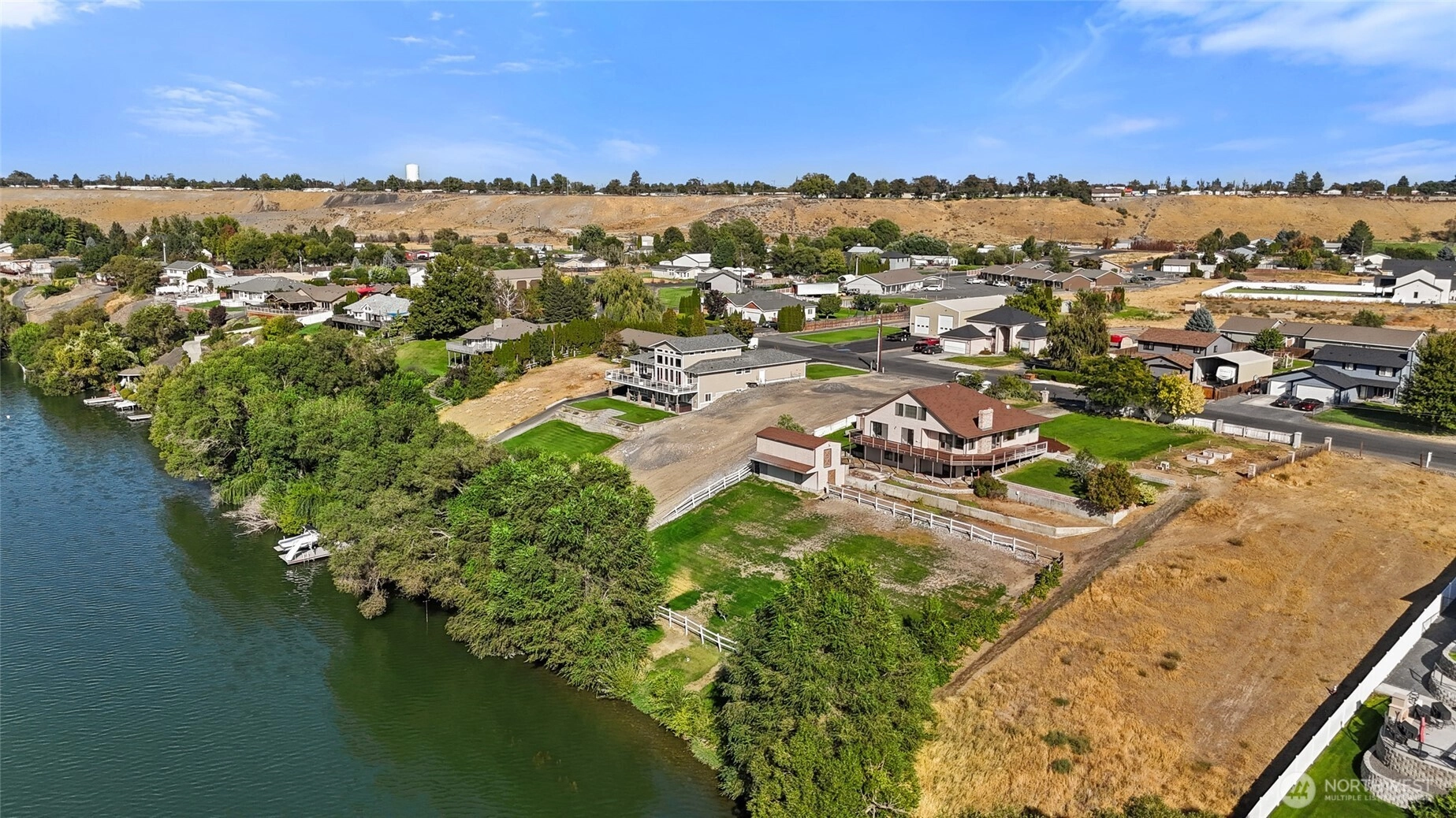 Waterfront home w/ 150’ lake front & Incredible sunset views with no HOA's or dues. 2-story home w/ daylight basement has 3,276sf w/ 4-beds + Den, 3-baths. Fenced pasture, well house, & shop w/ horse barn (2 stalls), root cellar, & workshop w/ power. Wrap-around deck on main-level w/ patio below. Kitchen, living rm, dining & 2 beds w/ bath & laundry on main floor. Kitchen w/ wood cabinetry, updated appliances & eat-in nook. Living room w/ wood fireplace & built-ins. Lg laundry w/ sink. Upper-level primary suite w/ lake views, balcony, en-suite bath w/ garden tub & laundry chute to the laundry rm. Bsmt has family rm w/ wood stove, 3/4 bath, 1-bed+den. Built-in vac system, UGS. Addl lot available next door -increase water frontage to 225’.