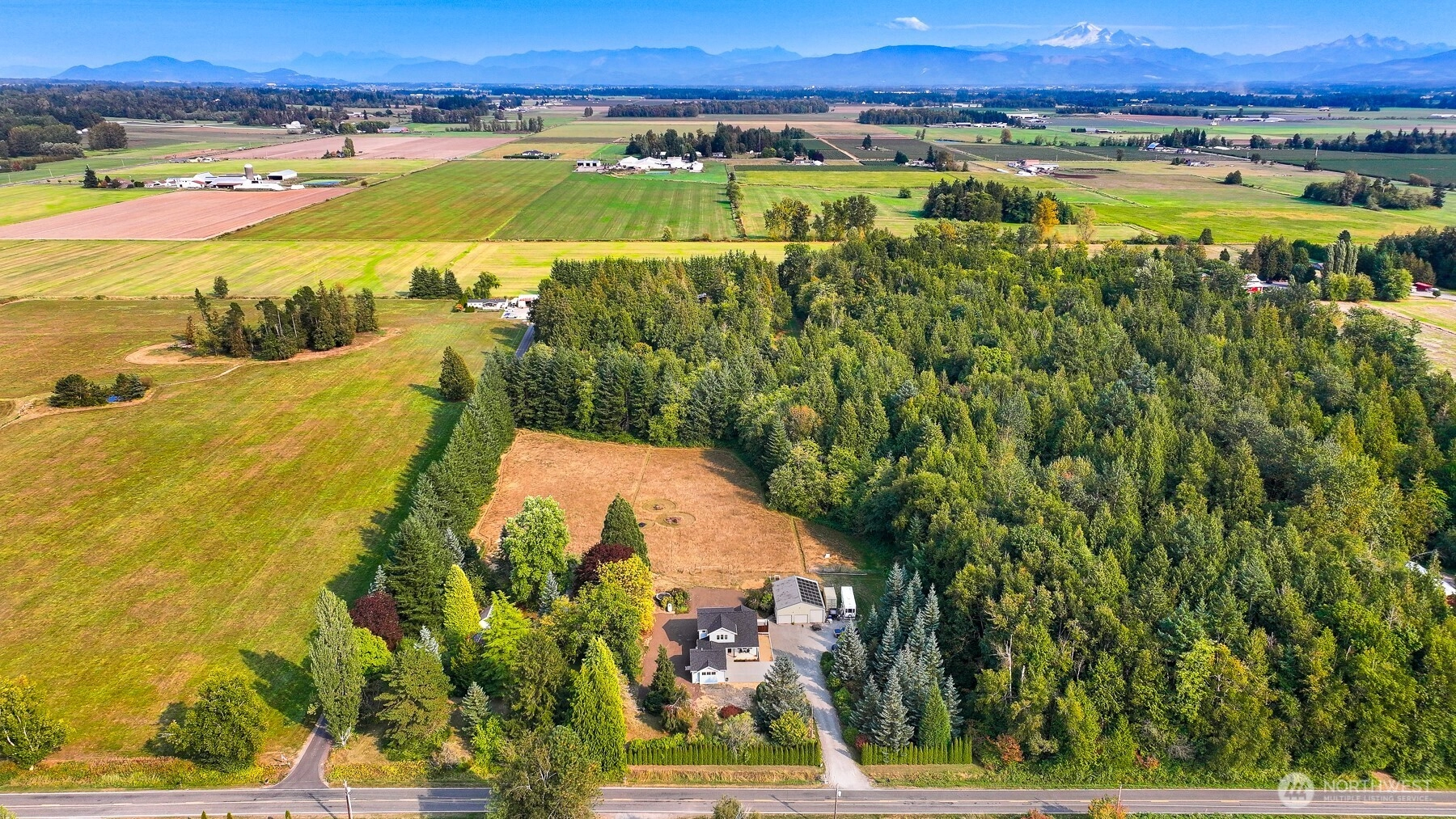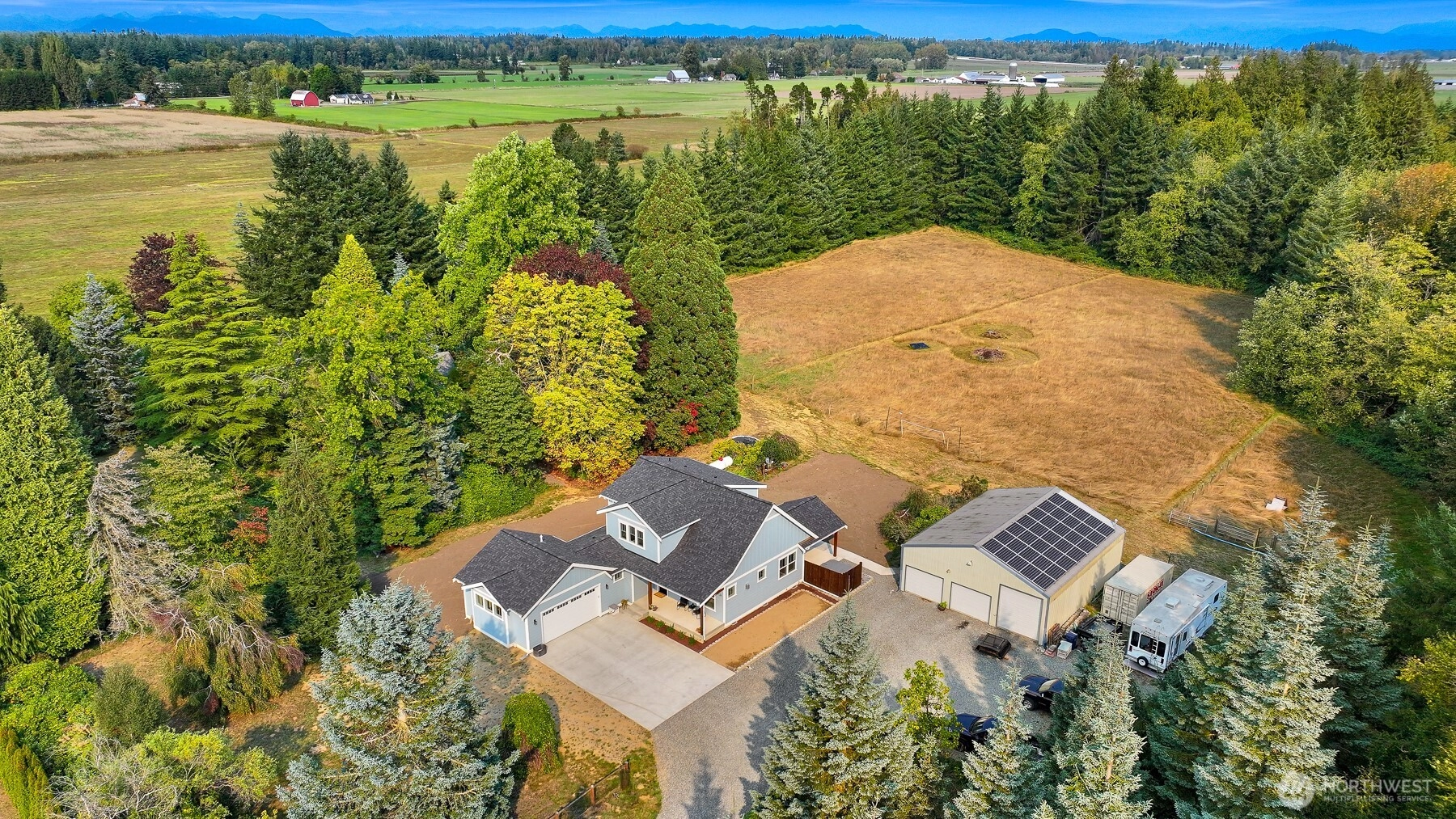 Set on 7 acres, this property offers privacy and convenience! 5 minutes to I-5 & central to Blaine, Lynden, and Ferndale. Built in 2023, this Craftsman checks every box with its open concept design, quartz counters, LVP flooring, ceiling-height cabinets, and vaulted ceilings. Primary suite and office on the main, plus 2 bedrooms and a bonus room upstairs. Enjoy outdoor living on the large covered patio, or take a stroll among the 100 year old trees, colorful plantings, and peaceful wooded trails. The property is set up for flexibility with room for an ADU (buyer to verify), RV parking, and a 1,500 sq ft heated shop. Highlights include air conditioning, solar power, sandy loam soil with pasture, and the ultimate sense of peace and privacy.