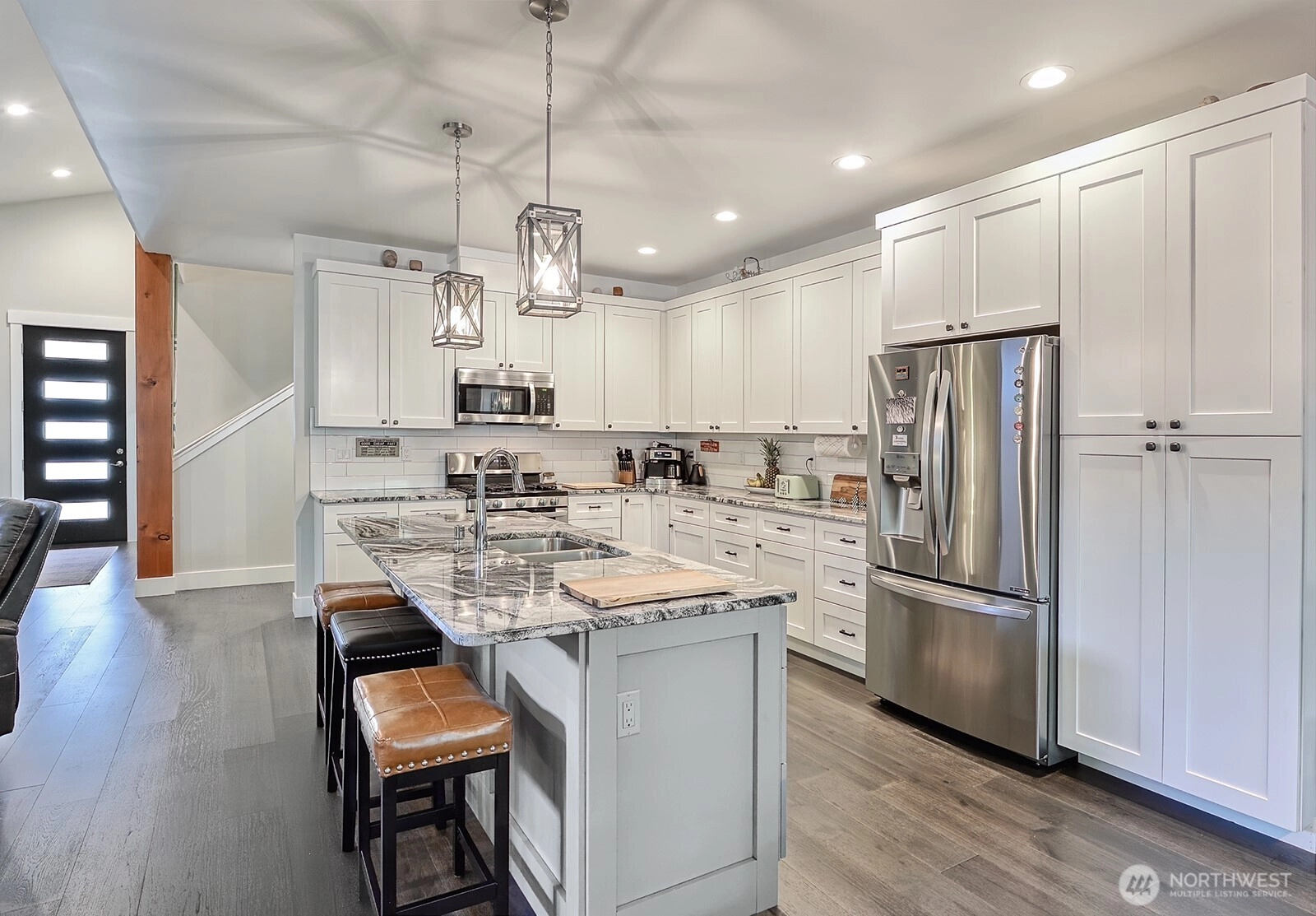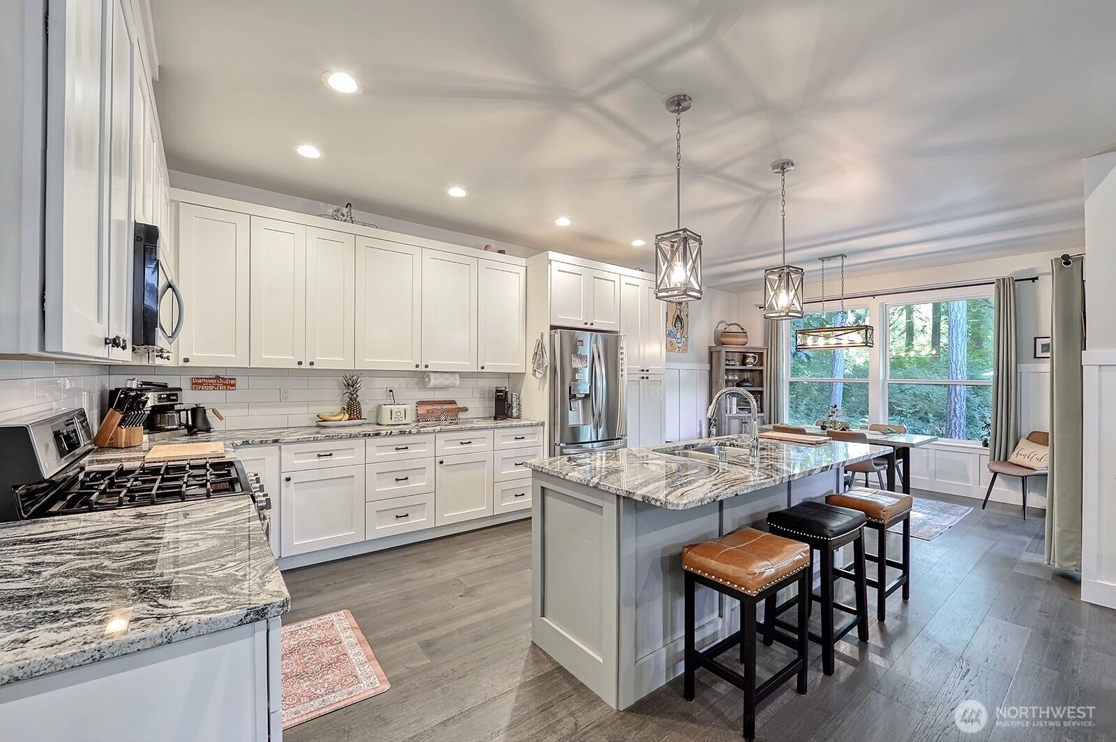 Immaculate like-new home in the coveted Sea Smoke neighborhood of Semiahmoo! Built in 2019 with numerous upgrades, this light-filled home welcomes you with soaring vaulted ceilings, an open great room, cozy gas fireplace, and durable hard-surface floors throughout the main living areas. The main-level primary suite offers an en suite bath with HUGE walk-in shower and an expansive walk-in closet. Upstairs, find two additional bedrooms, a full bath, and a versatile loft/bonus space. A large laundry room adds convenience. The home backs to a peaceful green space, offering added privacy, and the beach is just a half-mile stroll away. Enjoy the security of this gated community and the exceptional lifestyle that Semiahmoo provides.