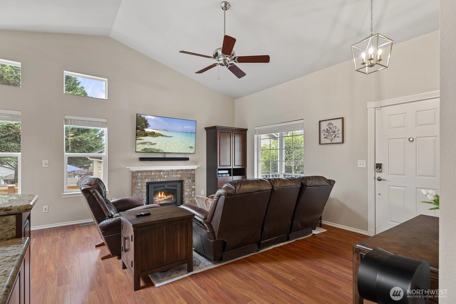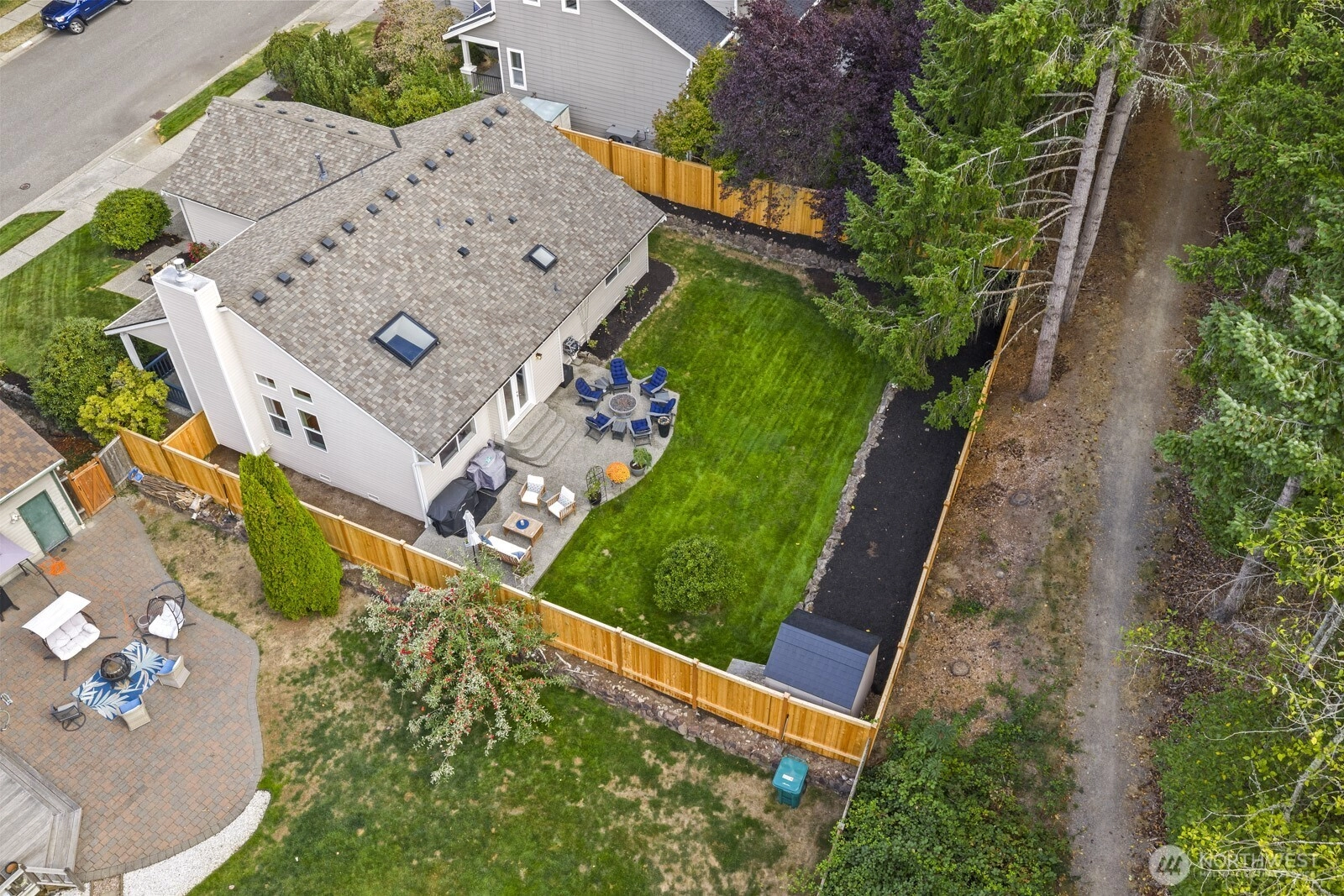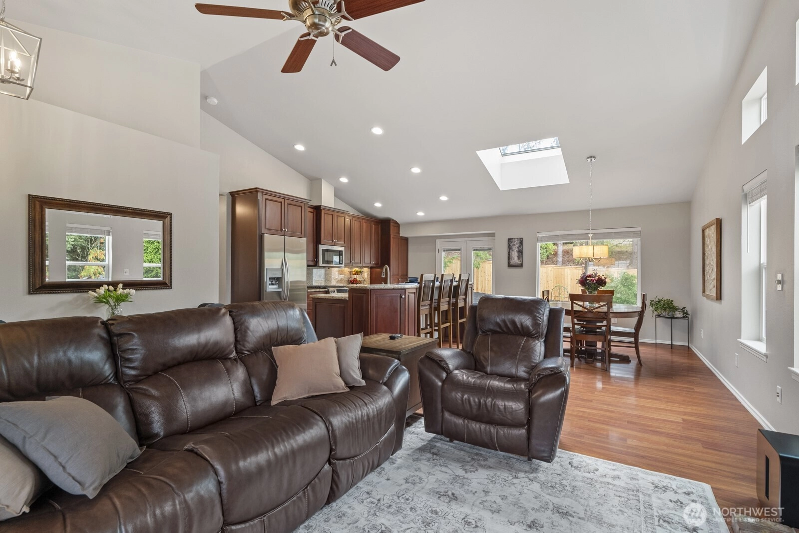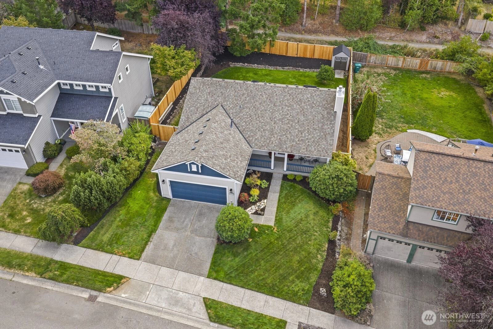 Welcome to Silver Firs! Fall in love with this one-level gem. Located on a quiet street and green belt lot. A covered porch greets you. This move-in ready home has been loving cared for and is ready for its next owner. Updates include fresh interior and exterior paint, presidential roof (approx 2021). New carpet throughout. Newer water heater. The open chef's kitchen offers ample work space and storage, granite counters and stainless appliances. Vaulted ceilings, skylights and an open floor plan provide an abundance of natural light. Cozy gas fireplace. 2 car garage. Entertain or relax in the fully fenced yard with patio. Quick access to shopping, freeways, transit, parks, and schools. Pre-inspected. This is the one!