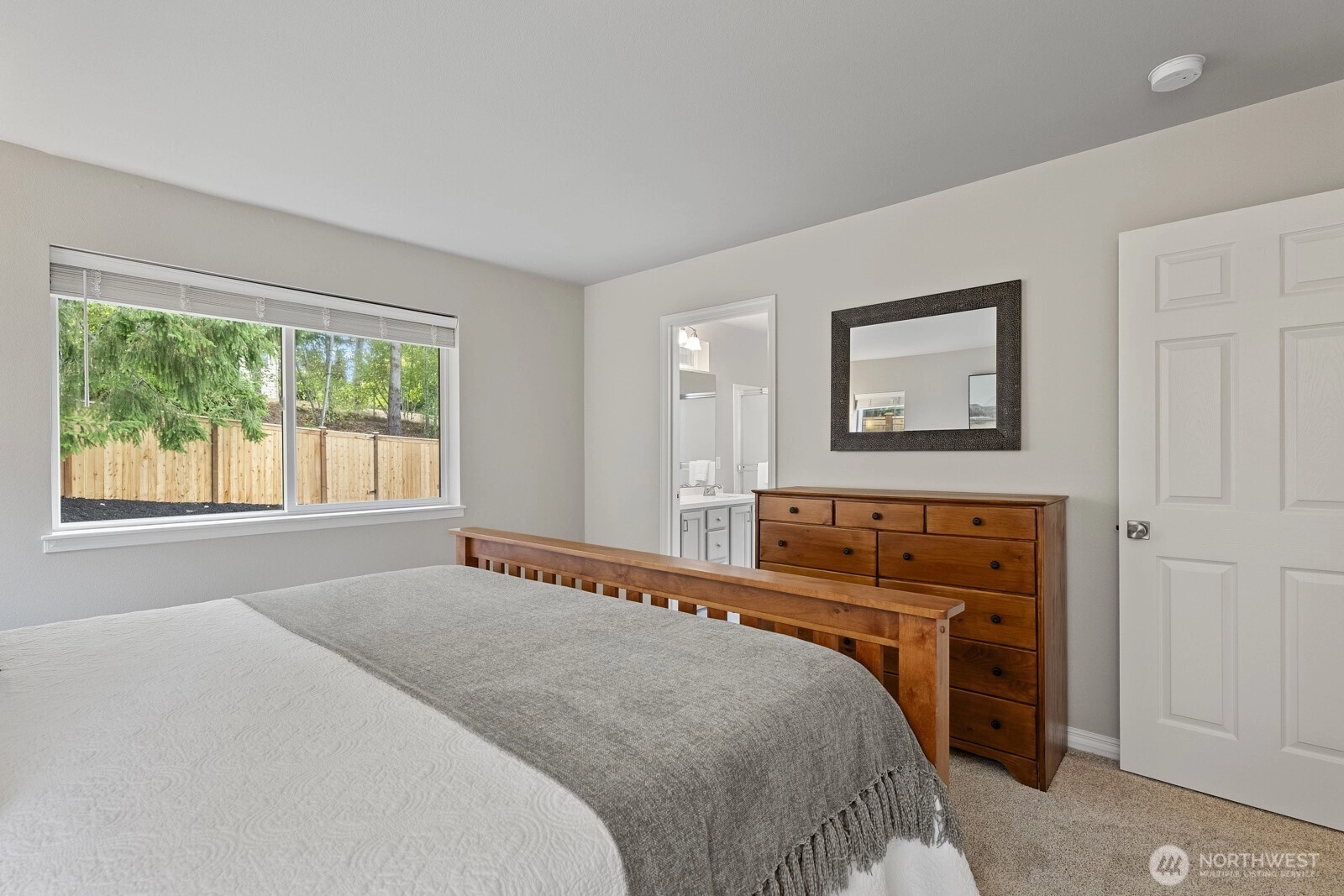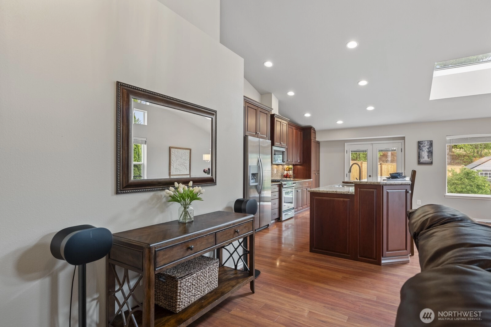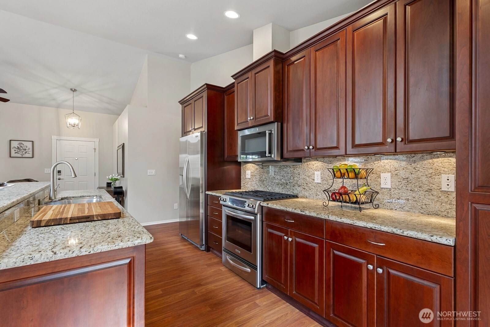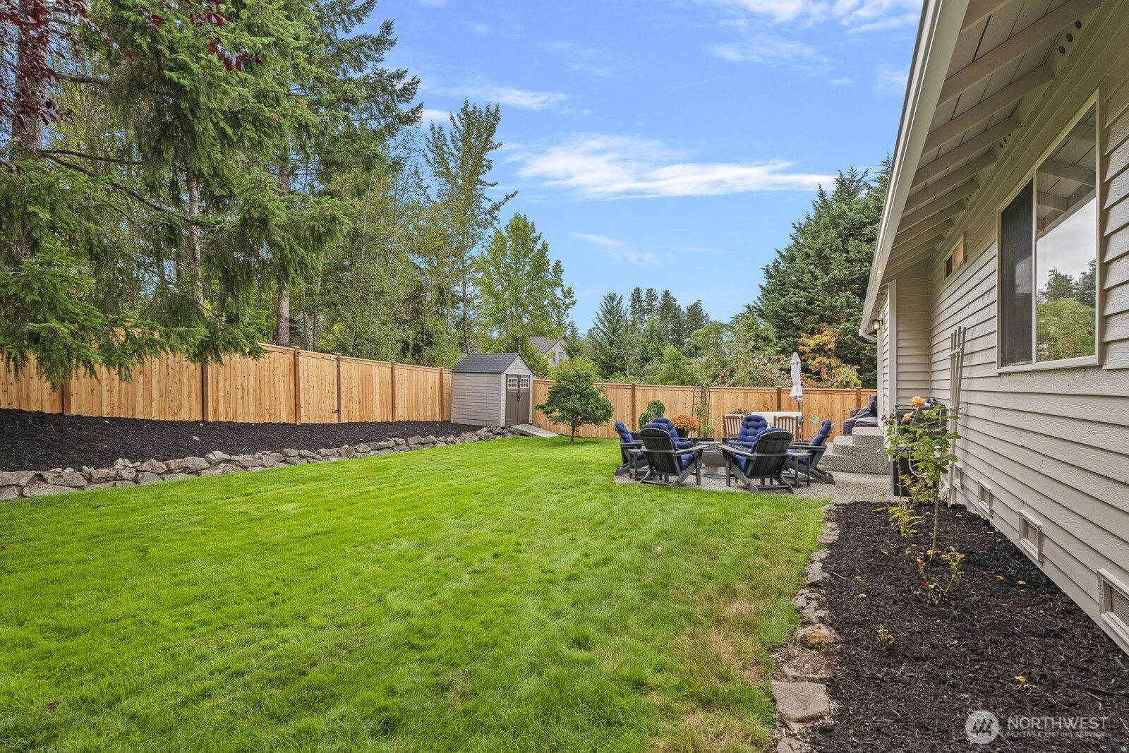 Welcome to Silver Firs! Fall in love with this one-level gem. Located on a quiet street and green belt lot. A covered porch greets you. This move-in ready home has been loving cared for and is ready for its next owner. Updates include fresh interior and exterior paint, presidential roof (approx 2021). New carpet throughout. Newer water heater. The open chef's kitchen offers ample work space and storage, granite counters and stainless appliances. Vaulted ceilings, skylights and an open floor plan provide an abundance of natural light. Cozy gas fireplace. 2 car garage. Entertain or relax in the fully fenced yard with patio. Quick access to shopping, freeways, transit, parks, and schools. Pre-inspected. This is the one!