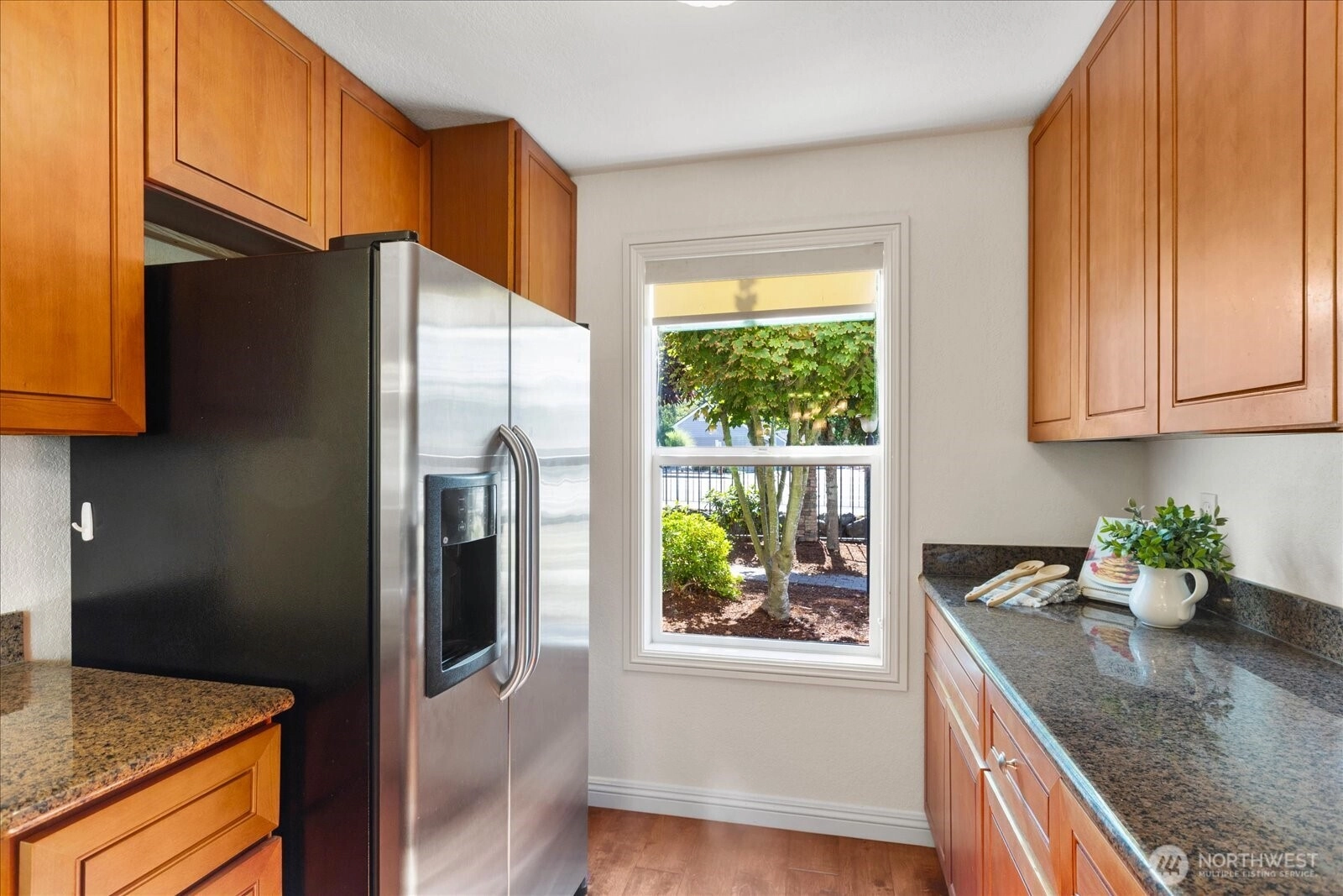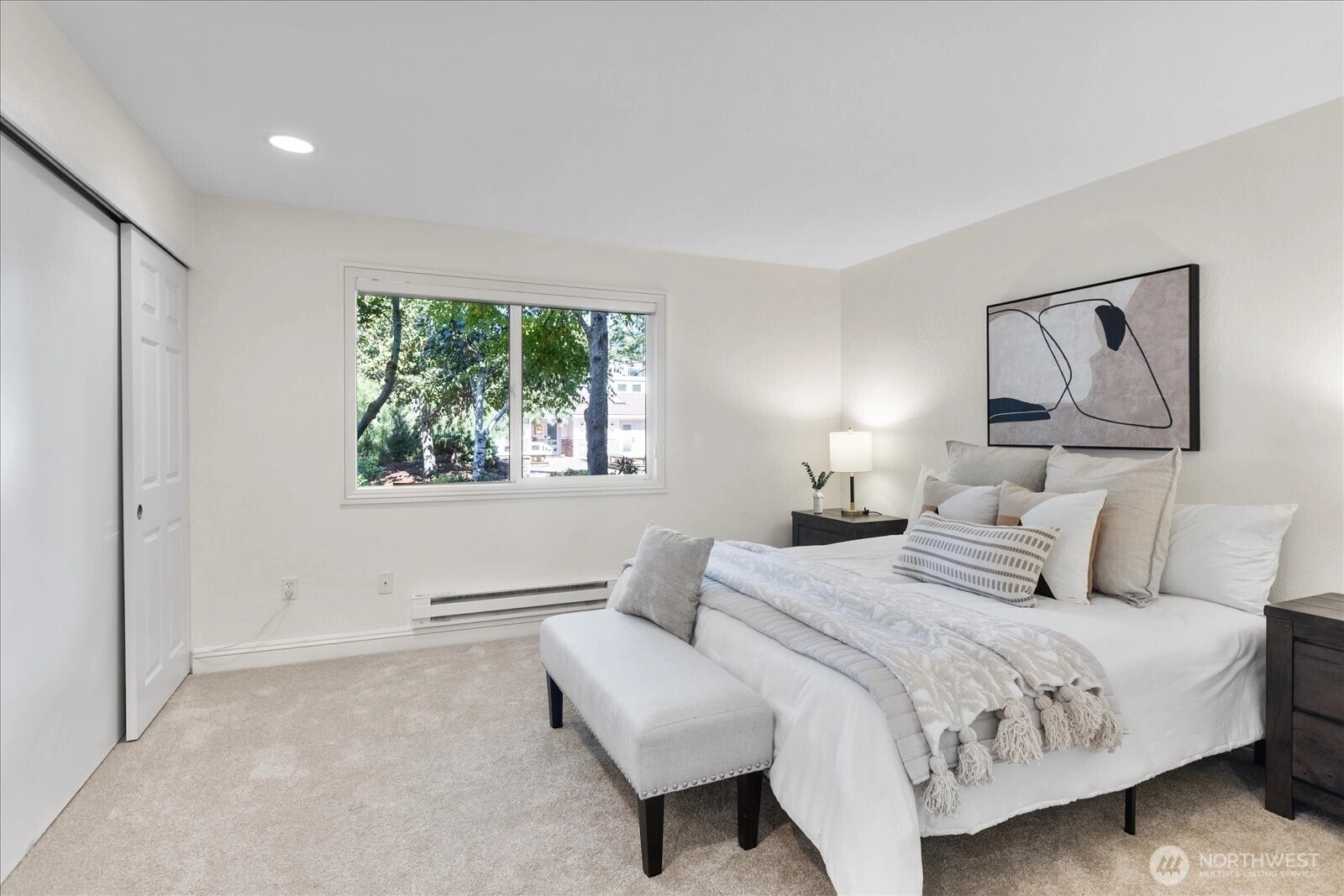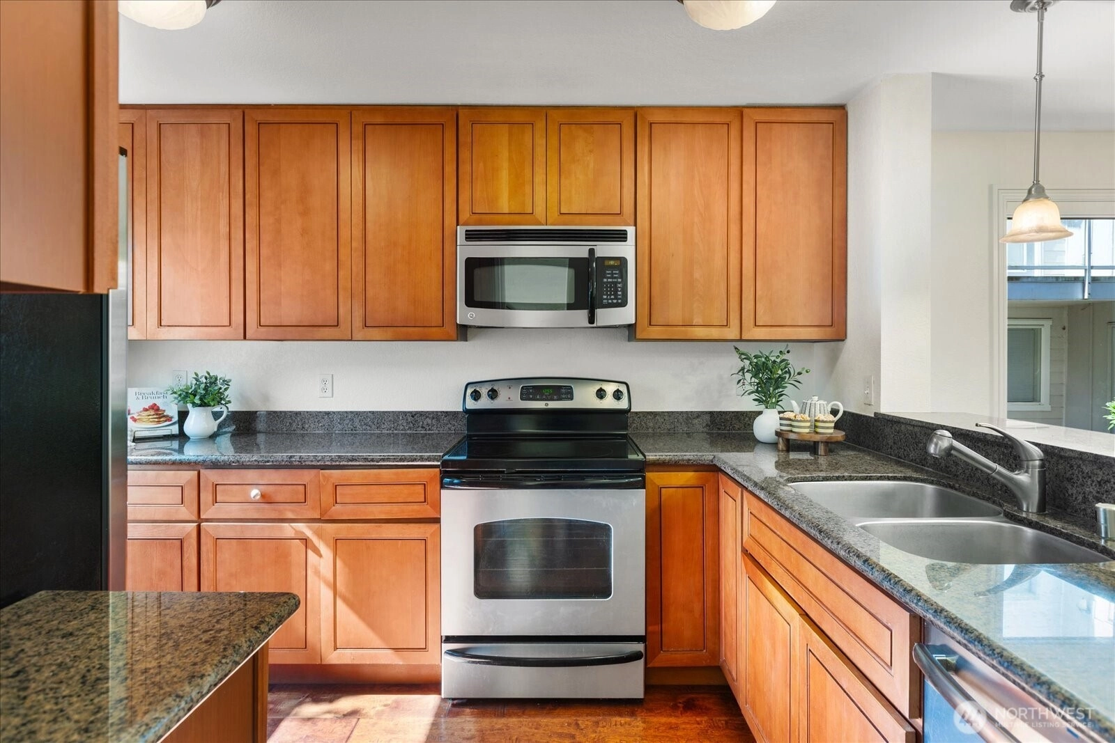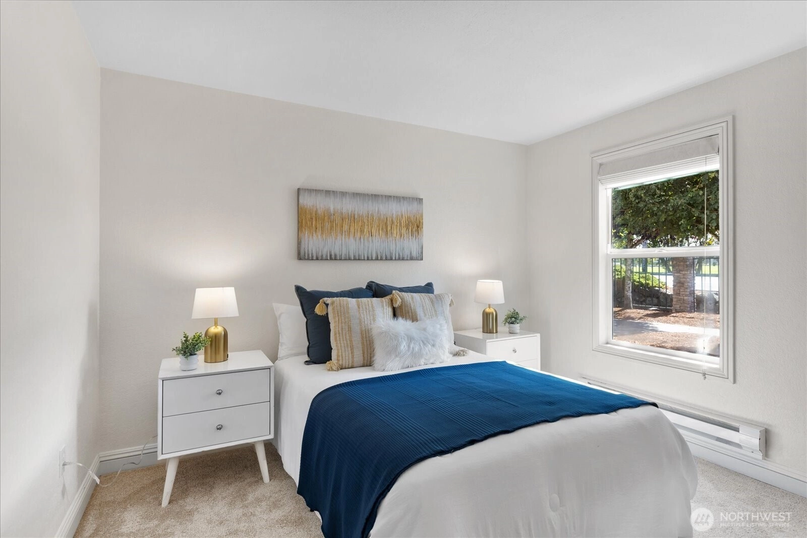 Conveniently located and affordably priced this freshly updated condo is ideal for first time buyers, downsizers (bottom floor, no step entry) or investors (no rental cap). This charming move-in ready home has hardwood floors, new carpet, and new paint. Enjoy preparing meals in your kitchen with granite counter tops, solid wood cabinets and stainless appliances. Living area spills out French doors to patio overlooking courtyard. Primary bedroom comes with ensuite and extra large closet. 2 dedicated parking spaces are close by in this well maintained gated community. Across from Walter Hall Park/Golf Course, easy commute to Boeing, Paine Field Airport, Freeway, shopping and dining. Low HOA dues, pet friendly. Make Memories Here!