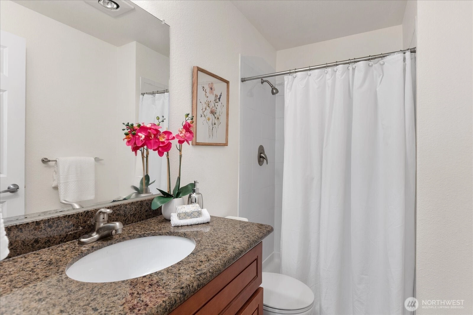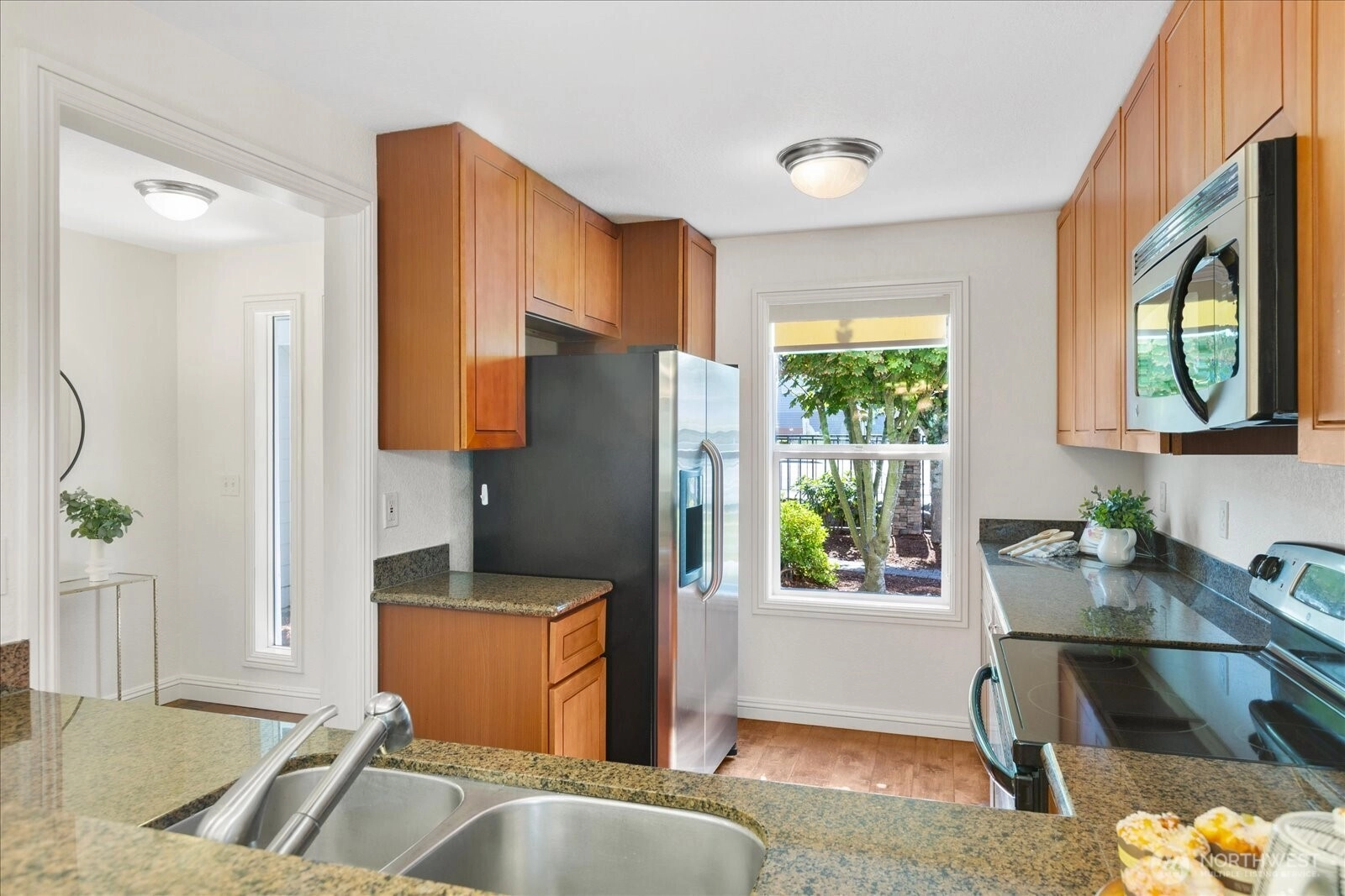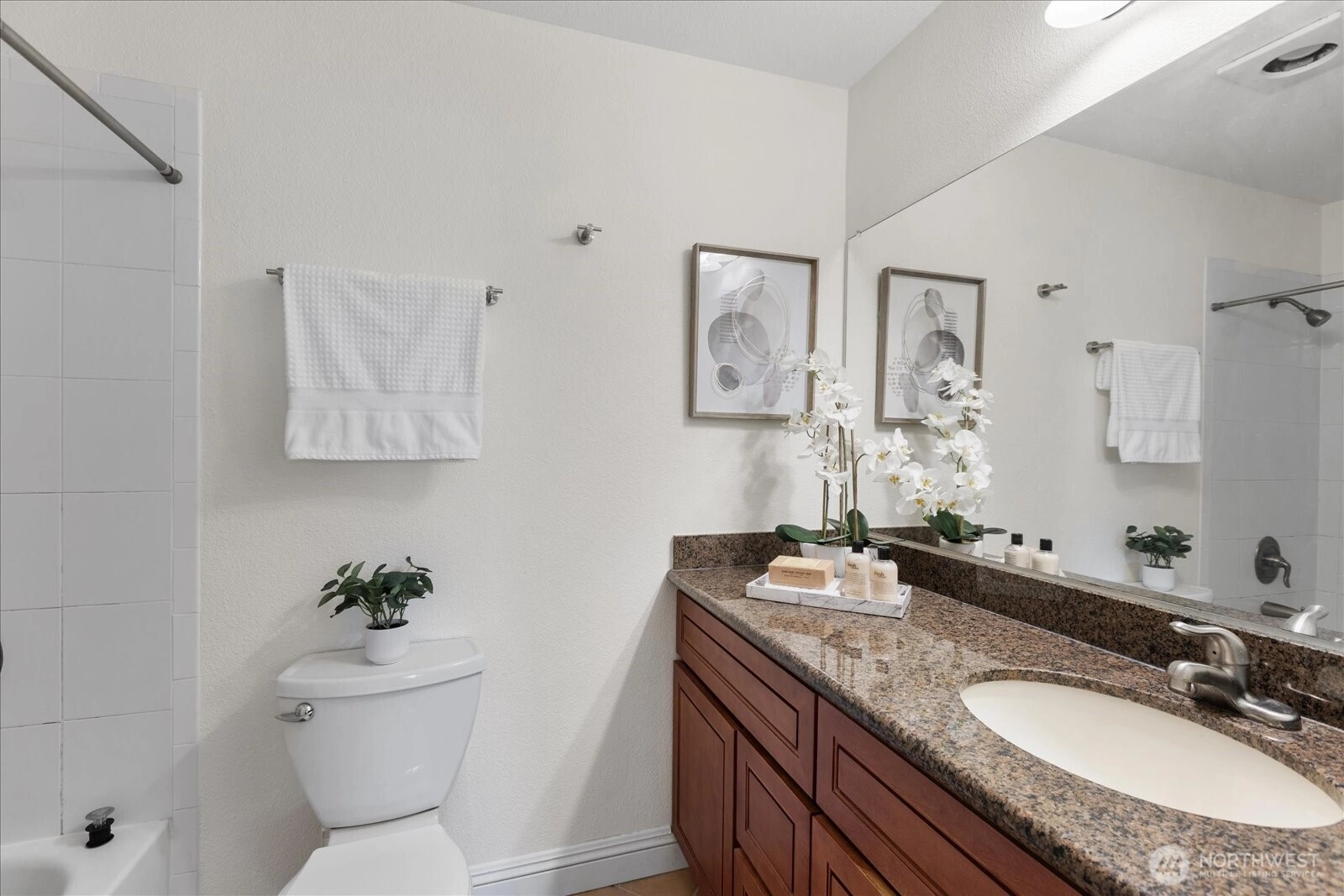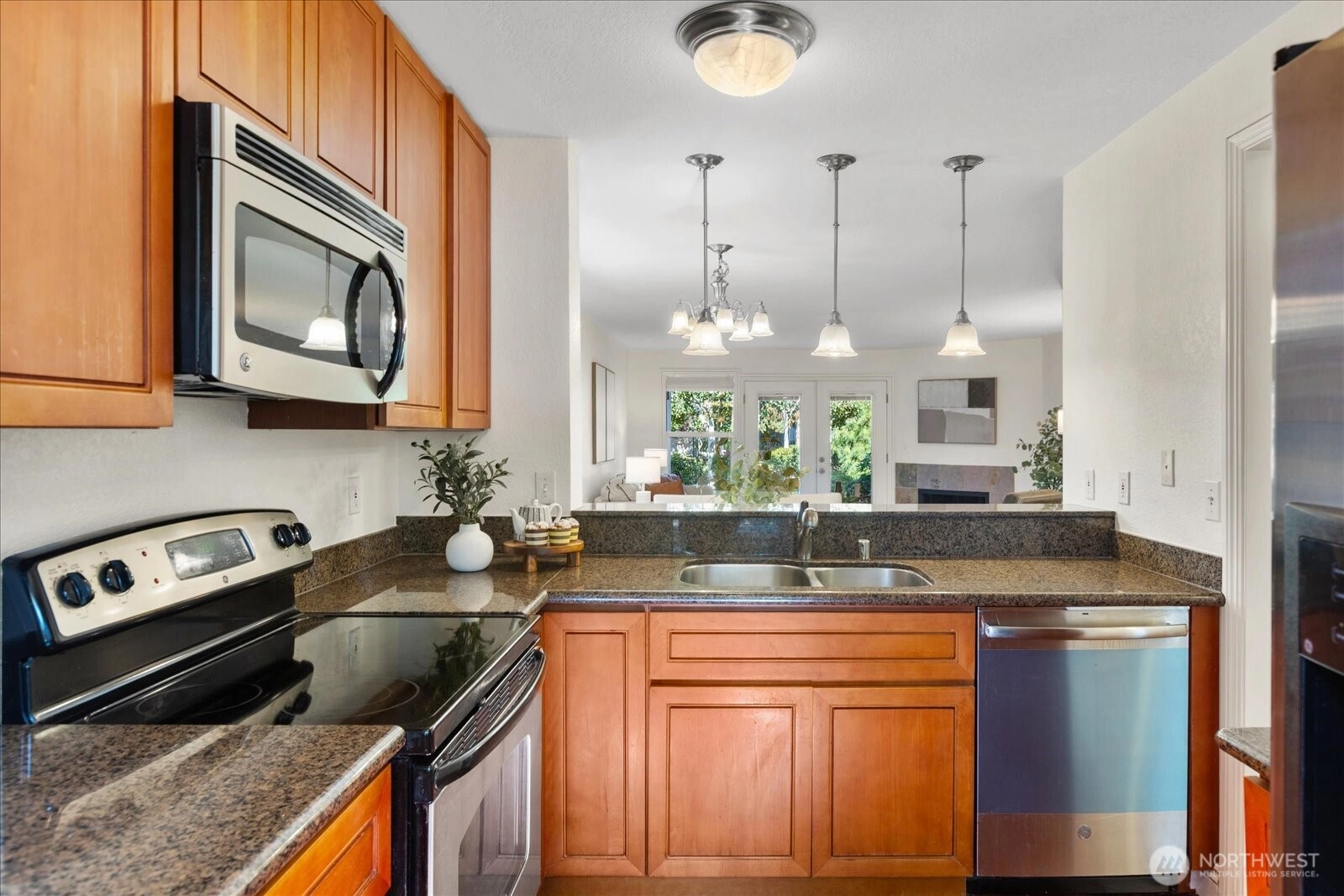 Conveniently located and affordably priced this freshly updated condo is ideal for first time buyers, downsizers (bottom floor, no step entry) or investors (no rental cap). This charming move-in ready home has hardwood floors, new carpet, and new paint. Enjoy preparing meals in your kitchen with granite counter tops, solid wood cabinets and stainless appliances. Living area spills out French doors to patio overlooking courtyard. Primary bedroom comes with ensuite and extra large closet. 2 dedicated parking spaces are close by in this well maintained gated community. Across from Walter Hall Park/Golf Course, easy commute to Boeing, Paine Field Airport, Freeway, shopping and dining. Low HOA dues, pet friendly. Make Memories Here!