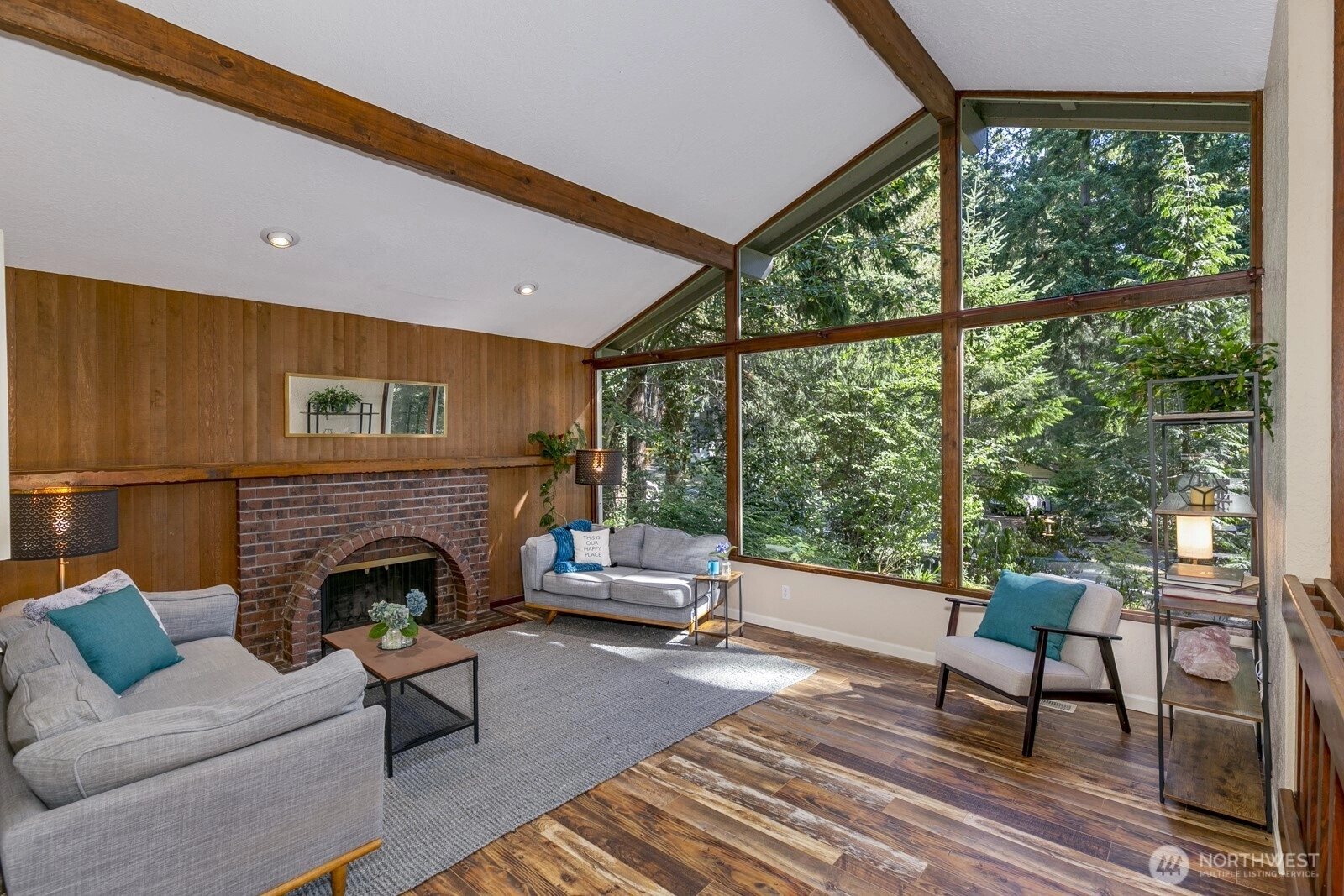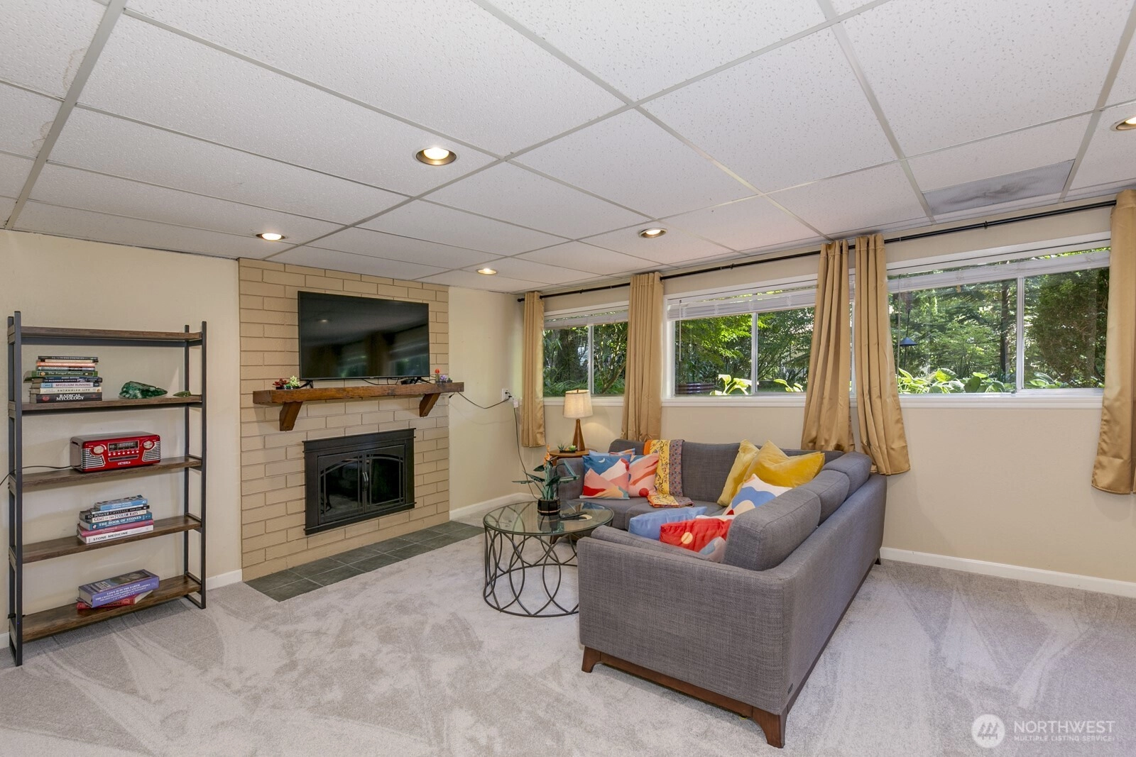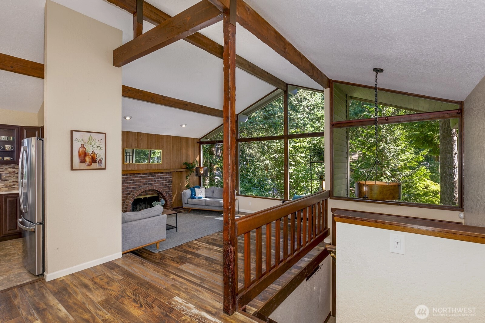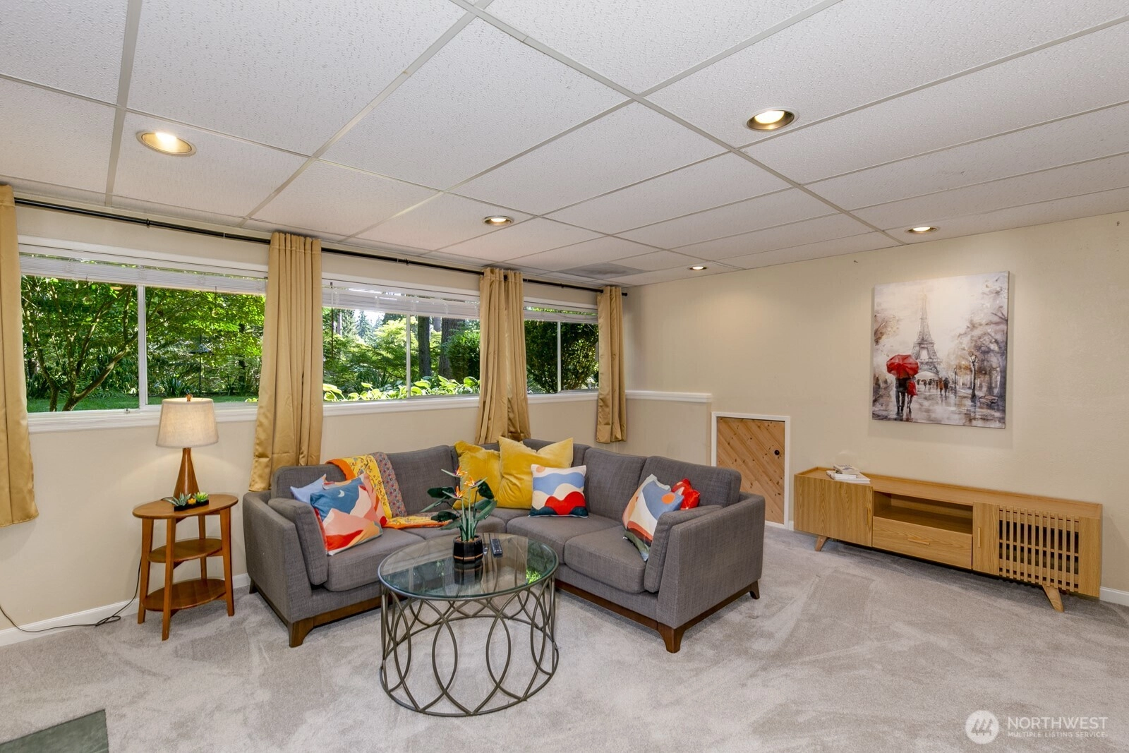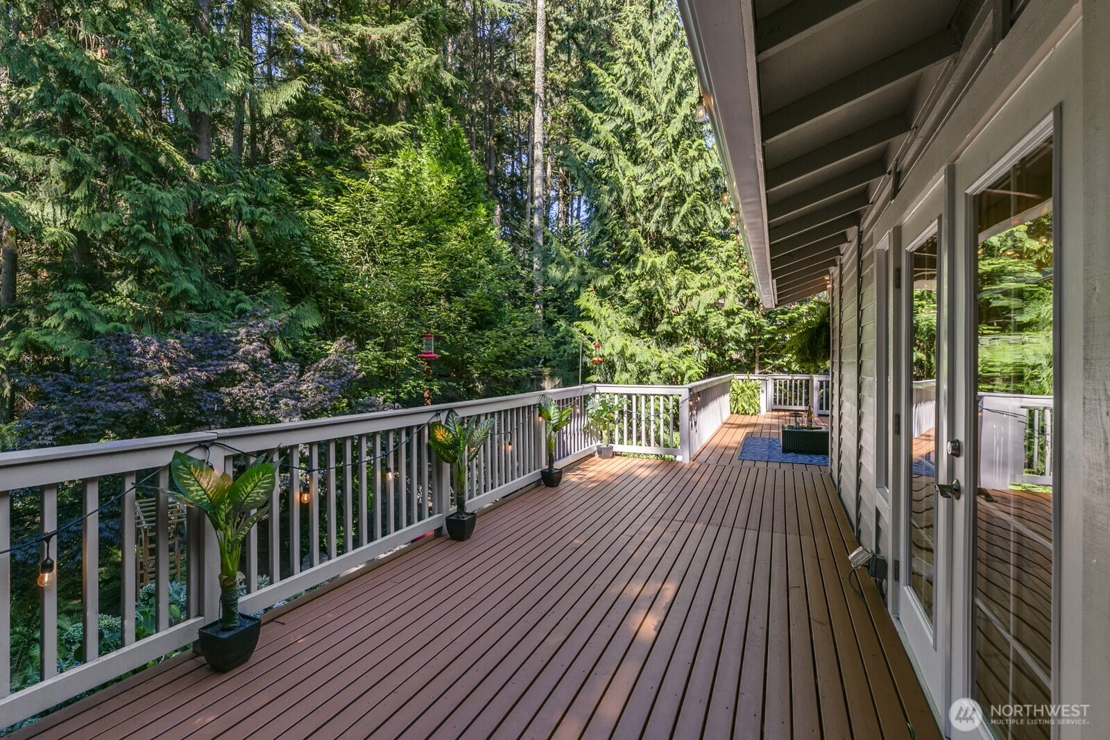 Welcome to this wonderful home in highly desirable Picnic Point. Nature lovers rejoice in this home set amongst the trees, backing to a green belt. Huge floor to ceiling windows & warm interior tones blend with the setting. Multiple French doors open to a full length back deck, outdoor entertainers come hither for the outdoor living space & hardscape complete with bar, TV & firepit. Meanwhile inside, this home features updated kitchen open to living room w/vaulted ceilings and plenty of windows. Downstairs has an awesome rec room & 4th bedroom/office. Neighborhood is highly walkable w/nature trails & arguably the best school in the district. No HOA. 5 mins to beautiful Picnic Point beach. EZ access to shopping centers and commuter lanes.