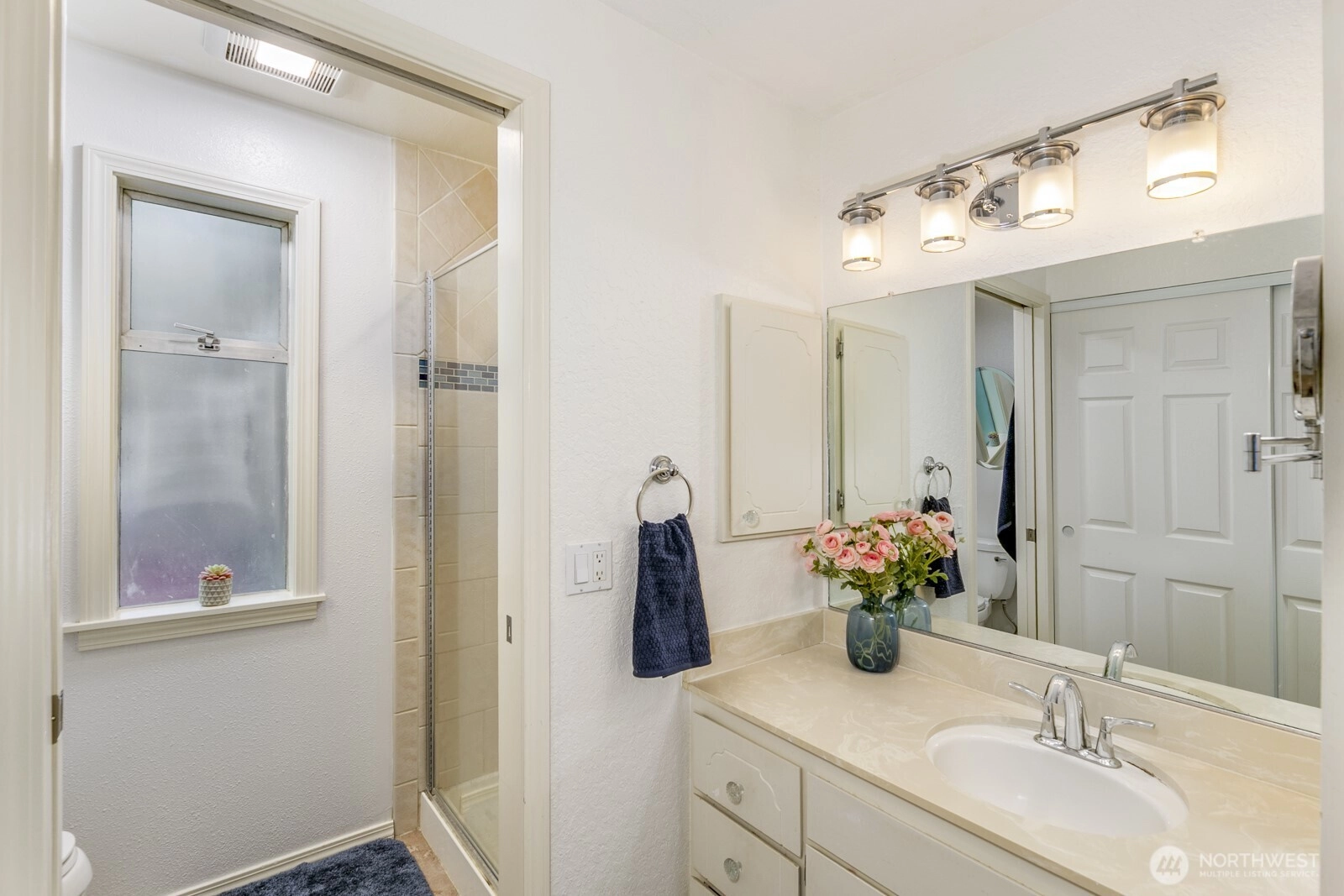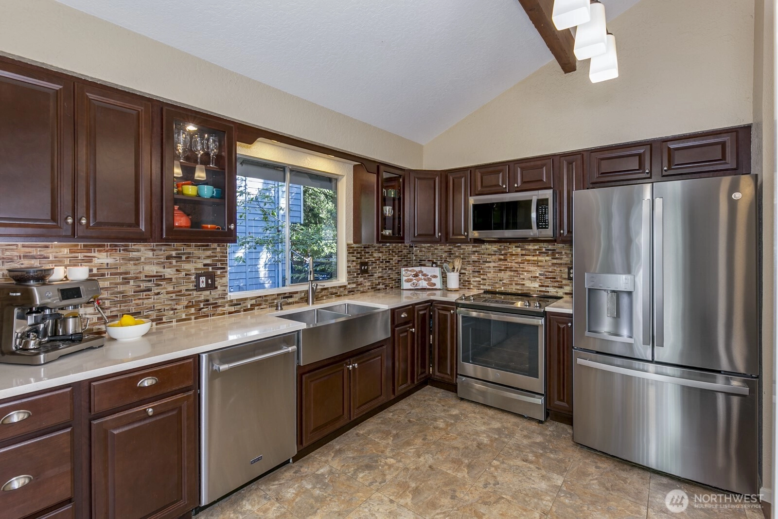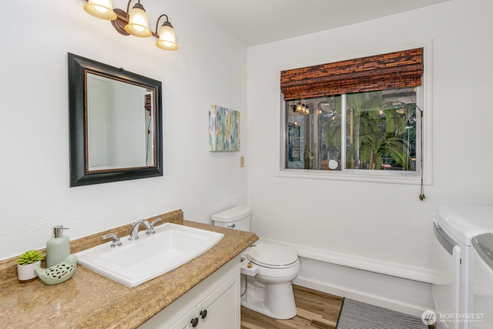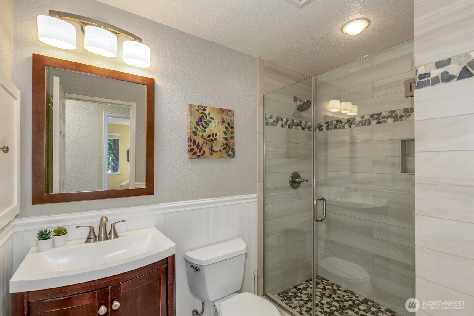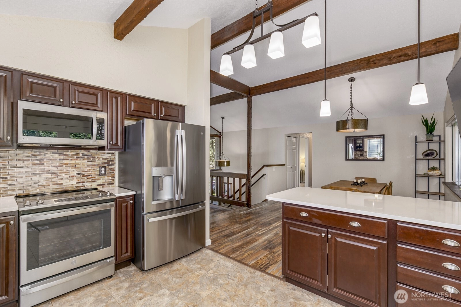 Welcome to this wonderful home in highly desirable Picnic Point. Nature lovers rejoice in this home set amongst the trees, backing to a green belt. Huge floor to ceiling windows & warm interior tones blend with the setting. Multiple French doors open to a full length back deck, outdoor entertainers come hither for the outdoor living space & hardscape complete with bar, TV & firepit. Meanwhile inside, this home features updated kitchen open to living room w/vaulted ceilings and plenty of windows. Downstairs has an awesome rec room & 4th bedroom/office. Neighborhood is highly walkable w/nature trails & arguably the best school in the district. No HOA. 5 mins to beautiful Picnic Point beach. EZ access to shopping centers and commuter lanes.