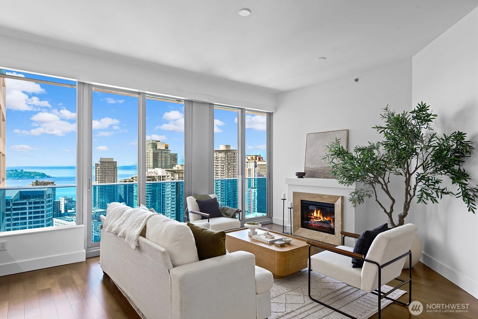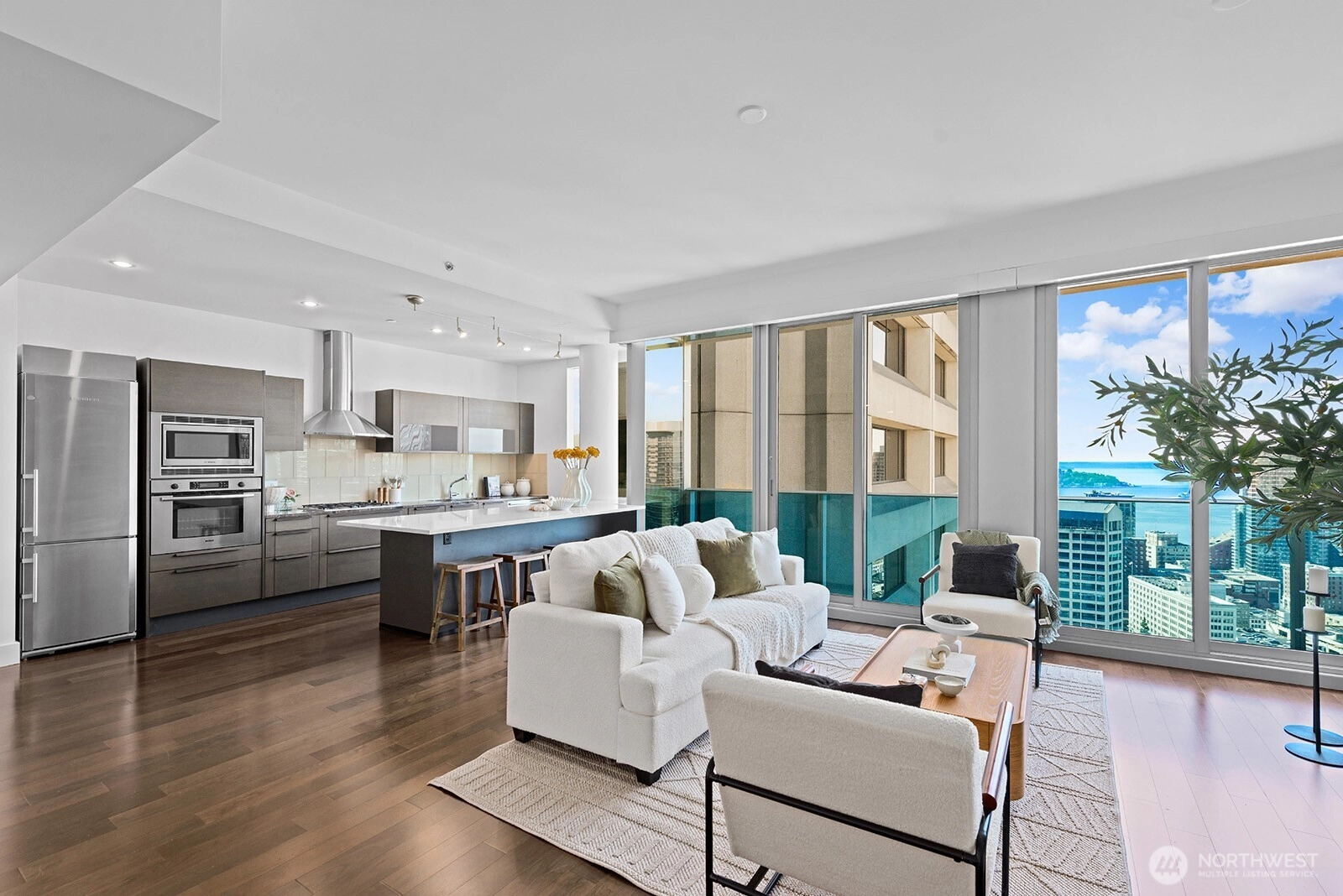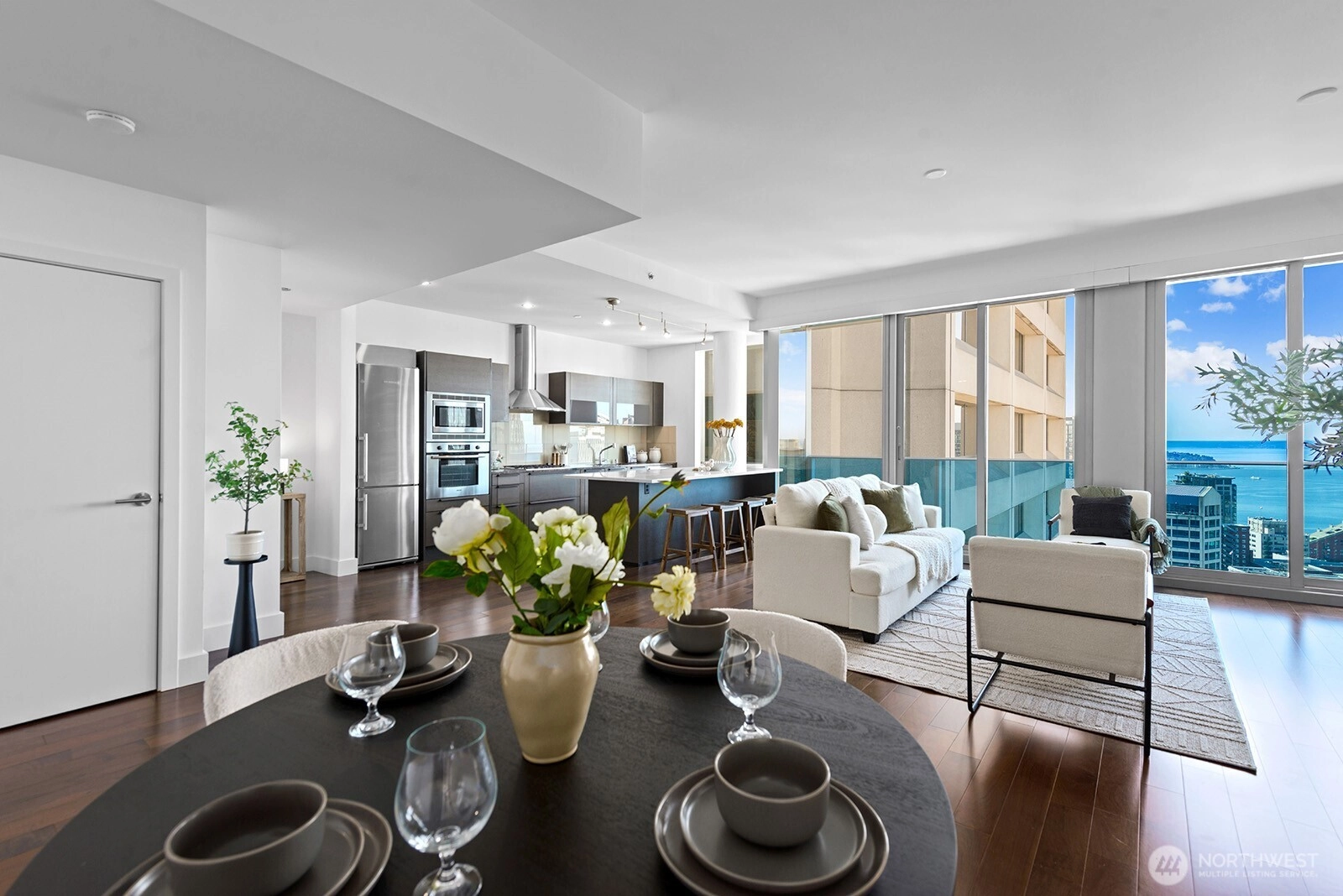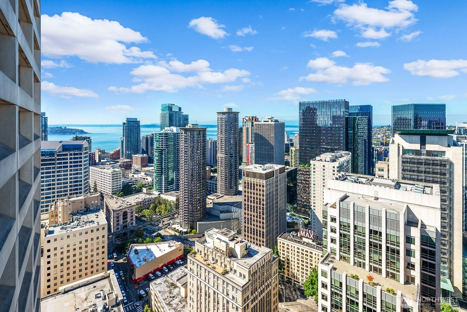 Luxury Seattle condo living at its finest. Rare, custom-designed 35th-floor residence above the Hyatt with sweeping views of Puget Sound, Olympic Mountains & city sunsets. This 1 bedroom + flex room, 2 bath home features an open floor plan, sleek chef’s kitchen, dining area & private terrace perfect for entertaining. Primary suite offers a spa-inspired marble bath & custom closet system. Includes 2 secure parking spaces (1 EV-Charger), 2 storage units & access to premium high-rise amenities. Steps to Pike Place Market, fine dining, shops, theaters & light rail—experience the best of downtown Seattle luxury living.