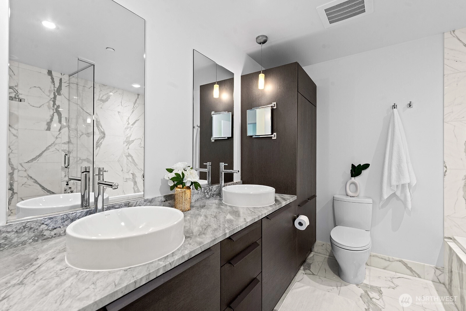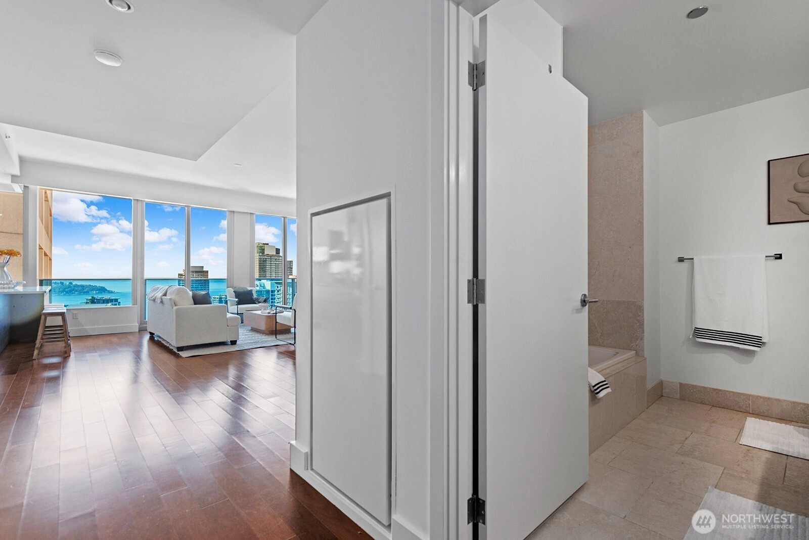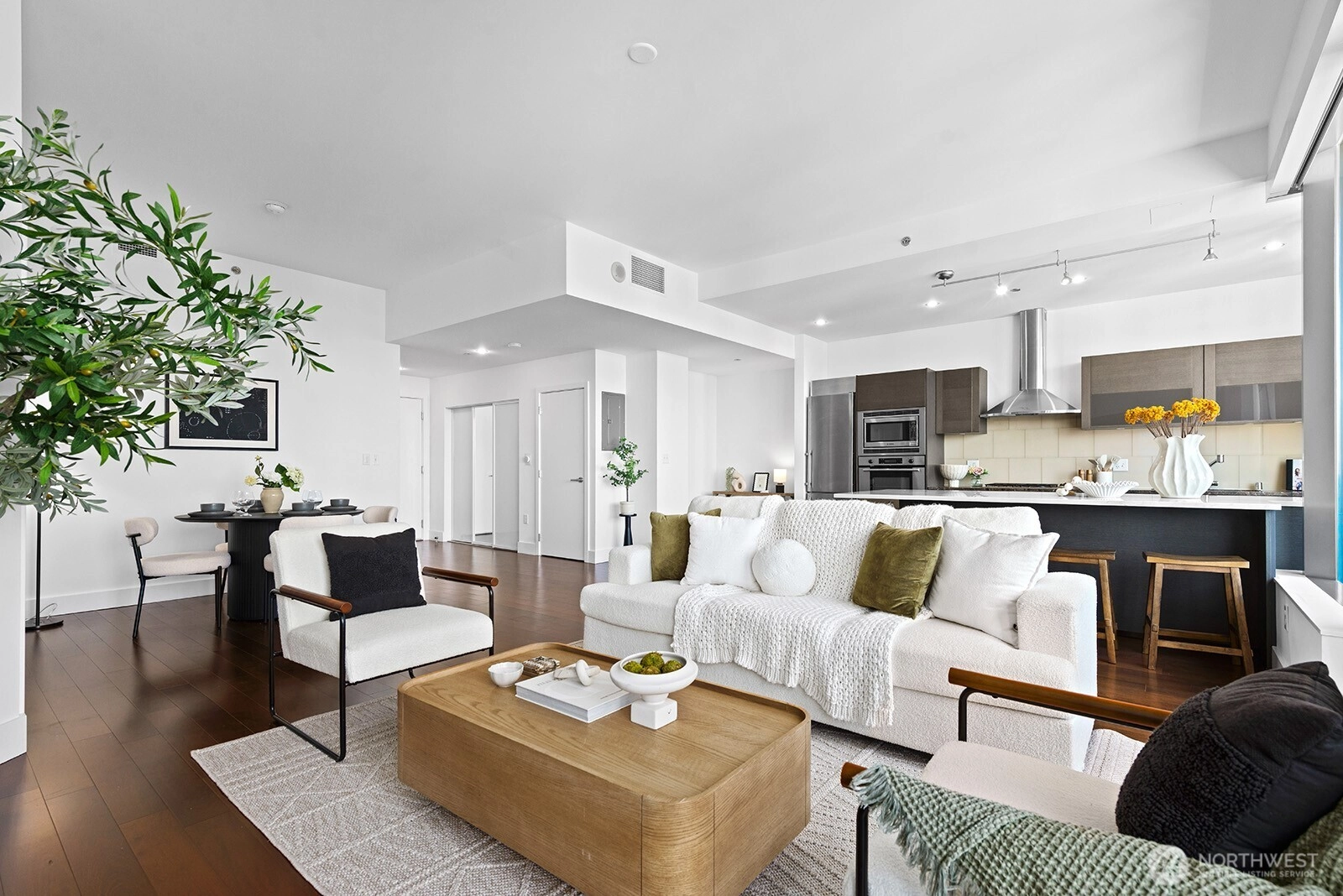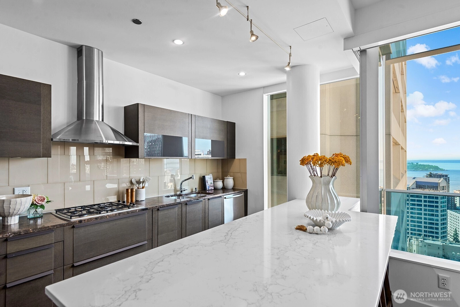 Luxury Seattle condo living at its finest. Rare, custom-designed 35th-floor residence above the Hyatt with sweeping views of Puget Sound, Olympic Mountains & city sunsets. This 1 bedroom + flex room, 2 bath home features an open floor plan, sleek chef’s kitchen, dining area & private terrace perfect for entertaining. Primary suite offers a spa-inspired marble bath & custom closet system. Includes 2 secure parking spaces (1 EV-Charger), 2 storage units & access to premium high-rise amenities. Steps to Pike Place Market, fine dining, shops, theaters & light rail—experience the best of downtown Seattle luxury living.