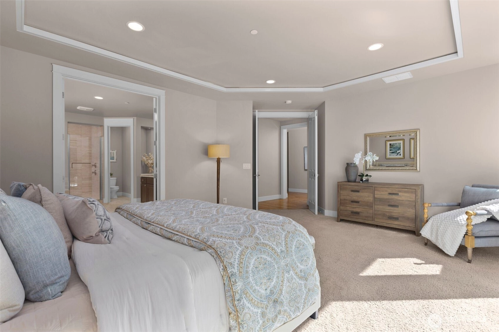 Amid the gated estate neighborhood of Aldarra Ridge, this 2014 Murray Franklyn home rests on nearly 3 acres, embraced by 200+ acres of protected woodlands. Sun-dappled lawns stretch wide, a sanctuary of calm, graced by visiting deer moving gently through the stillness. The enduring Northwest craftsman design offers honey-hued hardwoods, lofty ceilings and crisp millwork. Two-story windows flood the great room with light, where wood and stone radiate warmth. The main-floor primary suite is a serene retreat with garden patio, dual closets, and spa bath. A spacious bonus room, office and oversized 4-car garage provide space for work and play. A life of quiet beauty and rare serenity, just moments from Aldarra Golf Club, Redmond, and Sammamish.