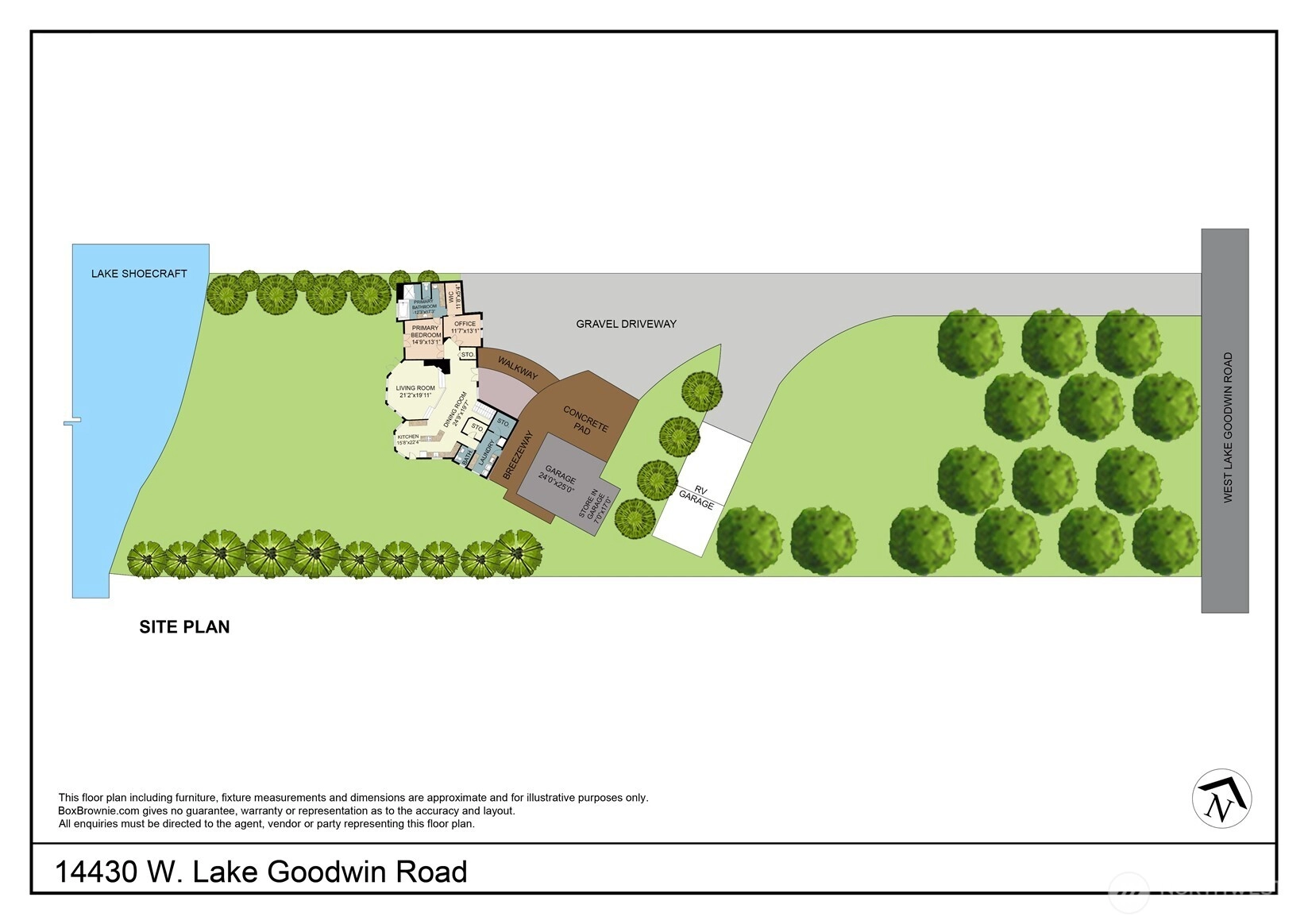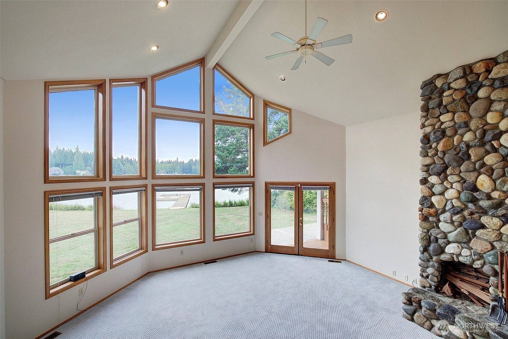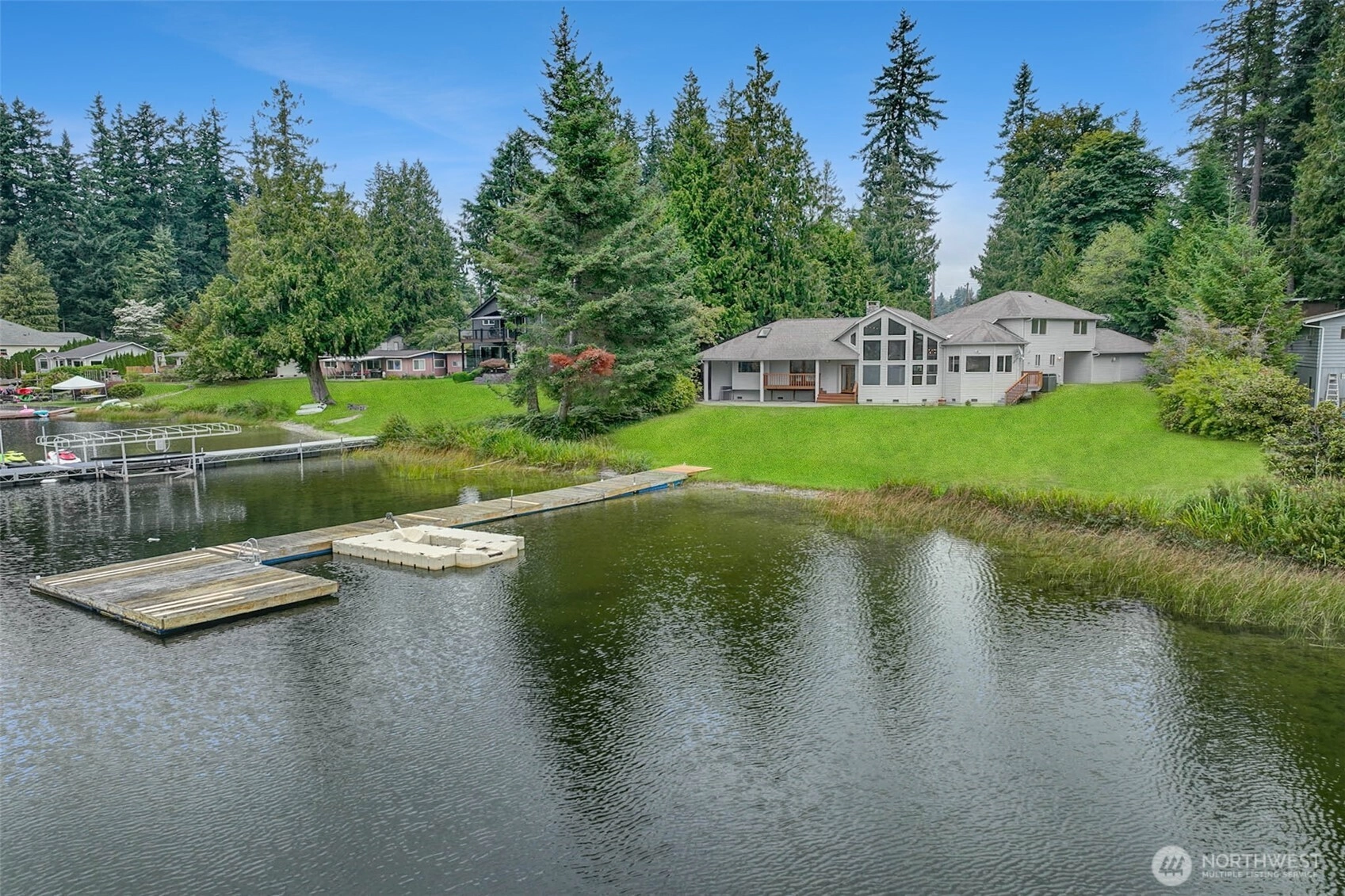 Presenting a rare opportunity to own prime real estate on the private and highly desirable Lake Shoecraft. Enjoy a sprawling 1.2-acre retreat with ~126’ of low-bank waterfront, providing direct access to an array of fresh-water fun; boating, water skiing, tubing, kayaking, swimming, fishing, and jet skiing—all from your own dock. This thoughtfully designed home features an open-concept oriented southwest for breathtaking sunset views. The spacious main living area includes a vaulted ceiling and a river rock wood-burning fireplace for a warm, inviting atmosphere. The split floor plan provides a private primary suite, ensuring comfort and privacy. 2-car garage + a separate, custom RV garage deliver storage for recreational gear and vehicles.